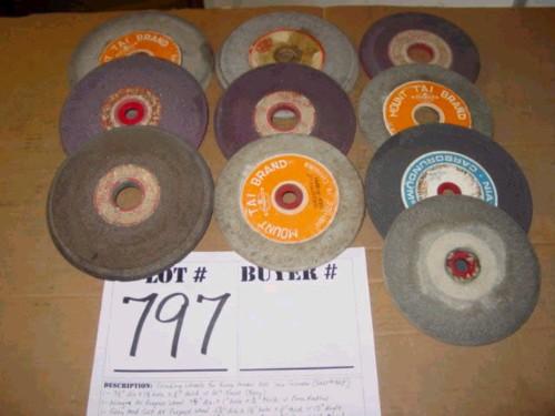 1 - 7 1/2" dia. X 1 1/4"hole x 1/2" thick w/ 60 degree Bevel (Foley) 1- Niagra All Purpose Wheel 7 5/8" dia. X 1" hole x 3/16" thick w/ form Radius 1 - Foley Med Grit All Purpose Wheel 6 7/16" dia. X 1 1/4" hole x 1/4" thick w/ 15 degree Angle 1 - Foley med Grit All Purpose Wheel 6 3/4" dia. x 1 1/4" hole x 3/8" thick w/ 60 degree Bevel 1- mount TA. Brand 6 11/16" dia. x 1 1/4" hole x 3/4" thick - coursegrind w/ 60 degree Bevel 1 - mount TA. Brand 7 3/4" dia. x 1 1/4" hole x 7/16" thick - 12 degree Bevel 1 - Mount TA. Brand 6 3/4" dia. x 1 1/4" hole x 1/4" thick - Course w/ 30 degree Bevel 1 - saipa Brand 30A 46K - 7 5/8" dia. x 5/8" hole x 1/2" thick 60 degree Bevel Course 1 - Foley Course 6 3/4"dia. x 5/8" hole x 1/4" w/ 1/8" radius 1 - Foley Very Course 7 1/4" dia. x 5/8" hole x 1/2" thick 60 degree Bevel w 3 degree reverse bevel