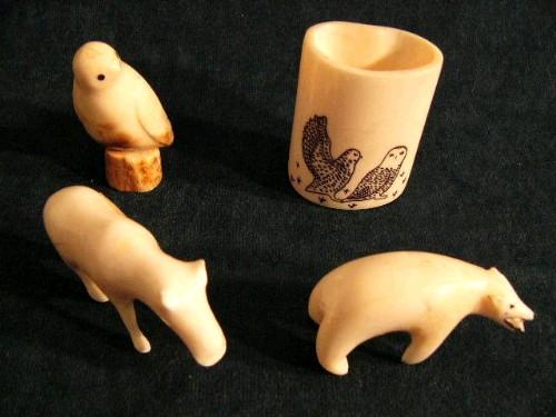 Group of carvings: Bird, Bear, Moose and Scrimshawed toothpick holder by E. tiulana each 2 1/2" (37)