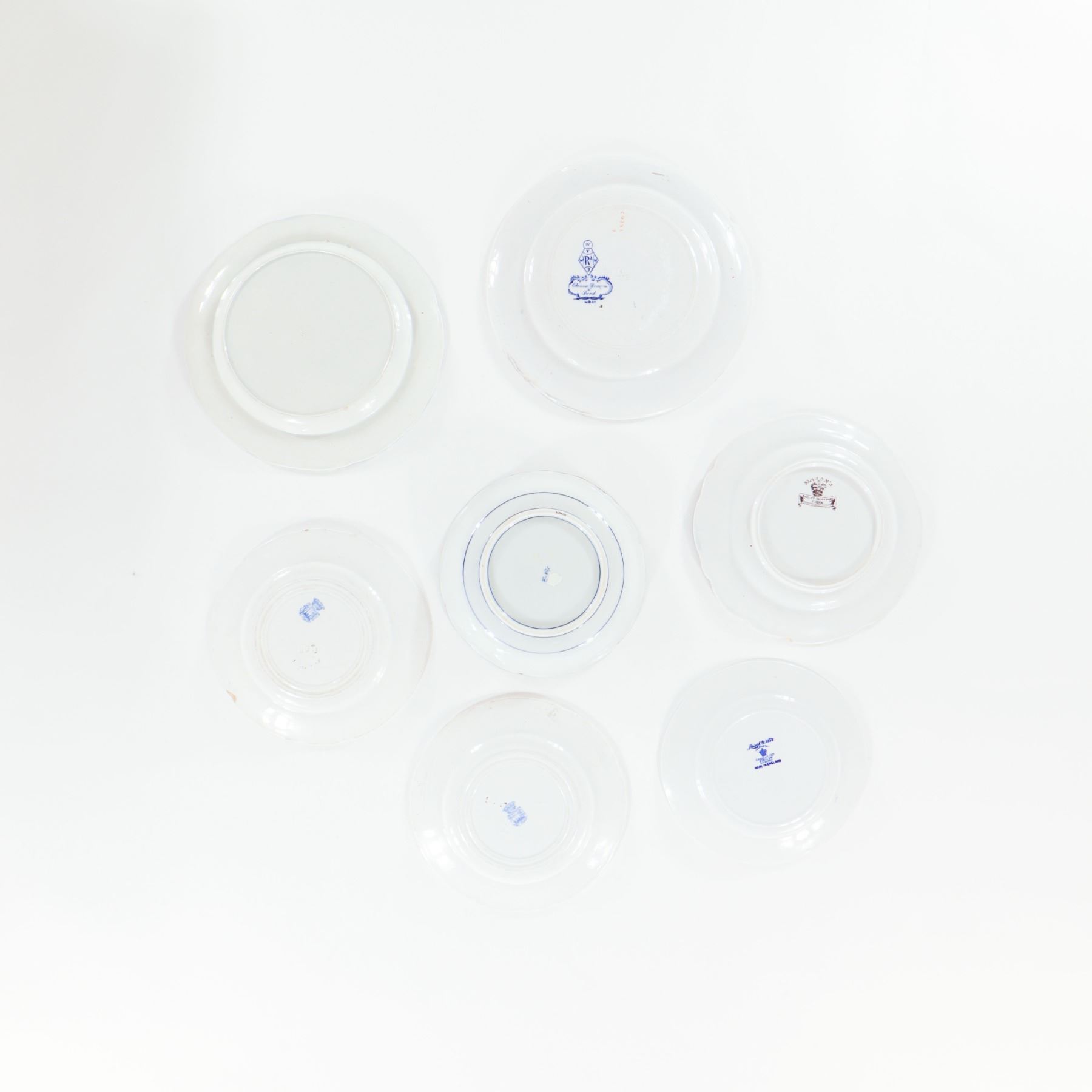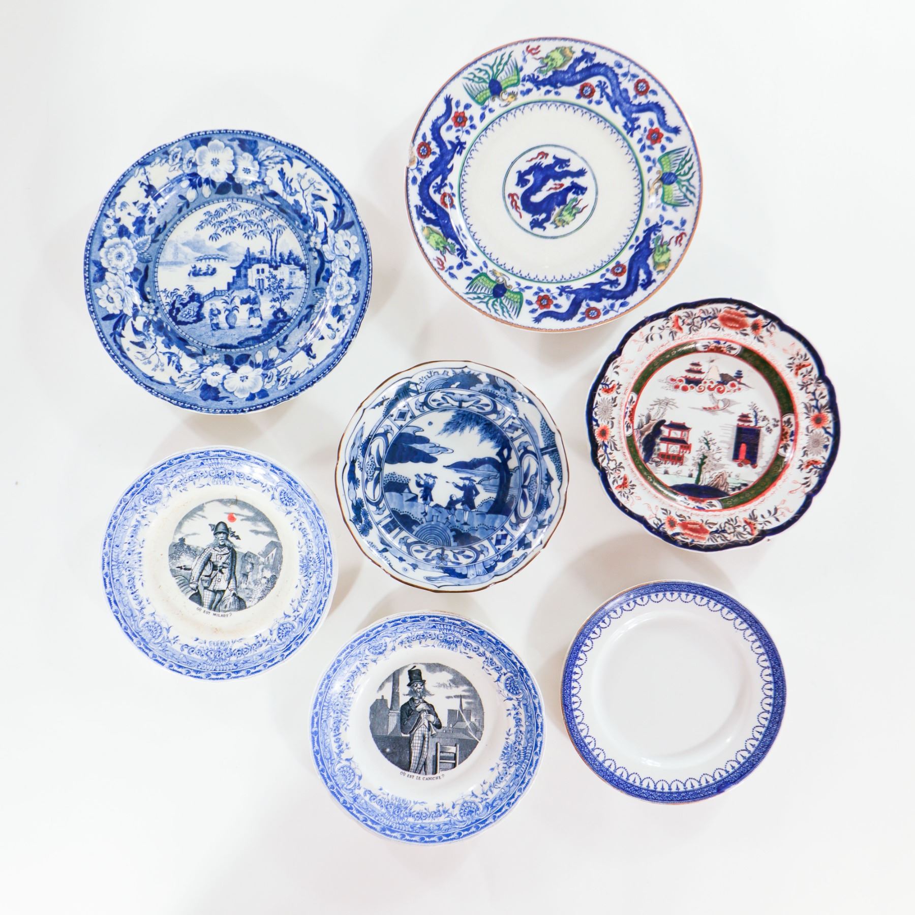 Assorted group of seven transfer-printed earthenware plates and bowls comprising: a large blue transfer plate with rural river landscape and floral border; a polychrome plate in an Imari/dragon style palette of blue, green and iron-red with central roundel and scrolling border; a scalloped plate with chinoiserie buildings and trees in red, blue and green; a deep blue transfer bowl with romantic landscape and figures in a boat; two small portrait plates with central half-length figures within printed cartouches and broad floral borders; and a small plate with simple blue scalloped border on a white ground. Most pieces are printed underglaze on cream/white earthenware bodies; several with molded or scalloped rims. Backstamps on the reverse include various printed crests and cartouches, confirming production by multiple English Staffordshire and related factories, with at least one probable continental (French or German) maker among the portrait plates. Together they form a representative study group of 19th-century transferware in blue, polychrome and Imari-style palettes.