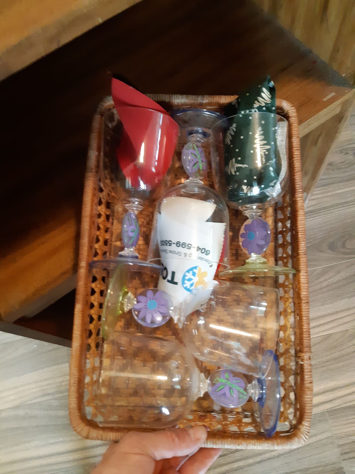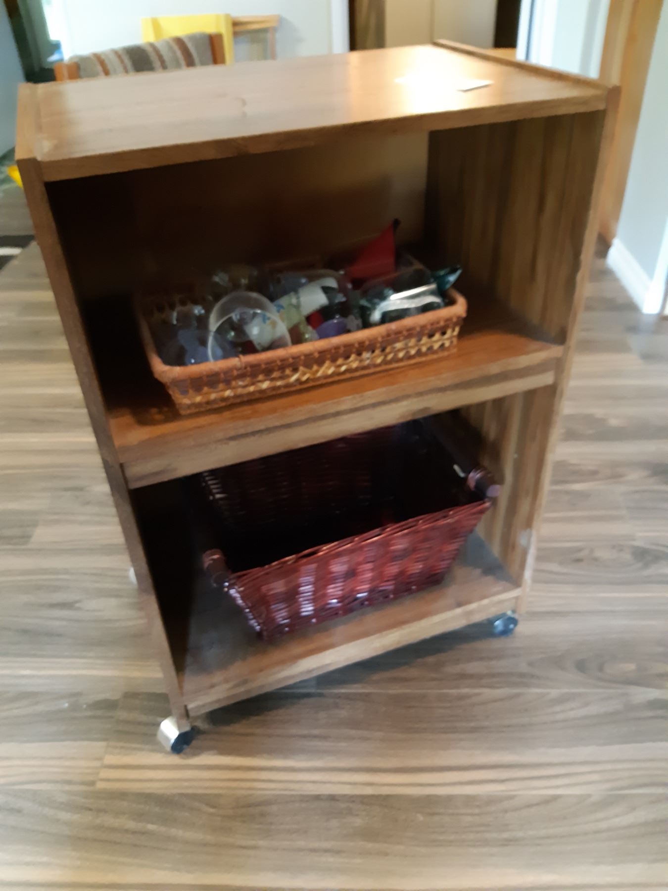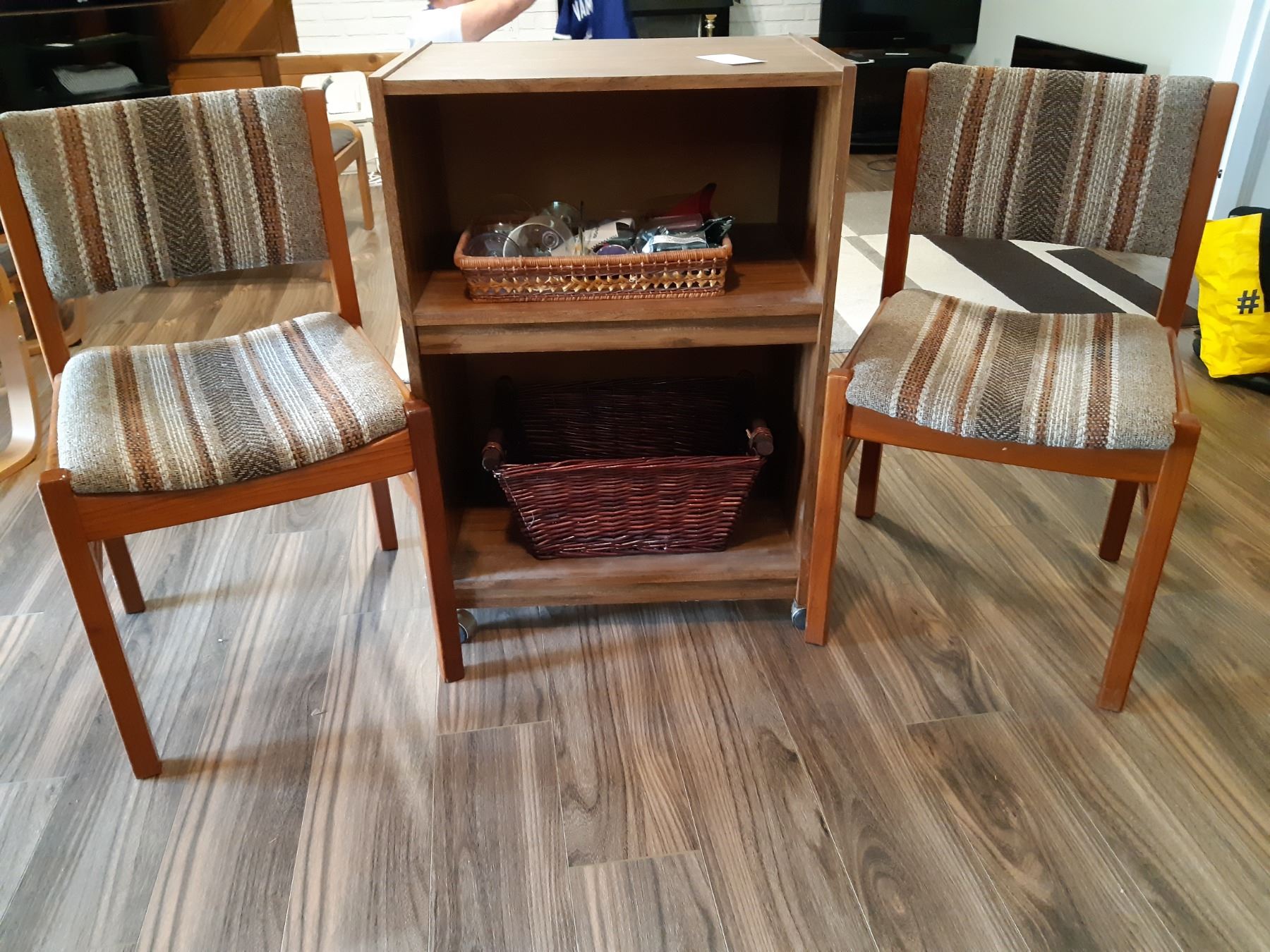 Rolling cabinet 23x16x34 note scratches, basket and plastic stemware. 2x vintage chairs with tilt backs.note scratches. Pickup at 10 am