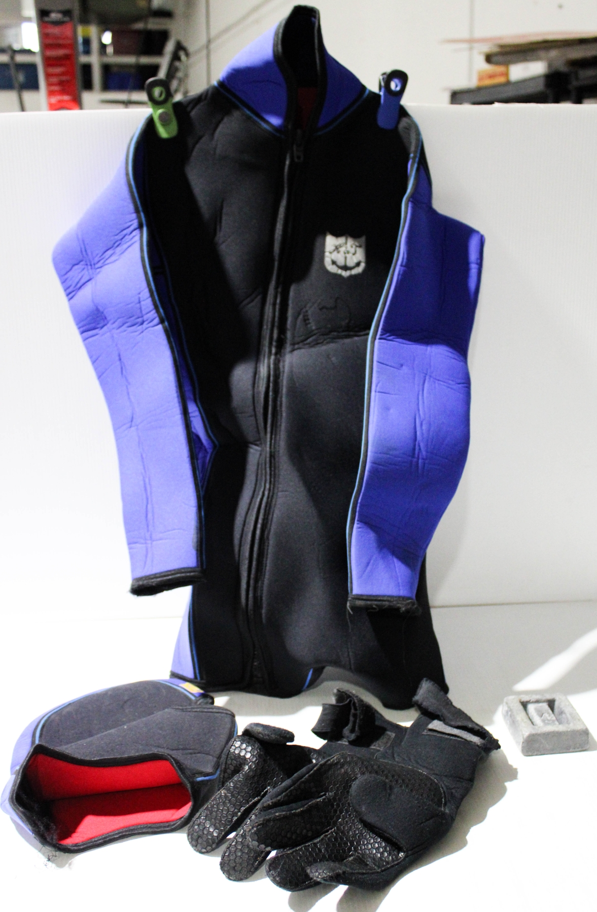 NO MARKED SIZE BUT APPROX. SIZE MEDIUM—INCLUDES WET SUIT, HOOD, GLOVES AND BELT WEIGHT