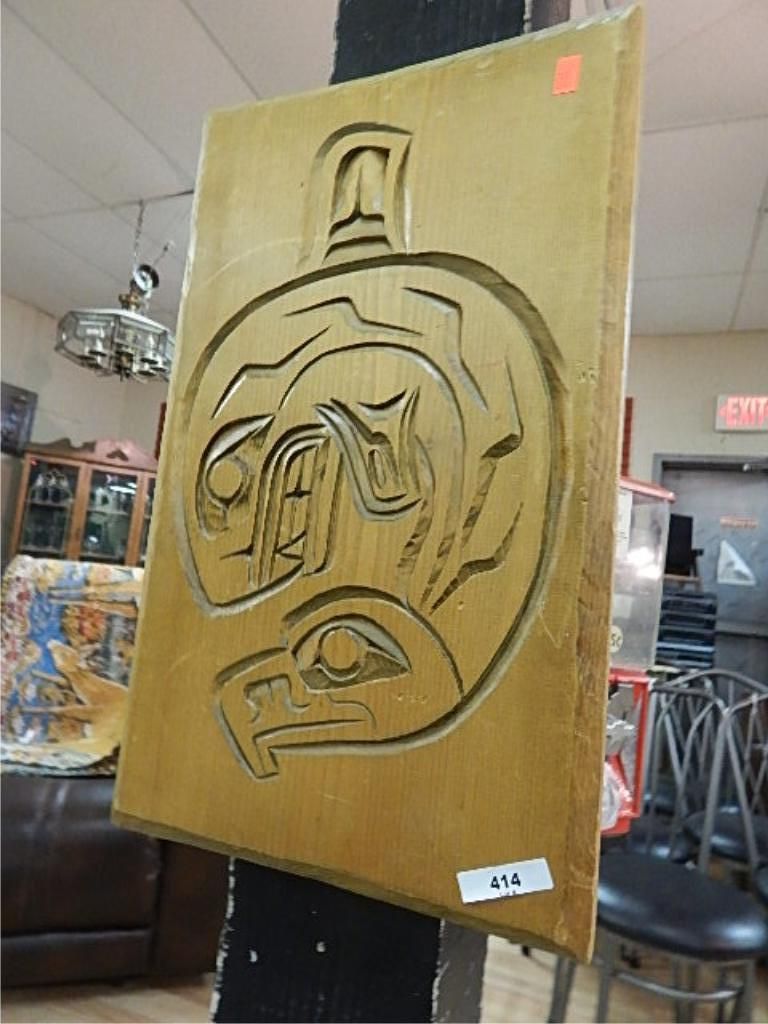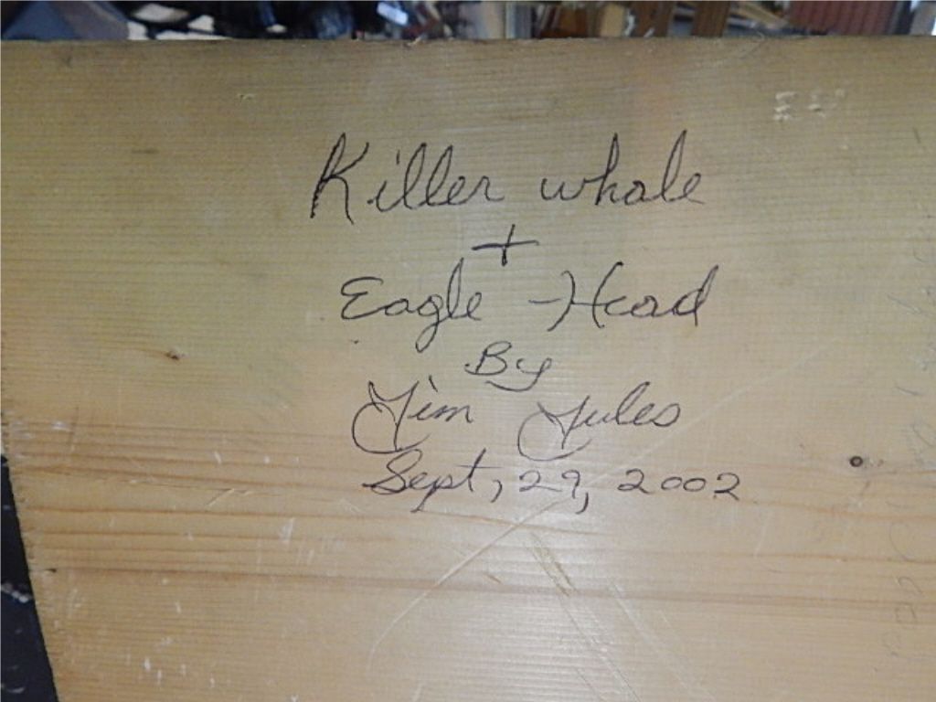 HAND CARVED NATIVE PLAQUE -ORIGINAL CARVING "KILLER WHALE AND EAGLES HEAD" - BY JIM JULES - ONE OF HIS EARLY WORKS - SEPT. 27, 2002