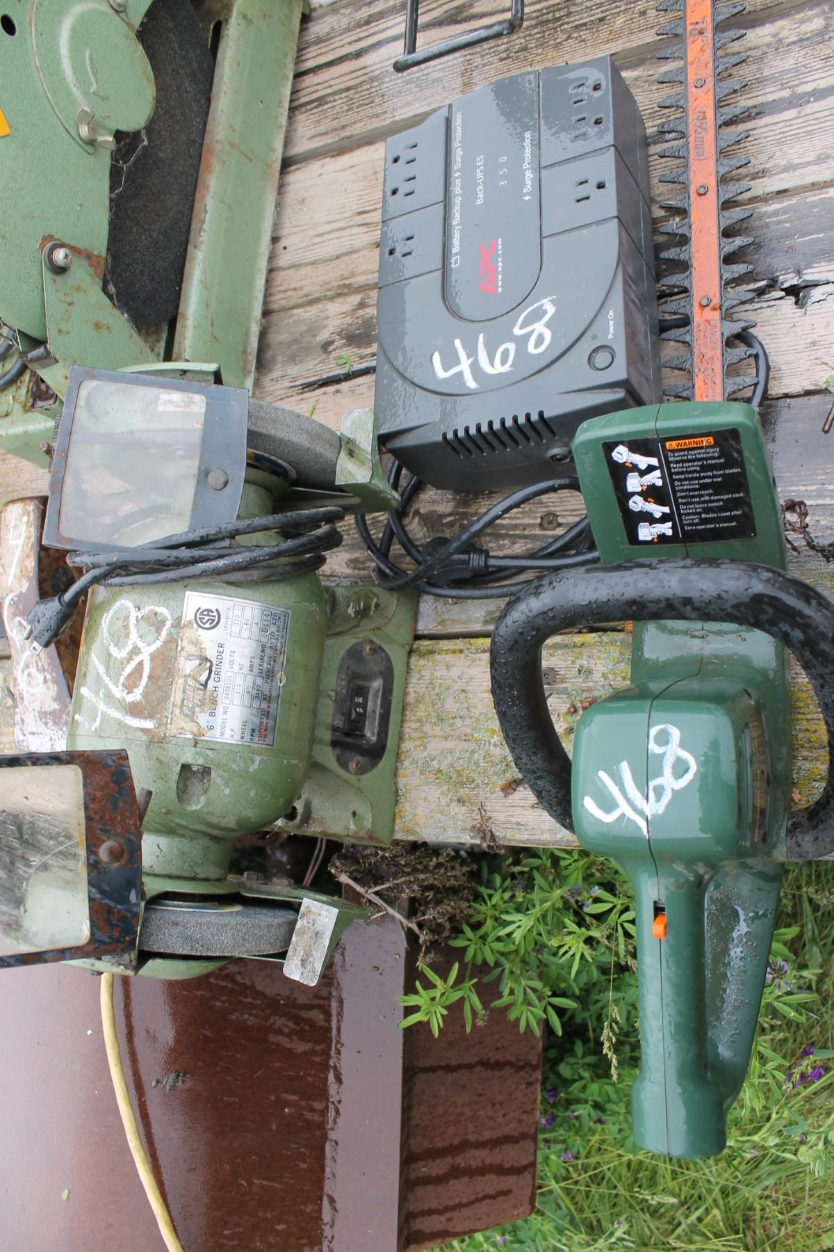 HEDGE TRIMMER, BENCH GRINDER, BATTERY BACK-UP