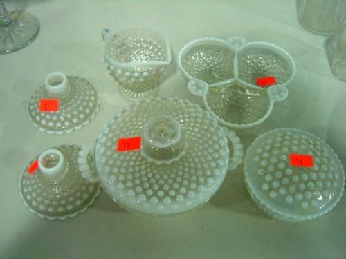 8 PIECES OF HOBNAIL, 3 CANDLE STICKS, 3 COVERED DRESSER DISHES, CREAMER, 3-SECTION DIVIDED DISH