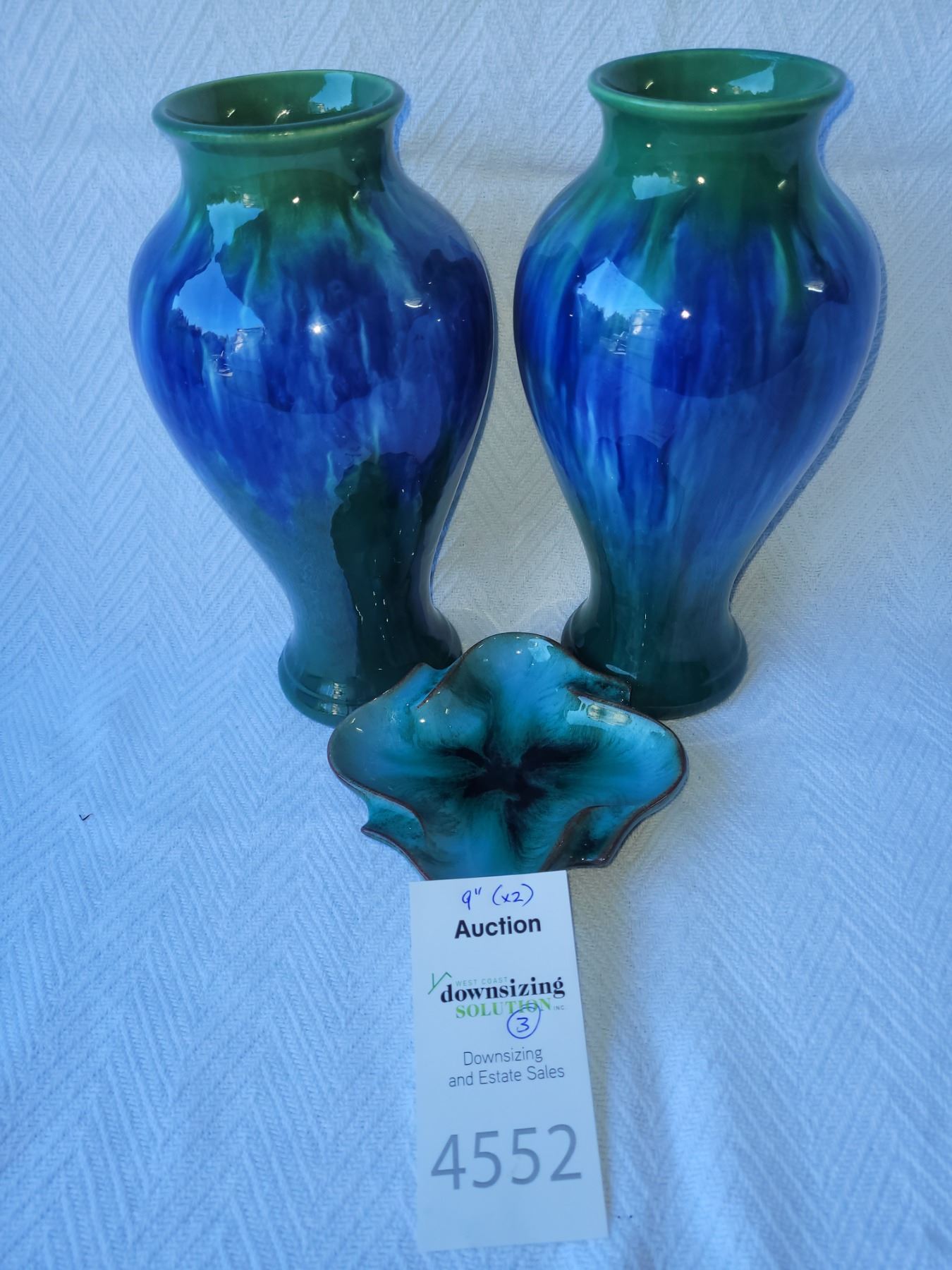 2 x 9" Haeger vases and Blue Mountain Pottery ashtray. Pickup at 9 am