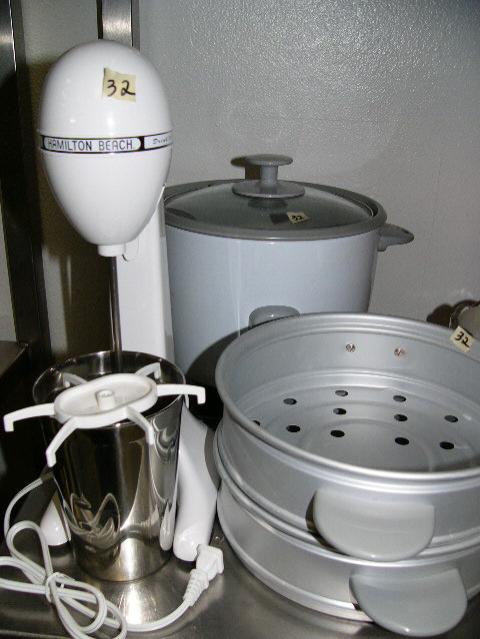 Hamilton Beach milk shake maker, Rice Cooker, both look new, assorted glass ware (199)
