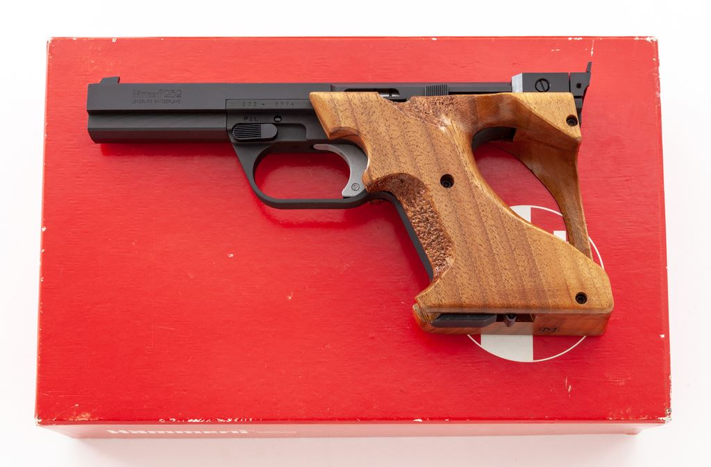 Hammerli Model 232 Semi-Automatic Target Pistol, #232-3834, .22 Short cal., matte blue finish, left-hand contoured Morini target grip, blade front sight, fully adjustable rear sight, with two (2) magazines. In original box with owner's manual, printed instructions, stickers, and small pistol cleaning rod. Right corner of the frame in front of the caliber marking with a few small casting flaws; the results look like pitting, otherwise this pistol is in excellent condition. Metal retains all of the original finish. Grips show intermittent shallow handling marks. Action and bore are both excellent. Foam box interior shows heavy deterioration; lid is split at one of the corners. Est.: $800-$1,200. (Olympic Exempt)