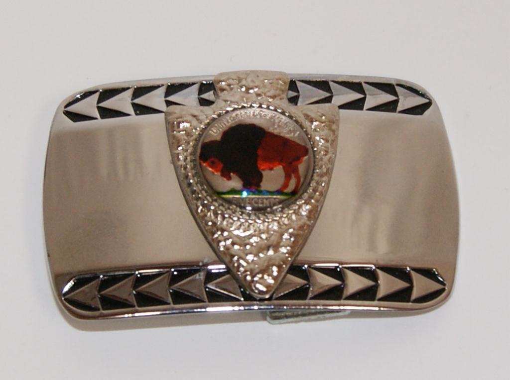 The "Red Buffalo" is an actual Buffalo Nickel, hand painted and then color hardened with heat and placed on Indian motif arrow head buckle. This is strictly made in the USA, including thenickel.