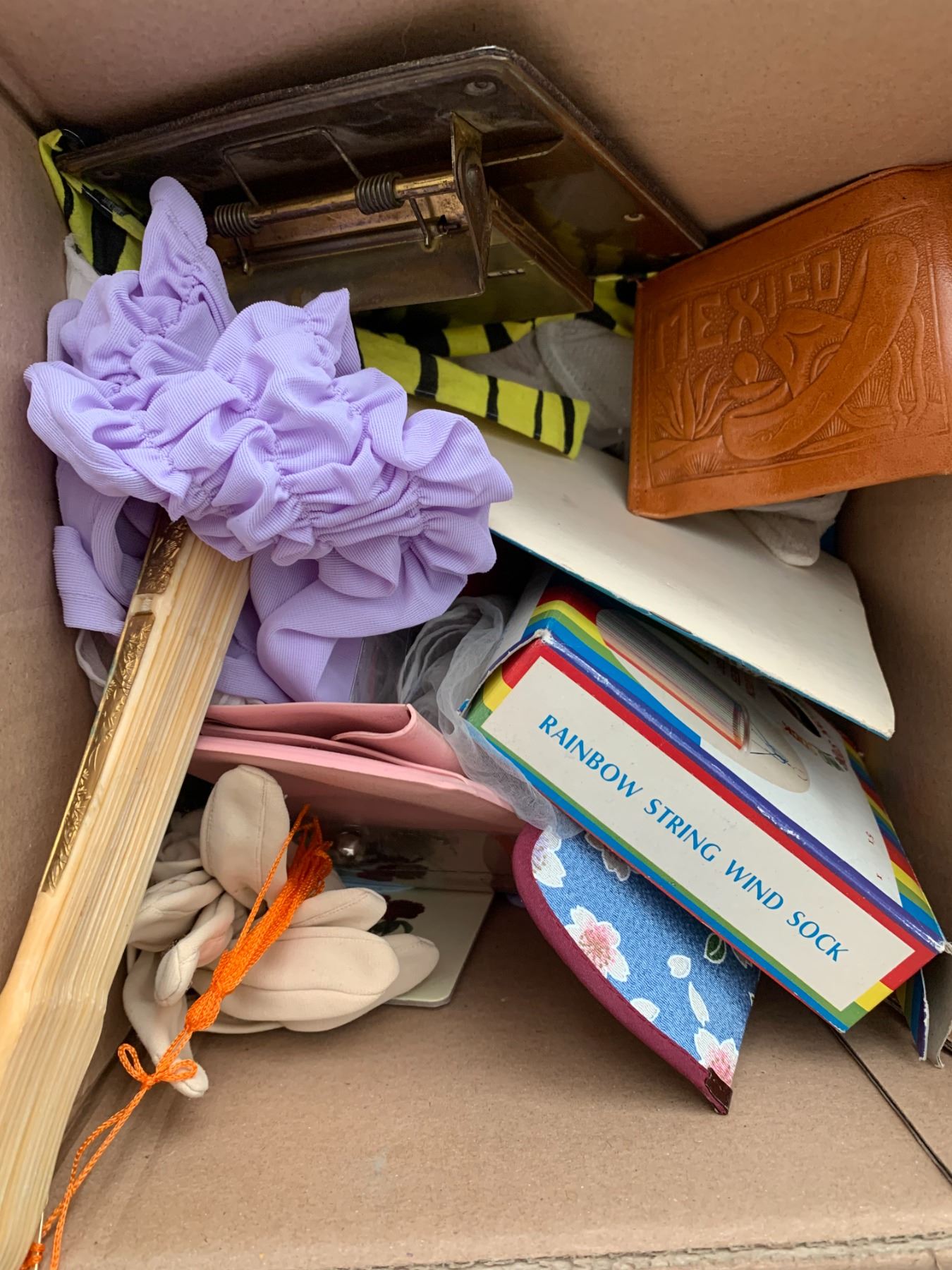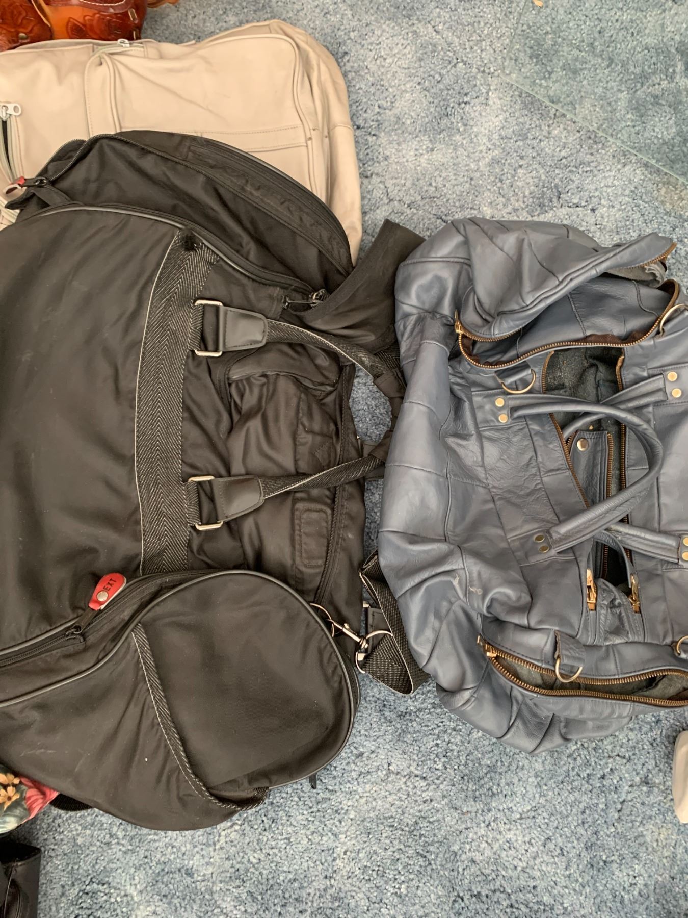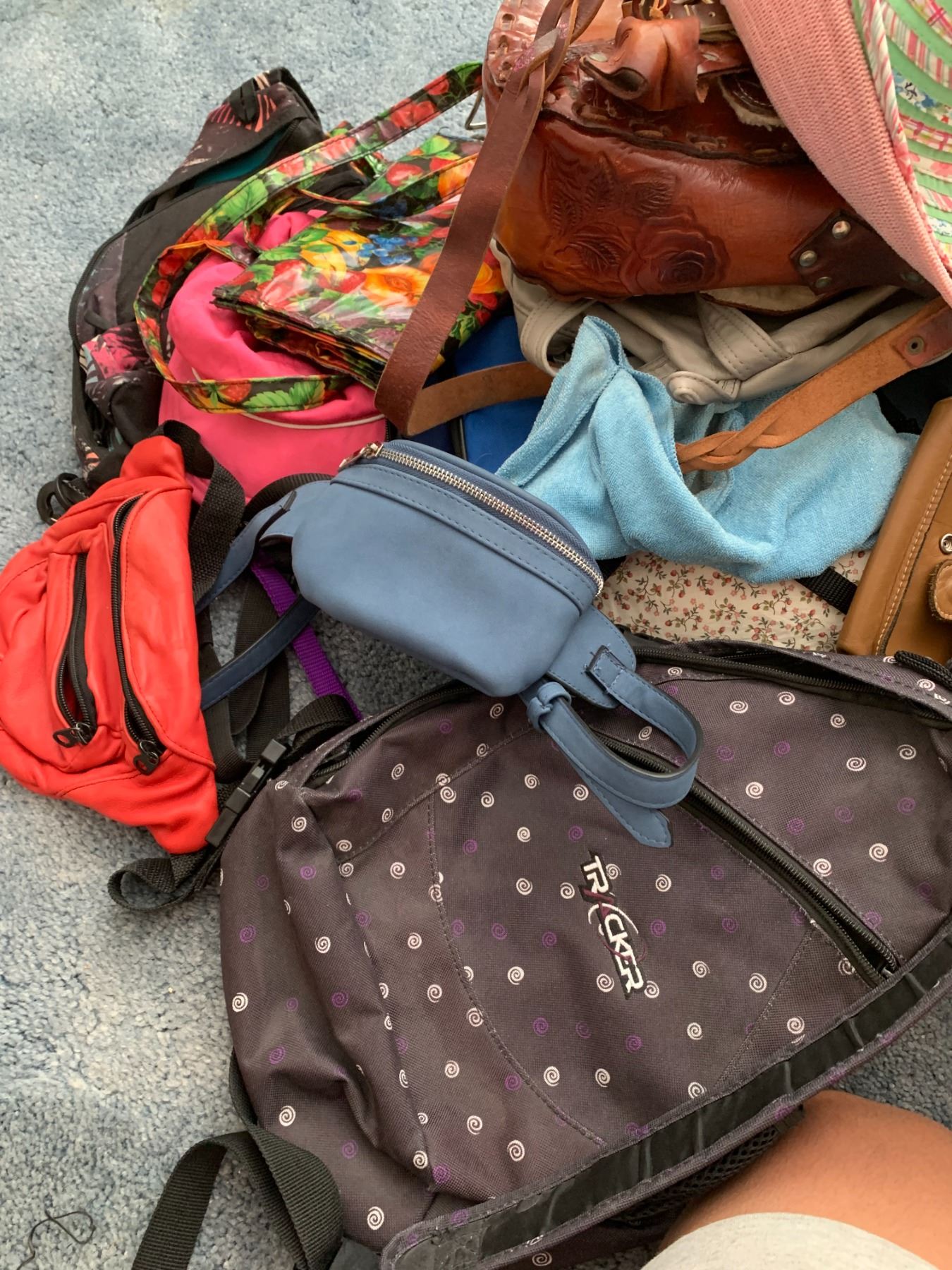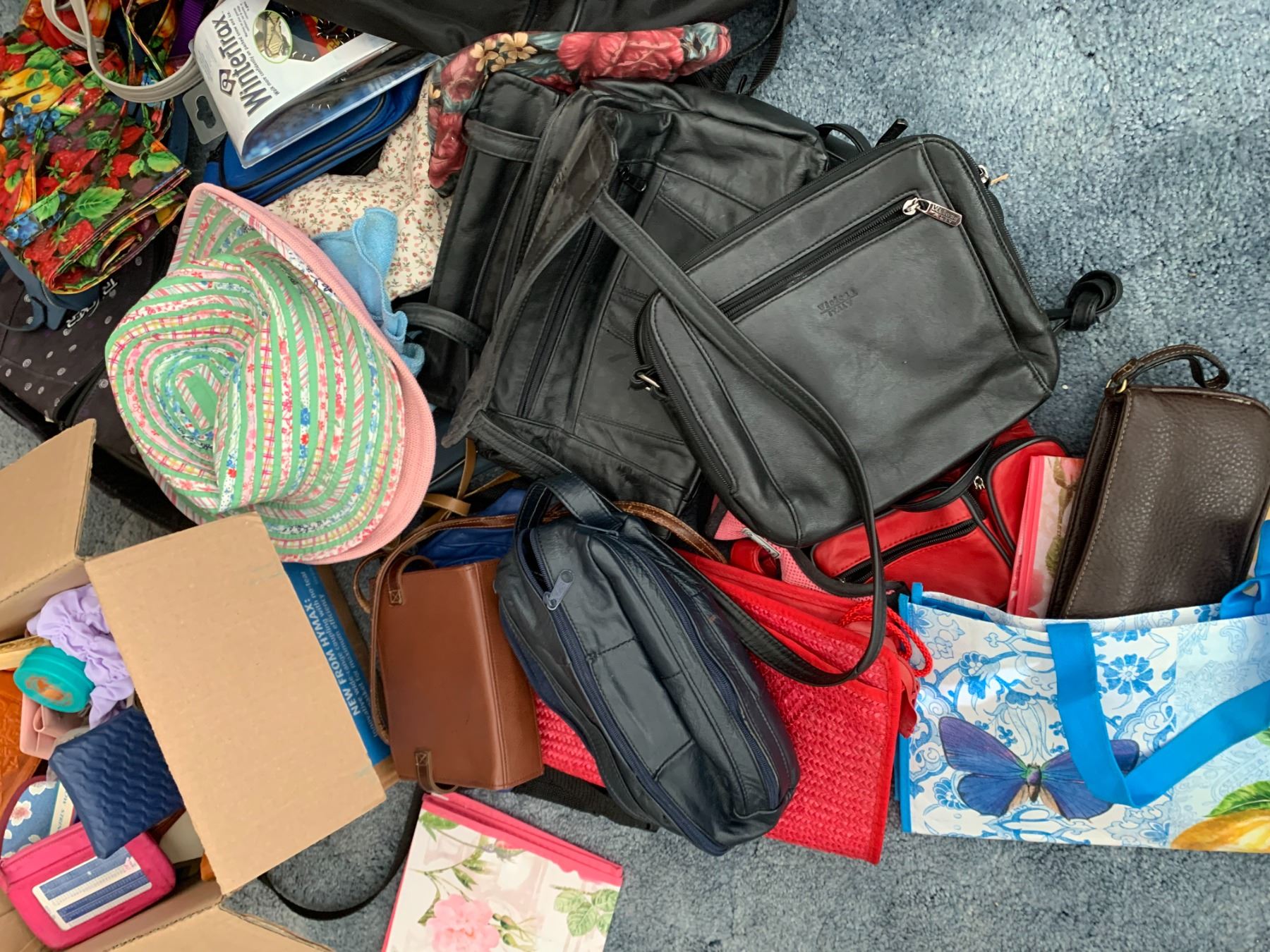 Lot includes handbags, summer hats, shopping bags, and wallets.