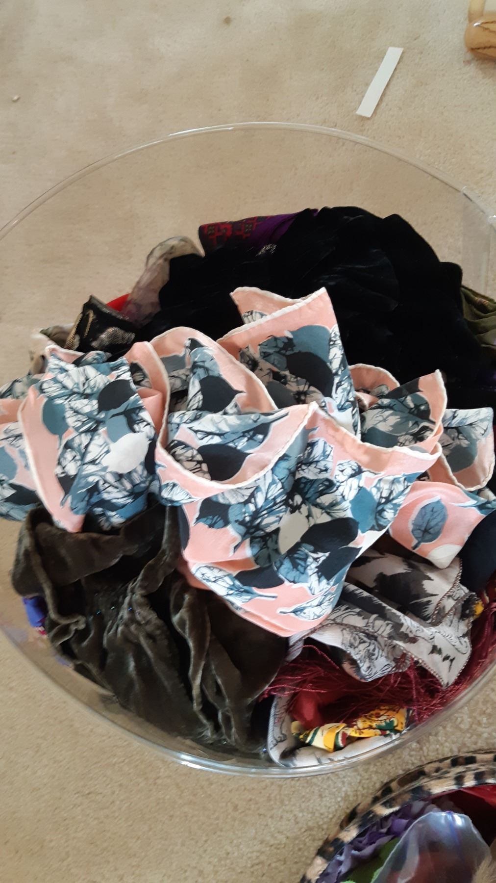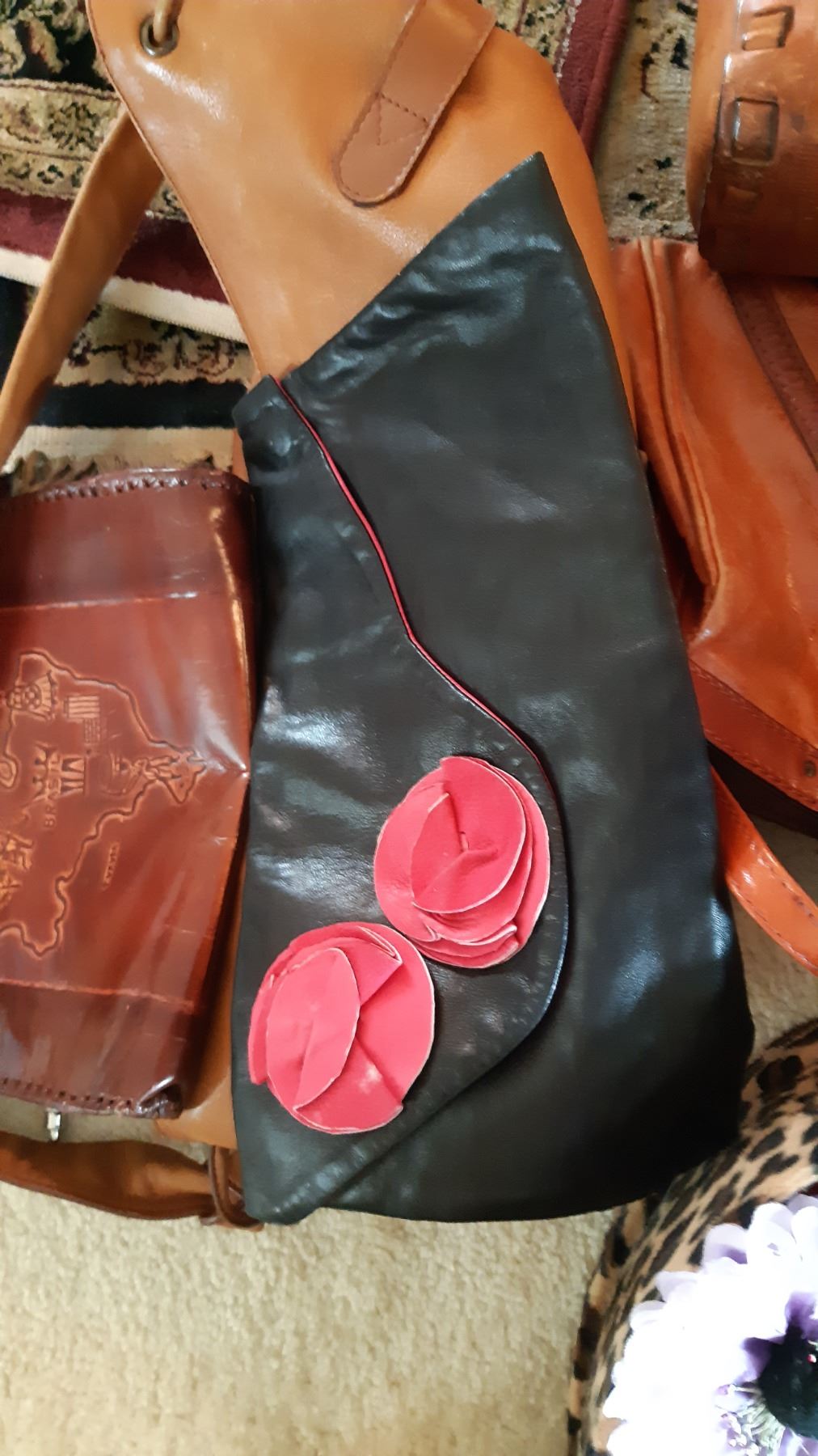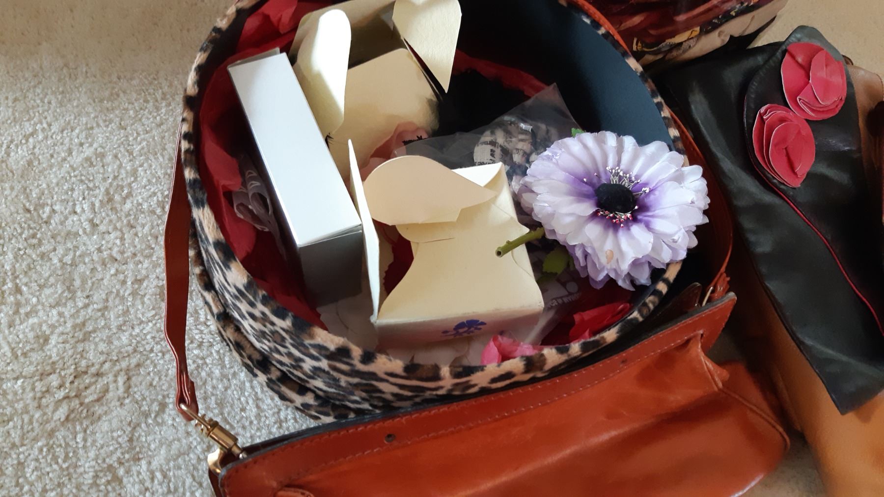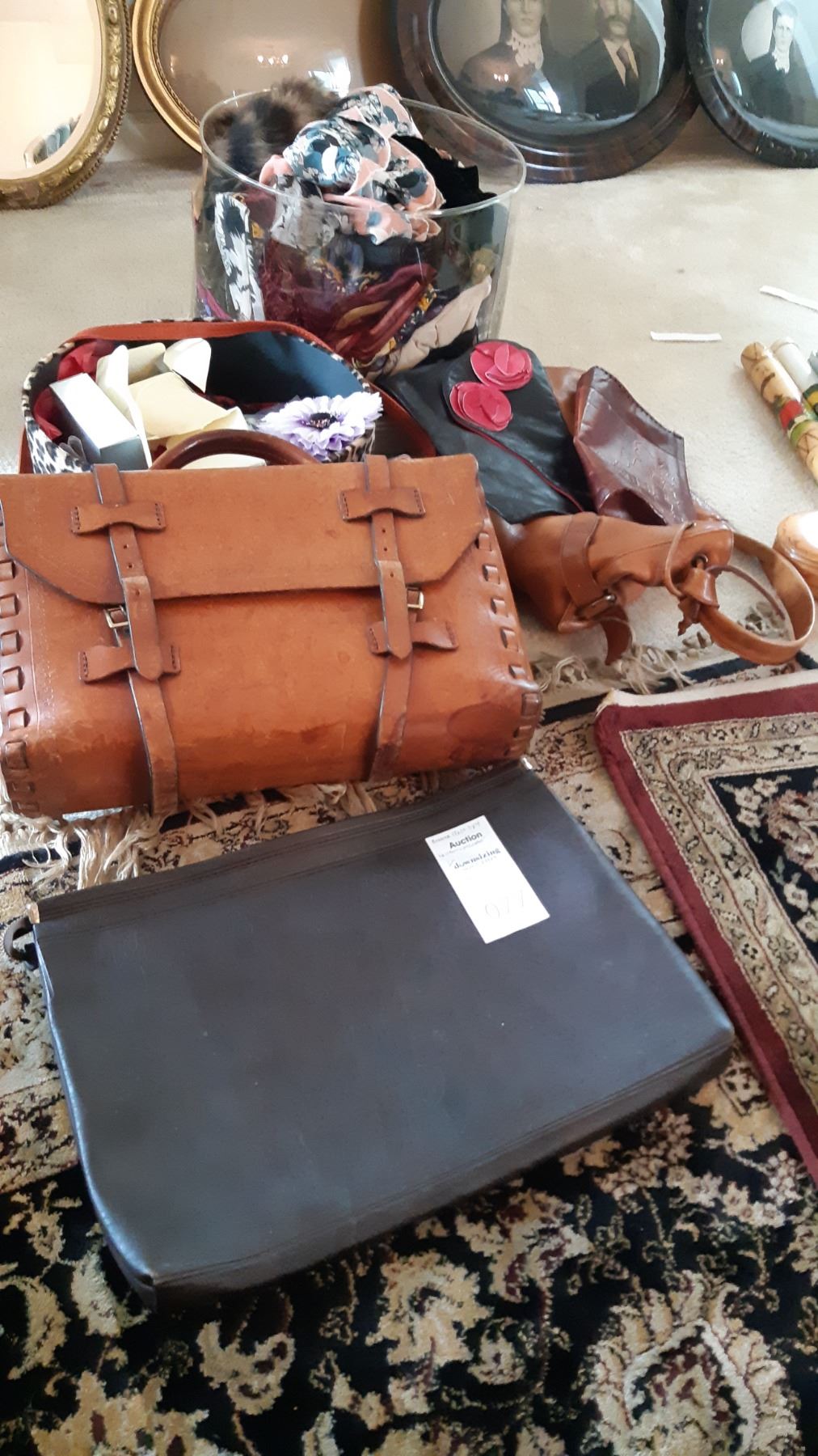 Leather handbags, cloth floral broaches, bin of scarves. Not checked for completeness. Bring packing materials