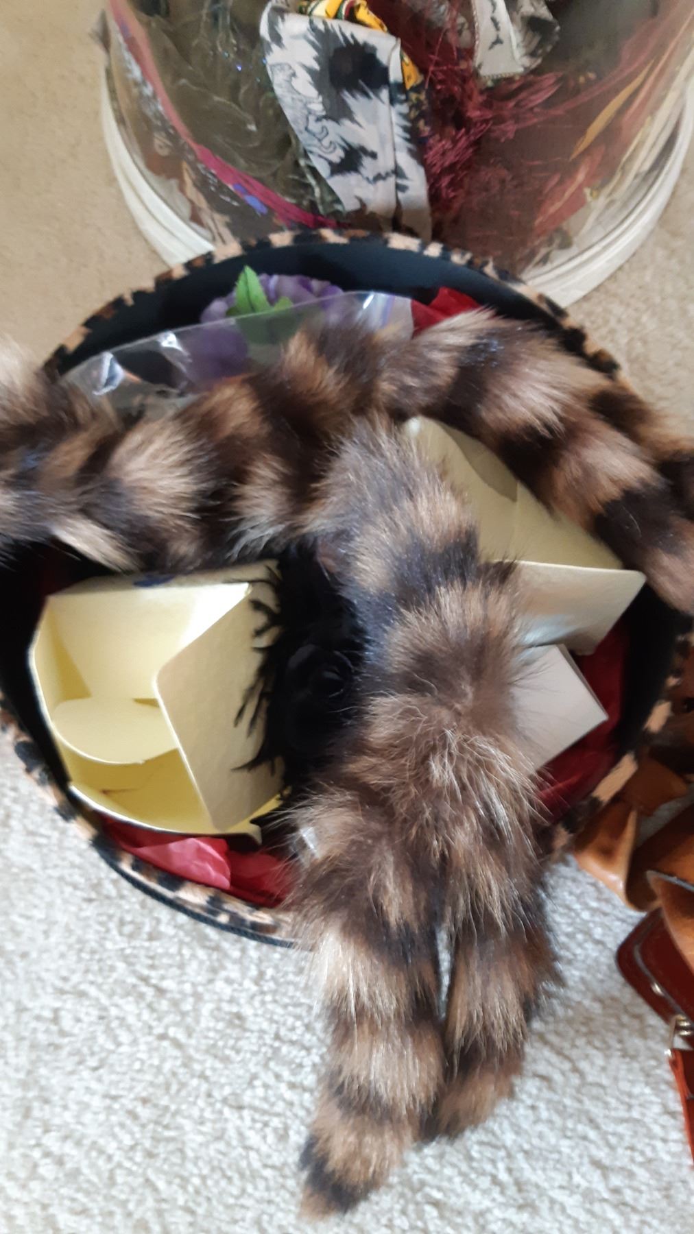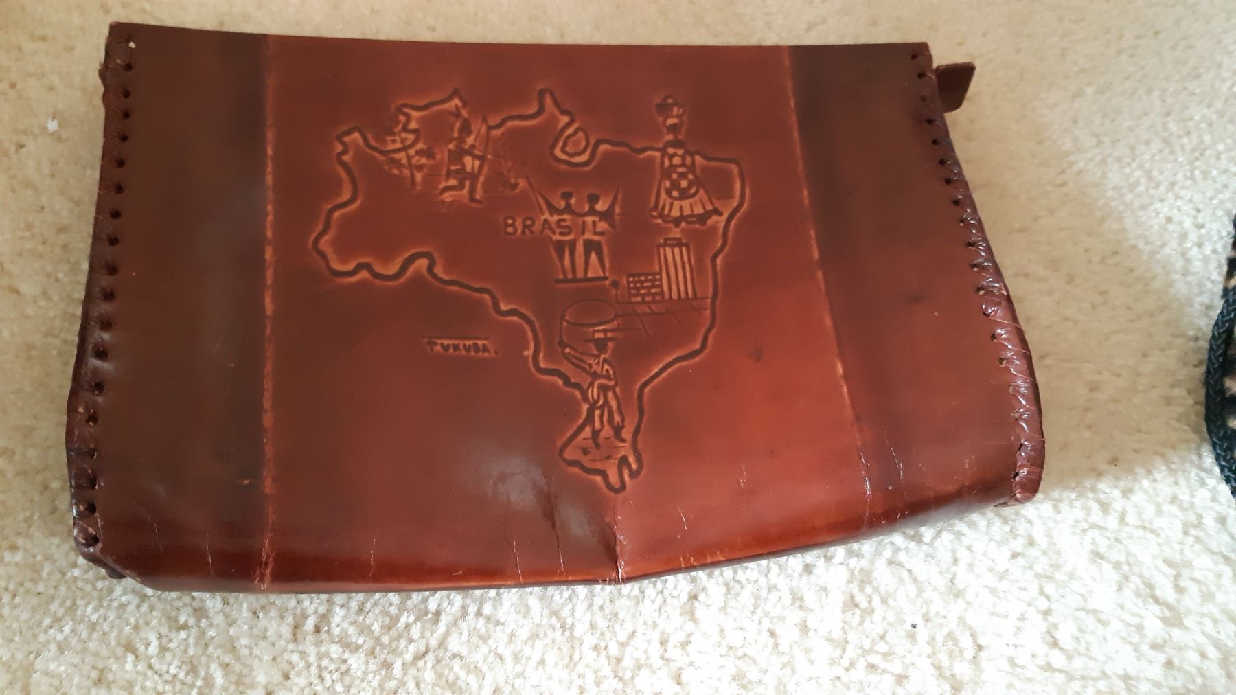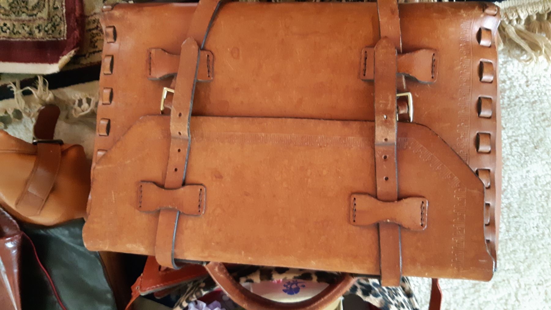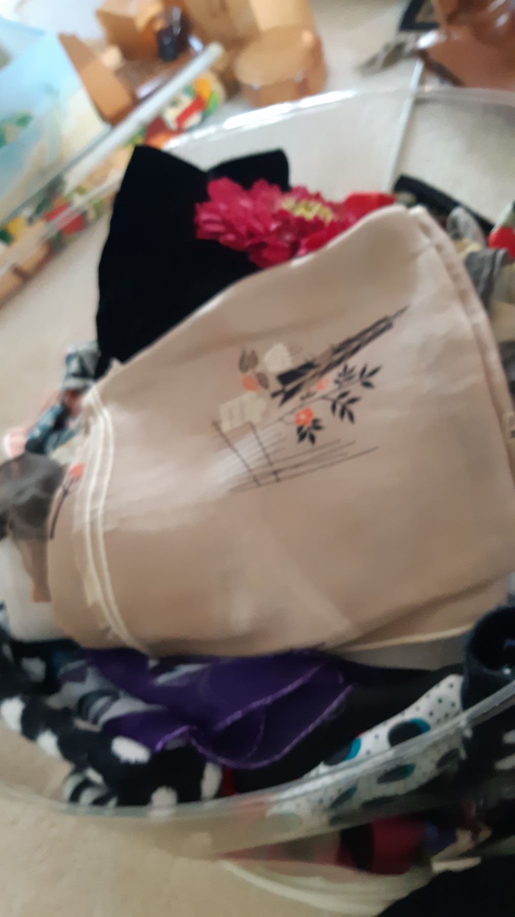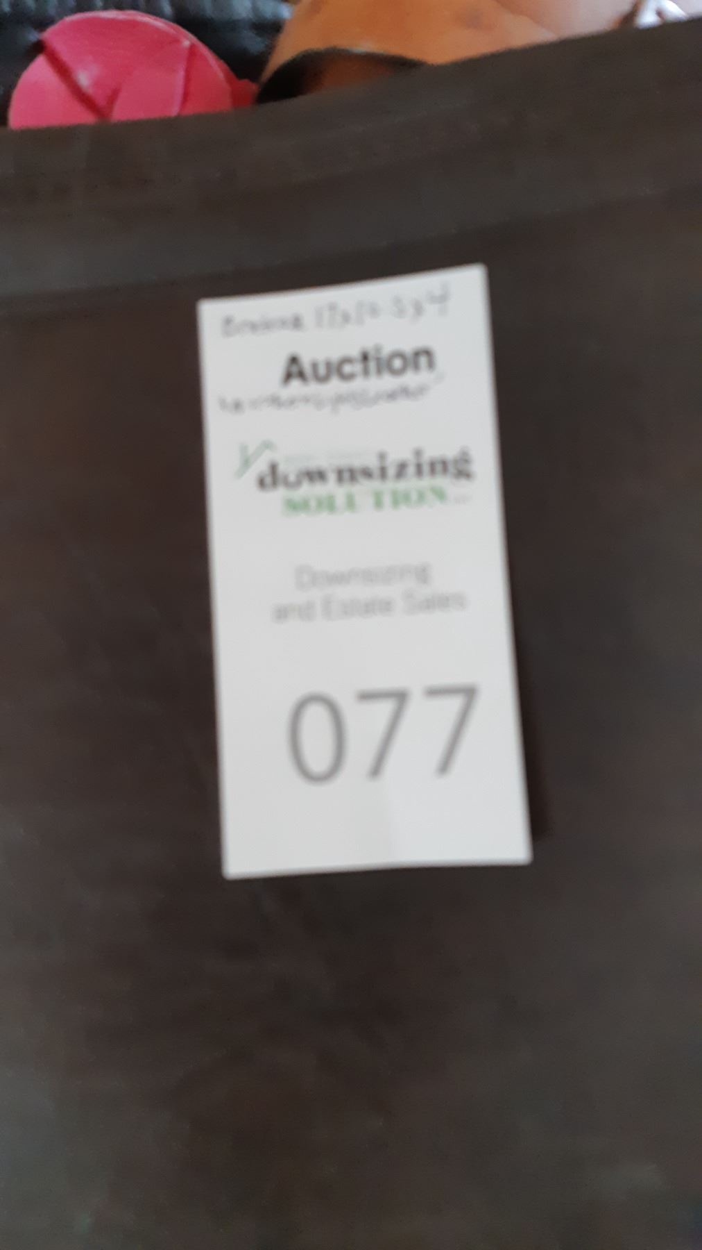 Leather handbags, cloth floral broaches, bin of scarves. Not checked for completeness. Bring packing materials