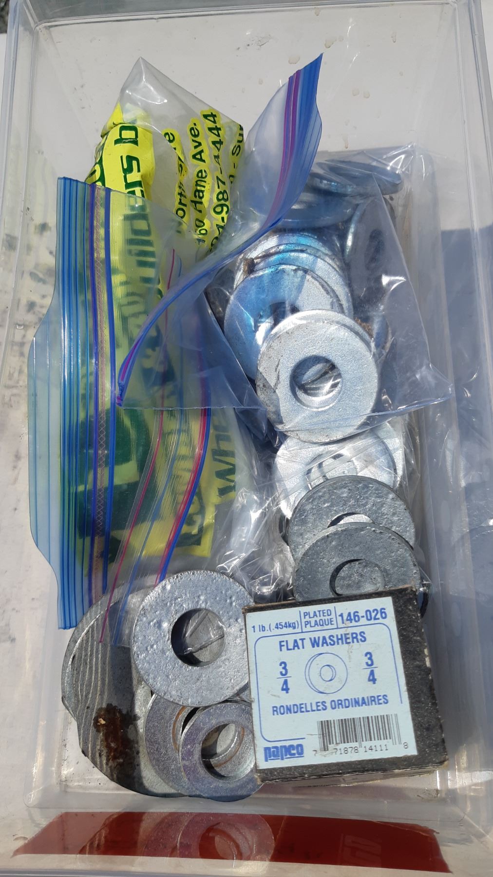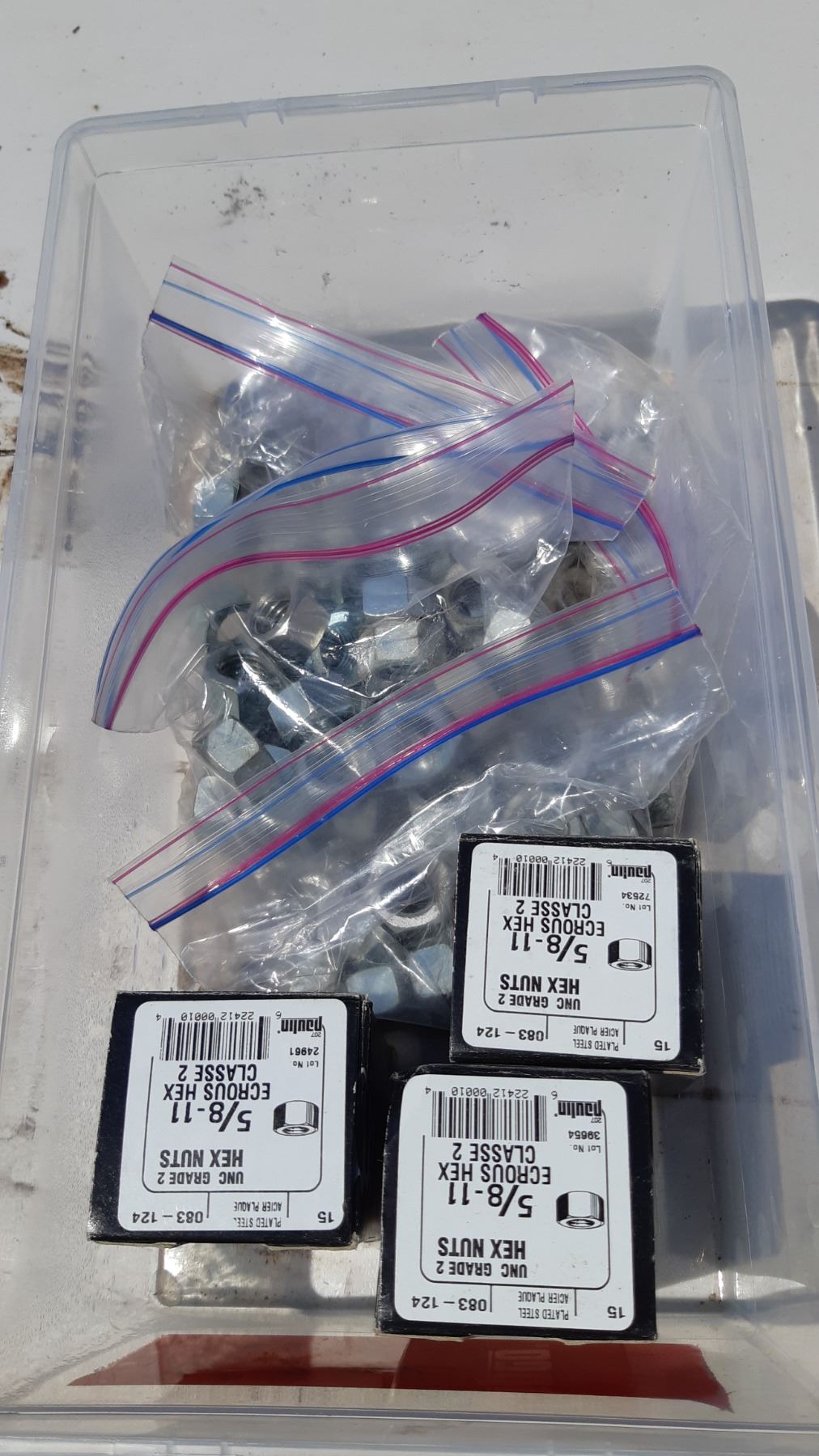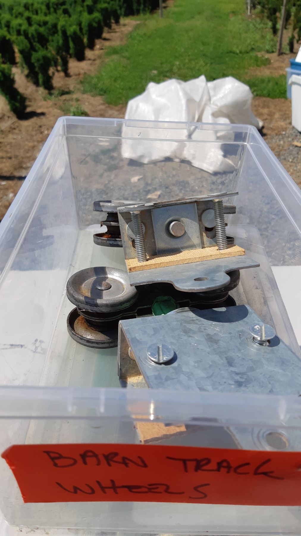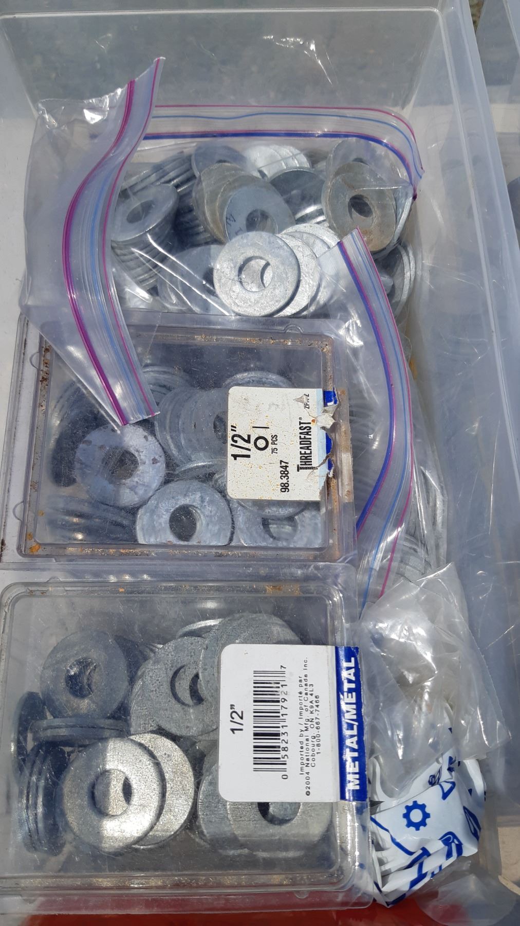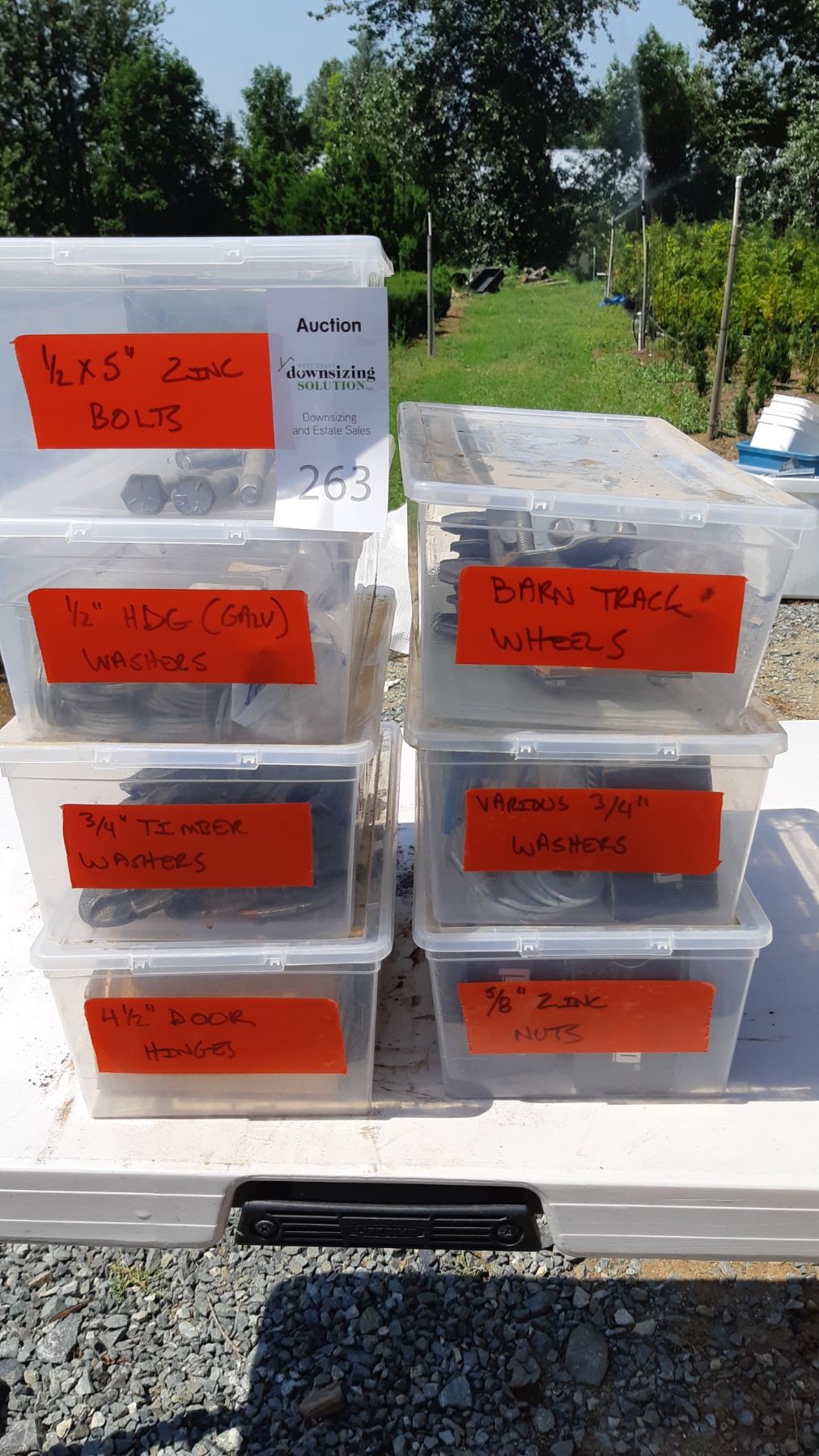 bolts, washers, barn track wheels and more 7 containers Pickup at 11 am
