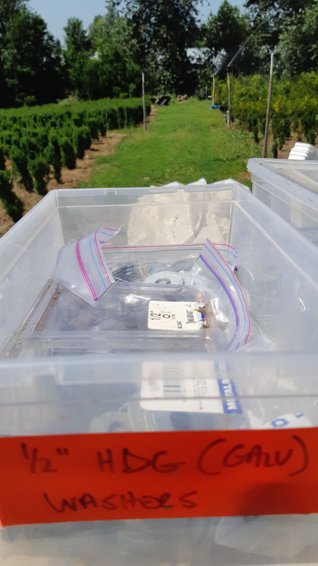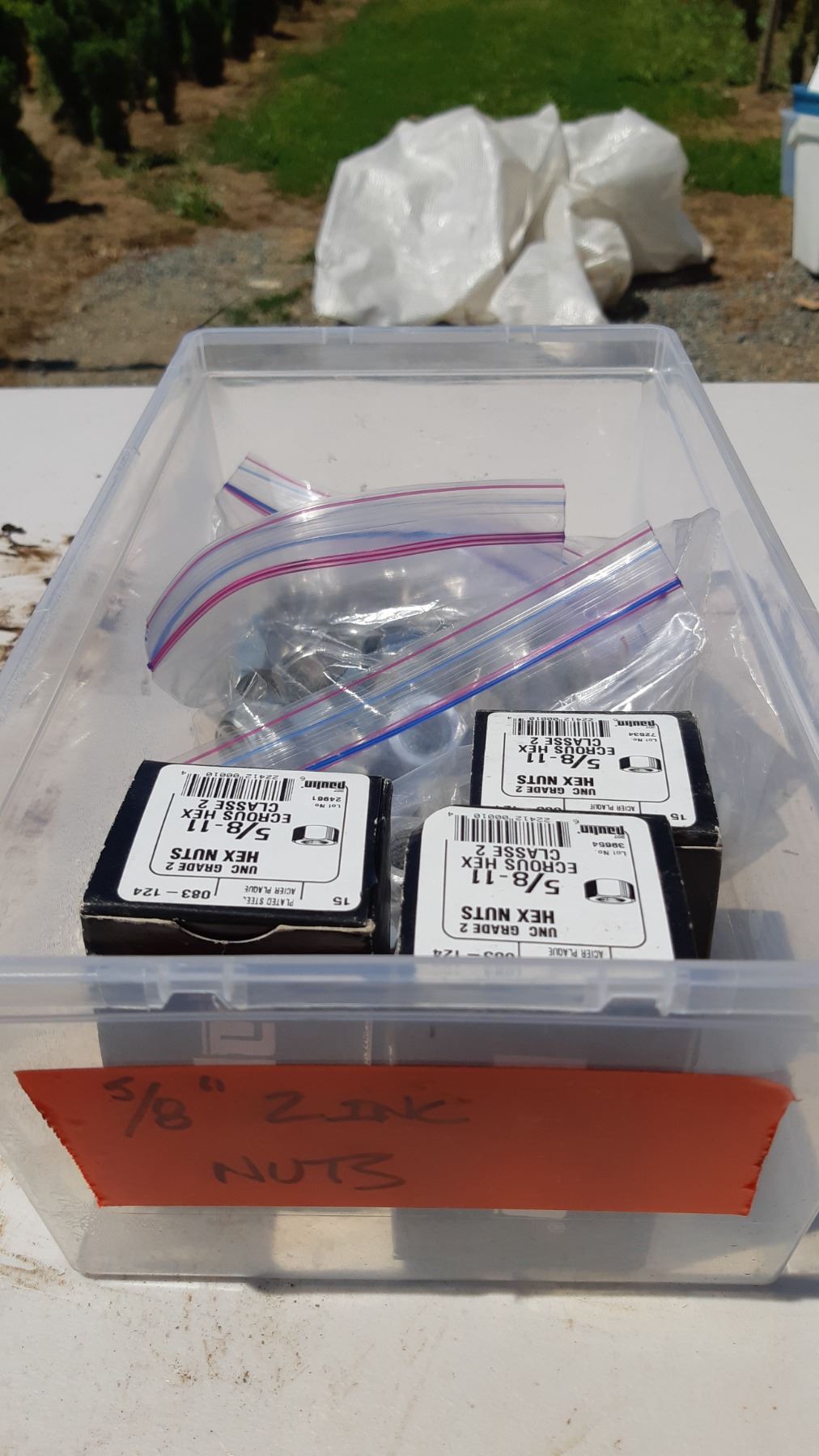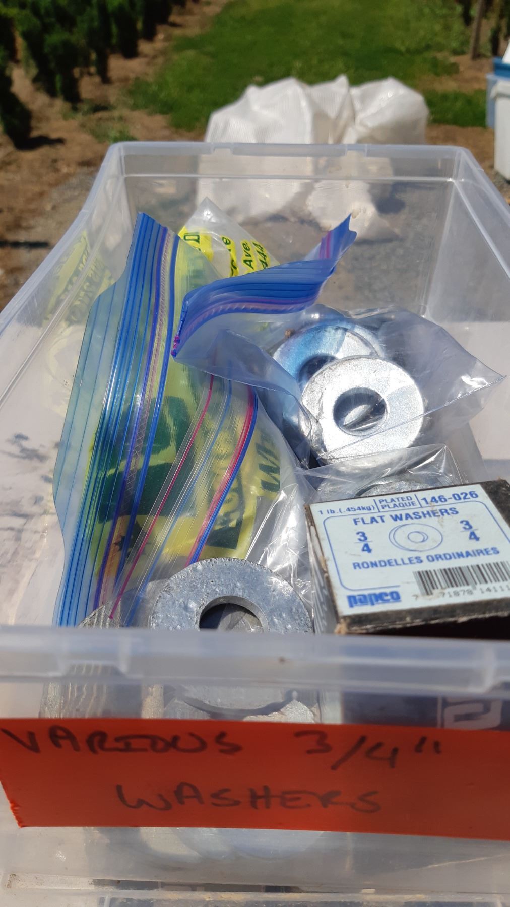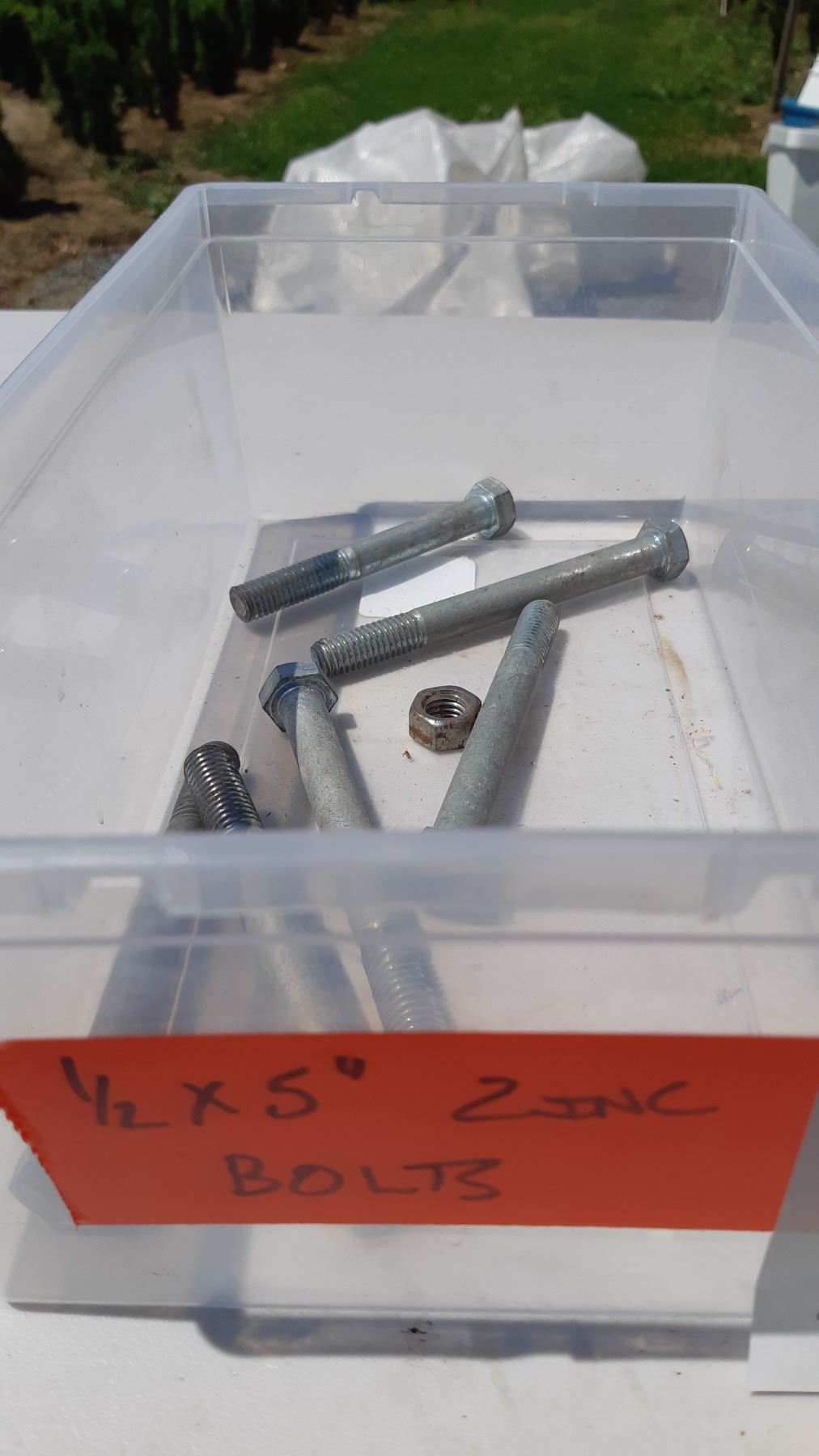 bolts, washers, barn track wheels and more 7 containers Pickup at 11 am