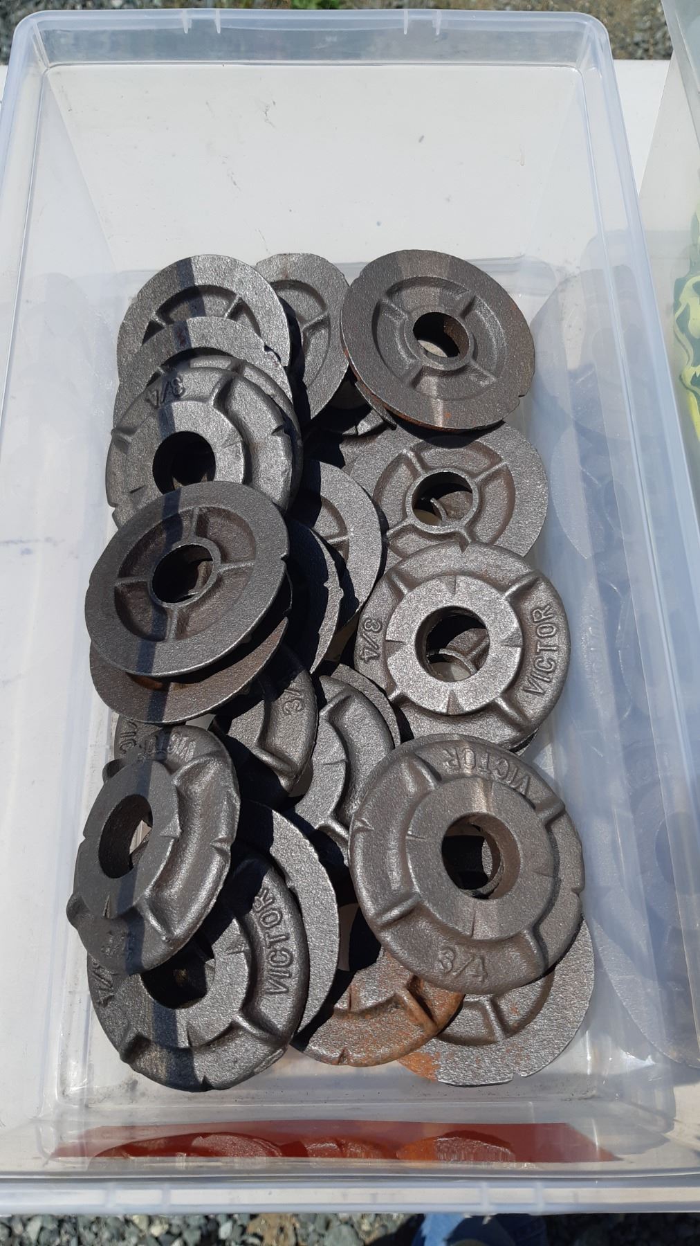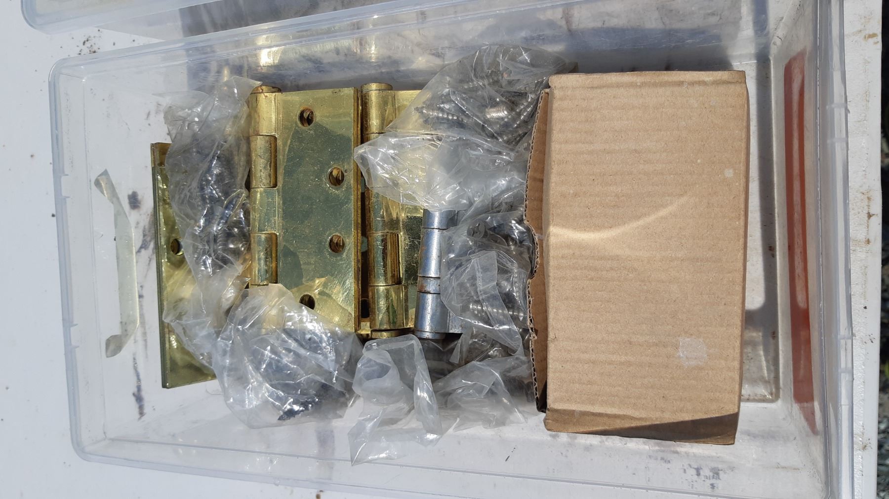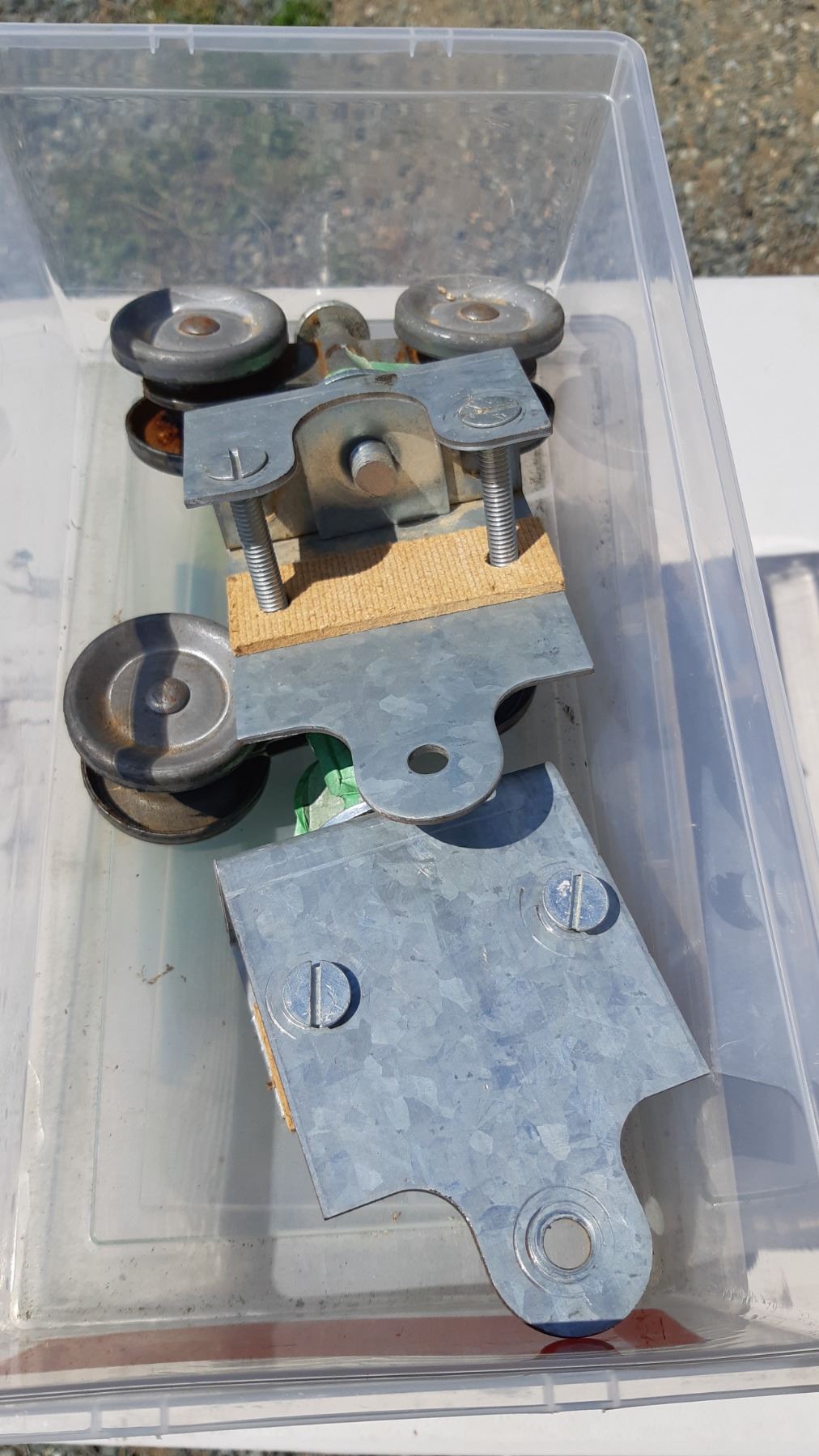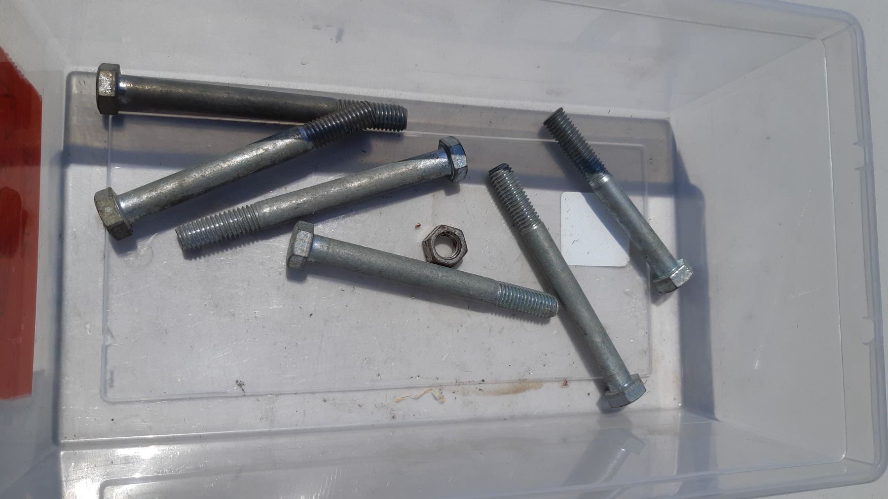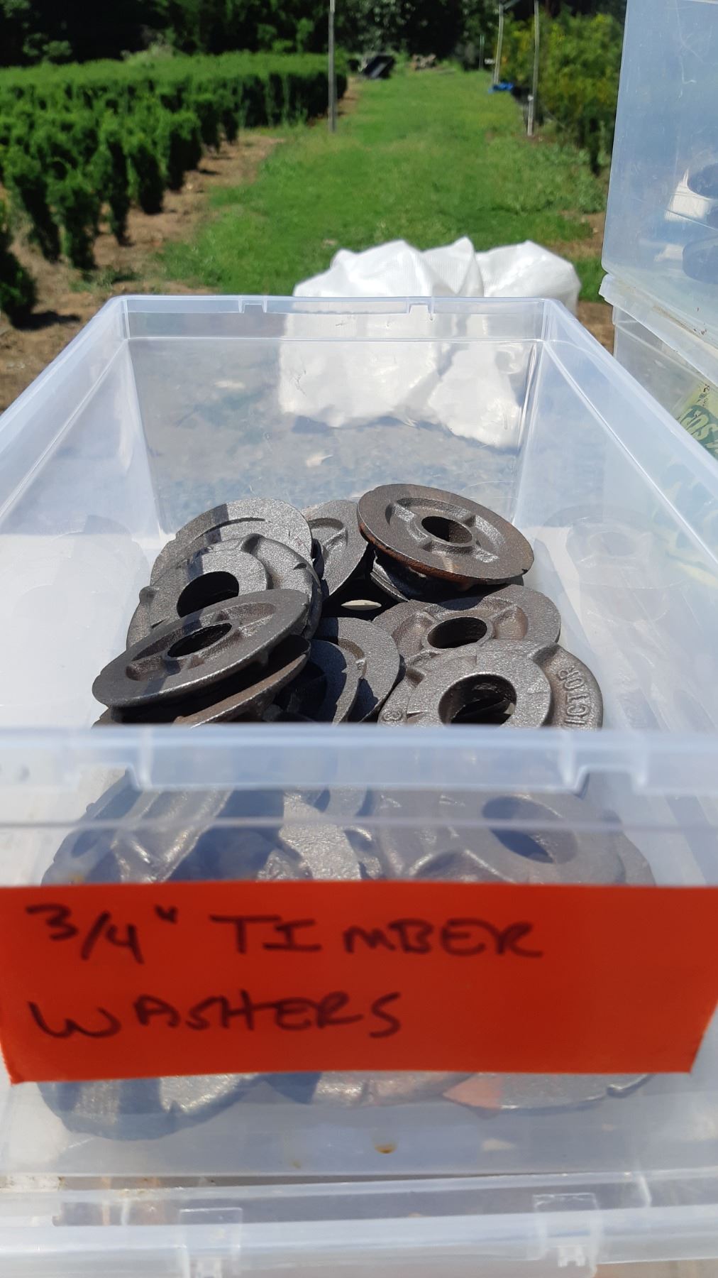 bolts, washers, barn track wheels and more 7 containers Pickup at 11 am