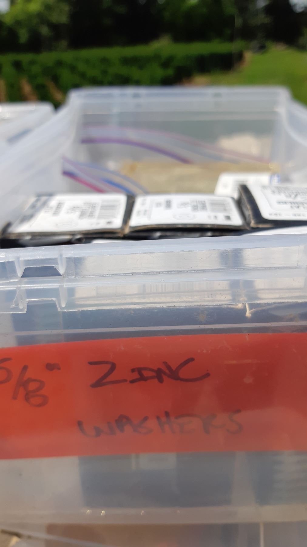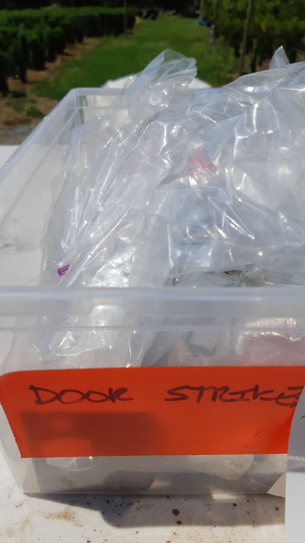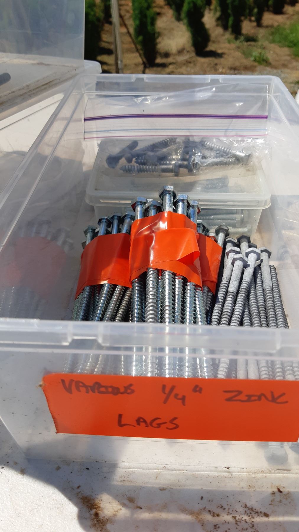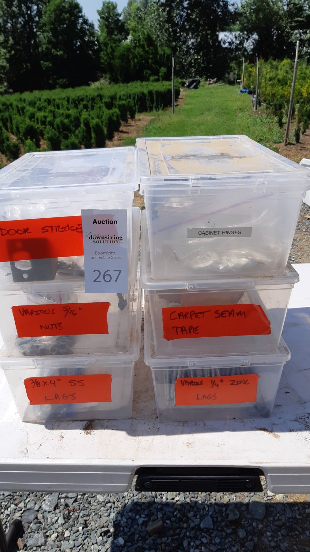 Door strikes, nuts, tape lags & more 6 containers. Pickup at 11 am