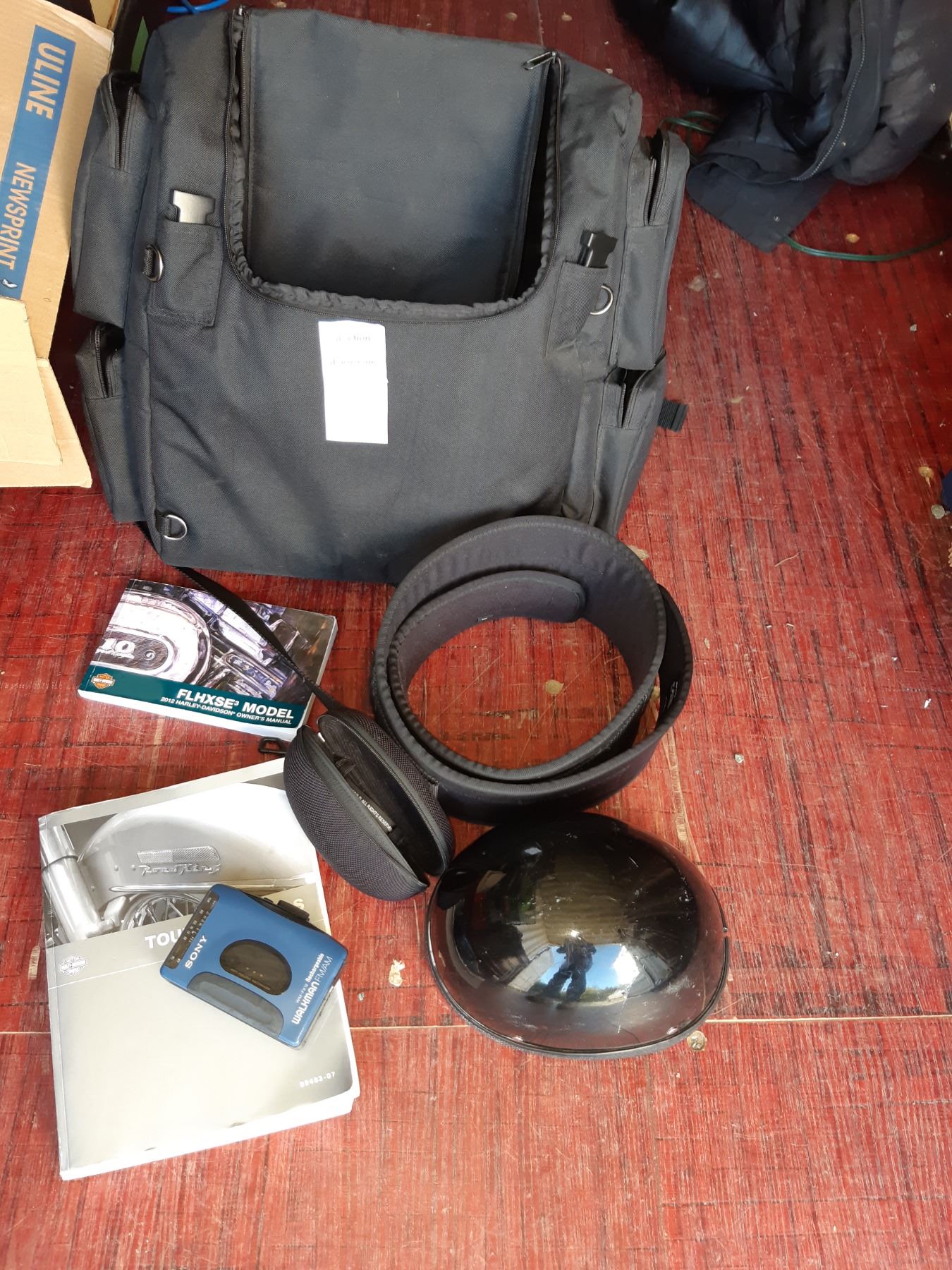 Motorcycle touring bag, Harley Davidson Eyeglass Case, Harley Davidson Touring Models Service Manual, Harley Davidson 2012 Owners Manual. Biker's Helmet, Harley Davidson Belt. Sony Walkman. Pickup at 9 am