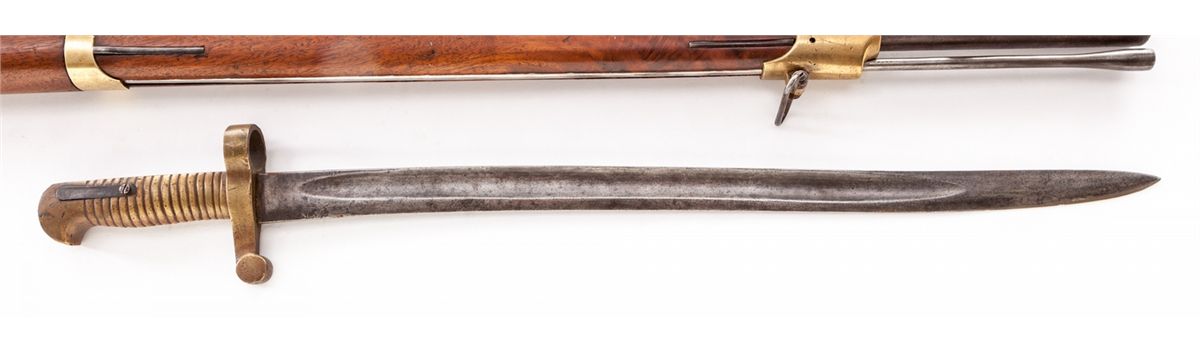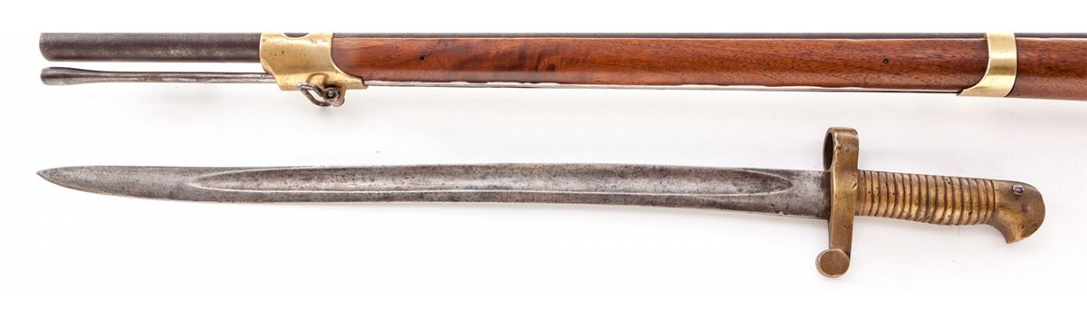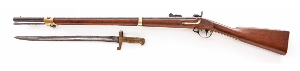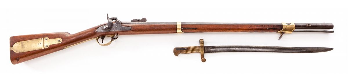 U.S. Model 1841 Mississippi Rifle, by Harpers Ferry (1853), .54 cal., 33'' barrel, brass hardware, long-range sight, bright barrel and lockplate, upper tang of buttplate marked ''I.60'', patchbox contains one extra percussion nipple, jag, and patches; walnut stock, with bayonet and ramrod. Condition is fine with moderate patination to bright surfaces. Brass with light staining and minor scuffs. Stock with clear cartouches, and repairs to both sides of upper tang (professionally accomplished). Action is good and functioning, bore is about fine. Est.: $3,000-$4,500. (Antique)