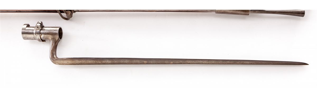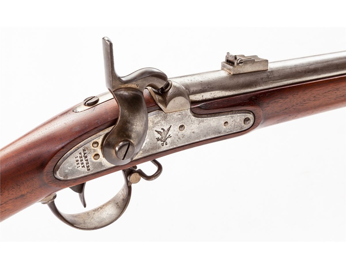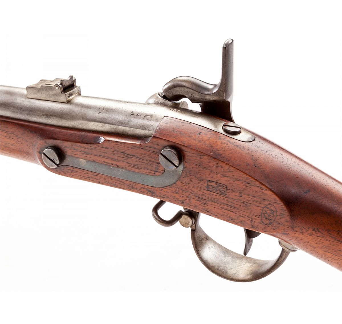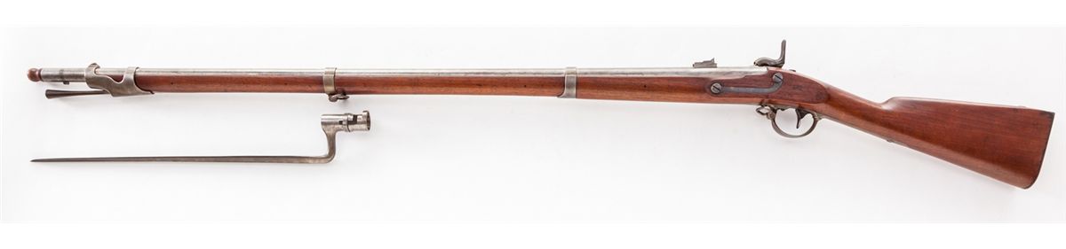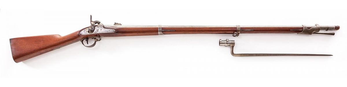 U.S. Model 1842 Rifled Musket, by Harpers Ferry, .69 cal., 42'' barrel, finished in the white, sharply cartouched full-length walnut stock, with correct U.S. marked socket bayonet. Lockplate marked with Federal eagle over U.S., and ''Harpers Ferry 1851'' behind hammer; upper tang is marked ''1851'' as well; ''V,P(eaglehead)'' proofmark to left side barrel at breech. Standard multi-leaf rear sight is present, as is ramrod. Considered quite scarce with approx. 8% of total production converted to rifled musket. Condition is excellent with light even patination to barrel. Very minor erosion in nipple bolster area. Sideplate retains 96% original blue. Stock with minor oil staining near metal parts and very light impressions from handling. Action is crisp, bore is fine. Est.: $3,500-$5,000. (Antique)