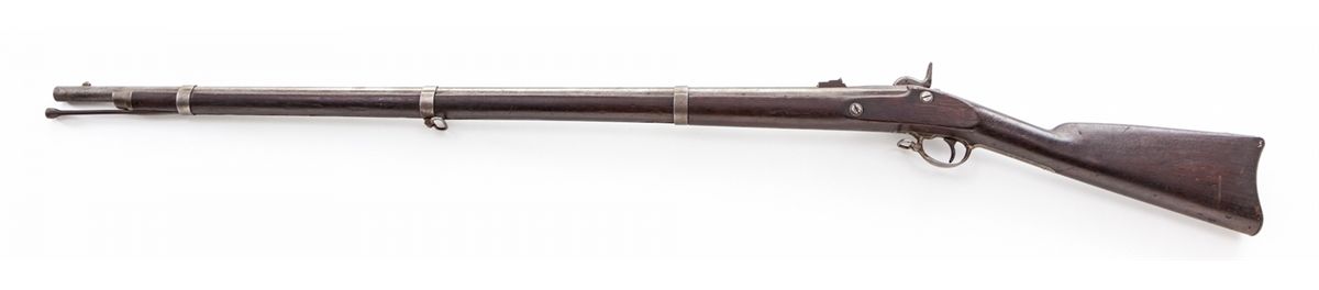 U.S. Model 1855 Percussion Rifle-Musket, by Harpers Ferry, .58 cal., 40'' barrel, with Maynard tape primer system, finished in the white with iron furniture, and patch box. Sideplate dated 1860. Condition is very good with light toning and moderate pitting to barrel. Stock with some oil darkening near lock, and light cartouche to left side of stock. Good functioning action and primer feed. Correct bugle-head ramrod is present. Est.: $1,000-$1,500. (Antique)