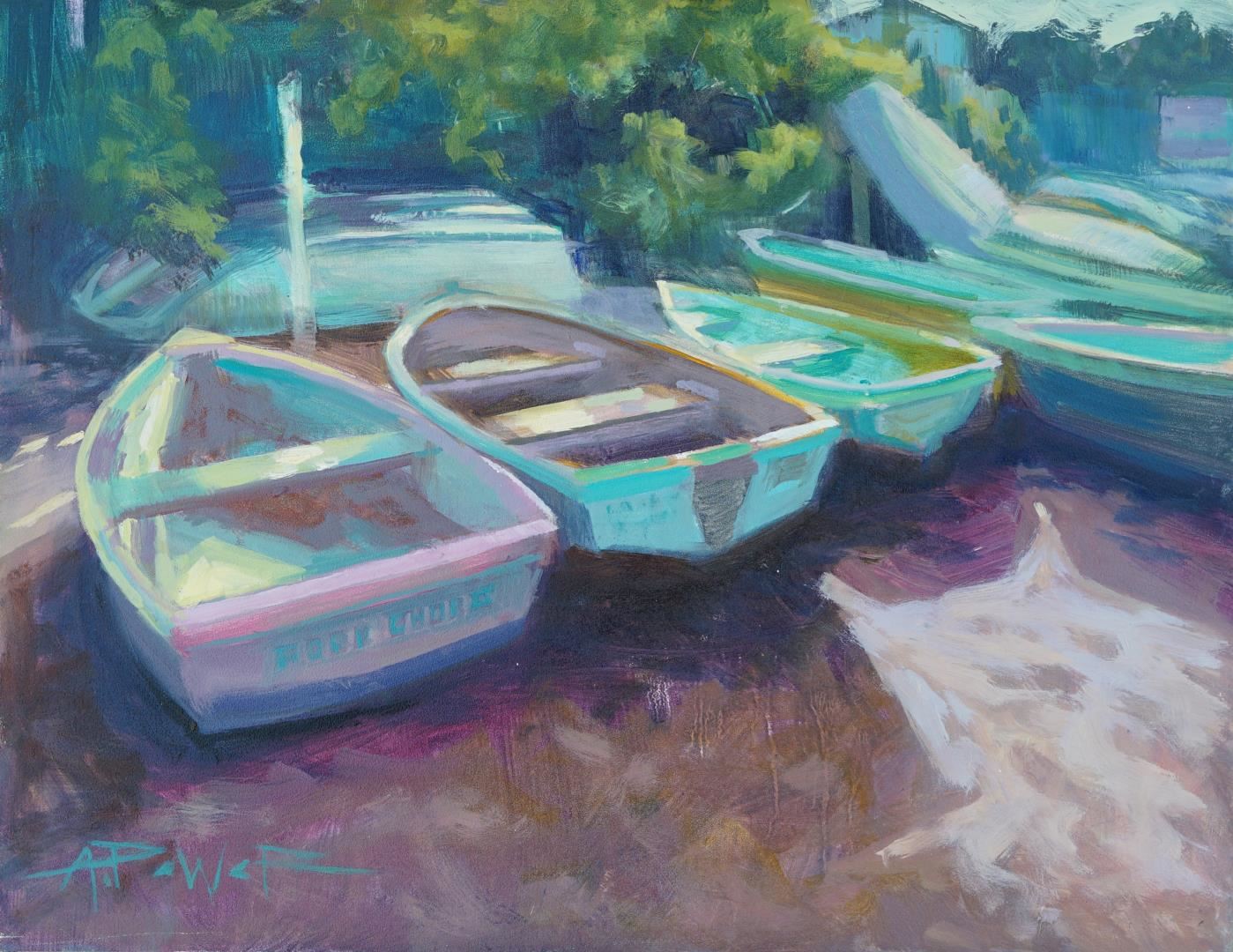 Rowboats rest peacefully in a row at Harwich Harbor on Cape Cod in this 11x14 oil on gesso panel by Anette Power, with artist's COA