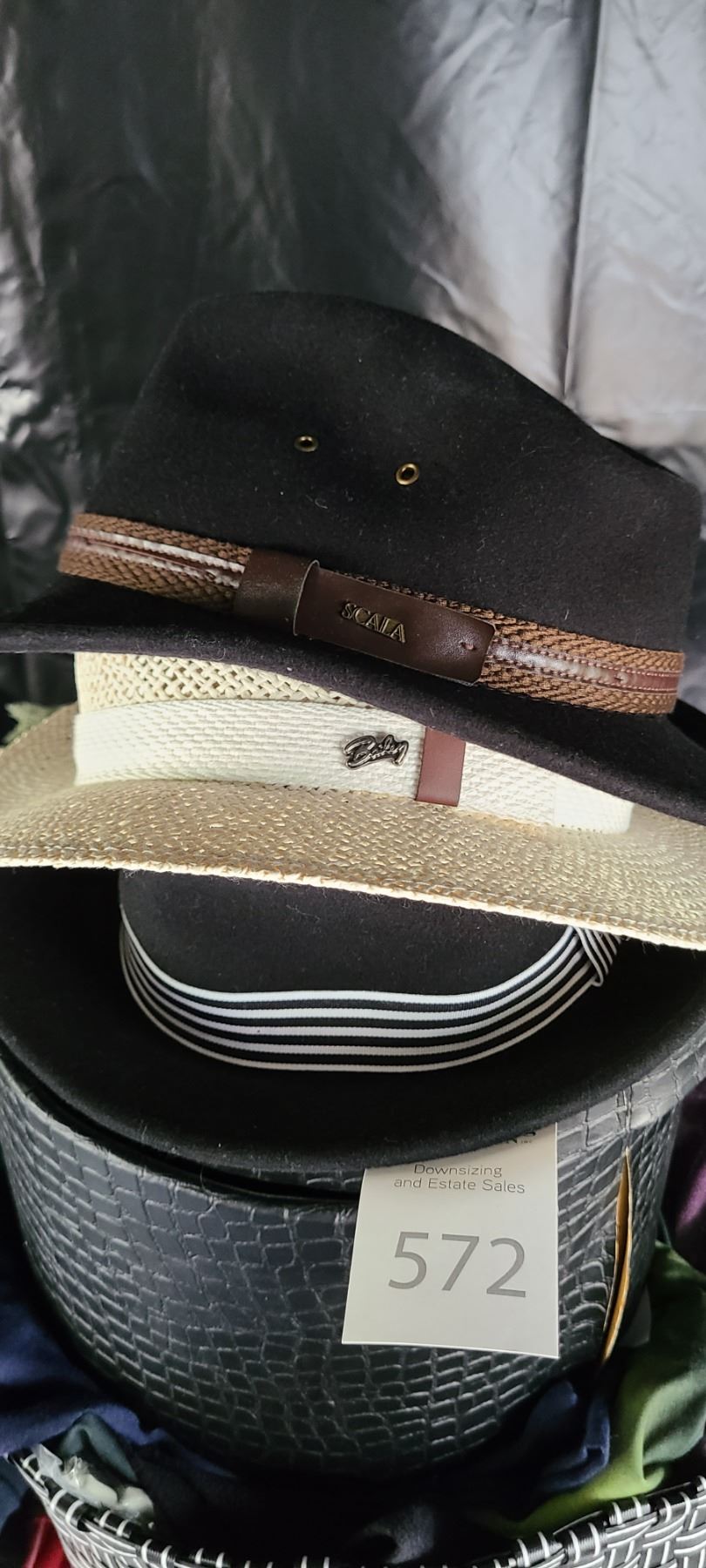 Mens straw hat, 2 felt hats and hat box. Pickup at 10 am