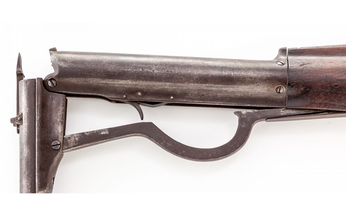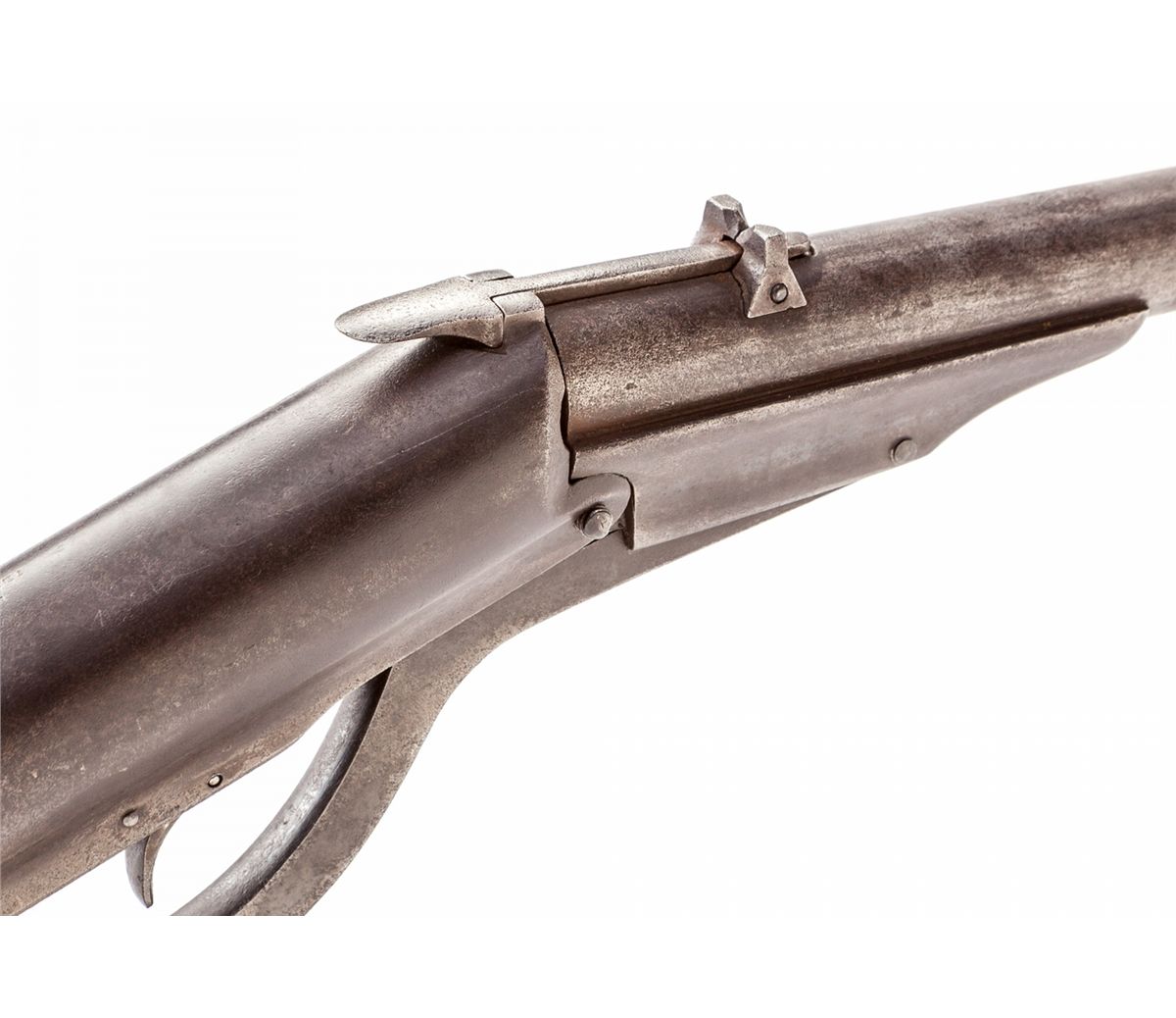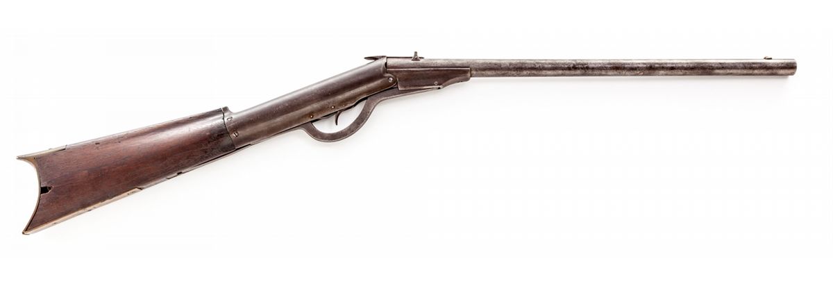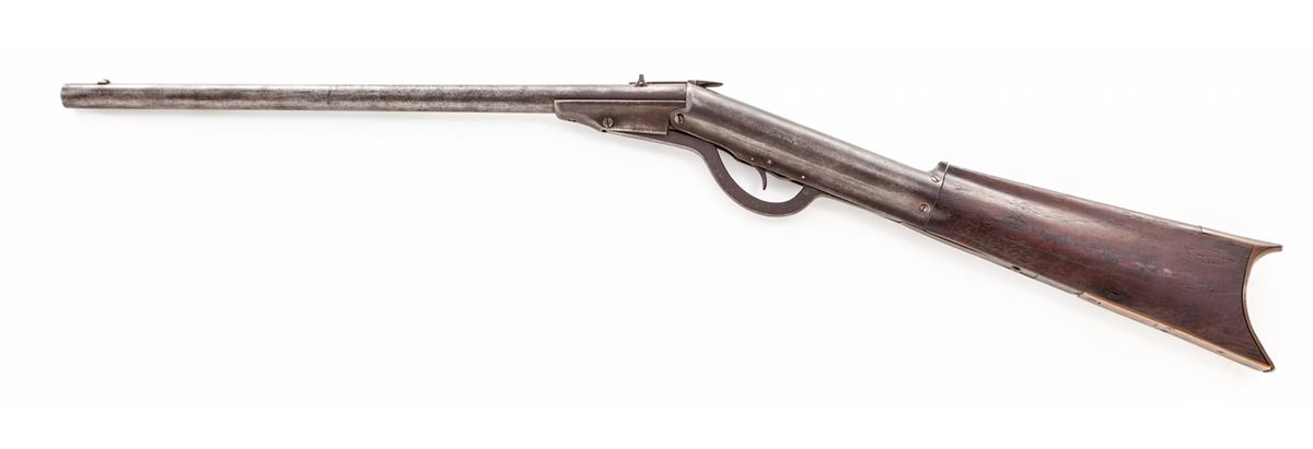 Rare Haviland & Gunn New Improved Model 1880 Airgun, #79, .22 cal., browned finish, walnut stock, brass crescent buttplate and pellet trap, as mfg'd in Ilion, NY. This is the earliest production airgun mfg'd in the U.S., with patent date April 18, 1871. Condition is very good with overall gray/brown patina. Most screw slots are straight and true. Brass front sight with sharp edges. Stock with small loss at center of buttplate on right side. Action remains crisp. A key American air rifle for the advanced collector. Est.: $1,200-$1,800.