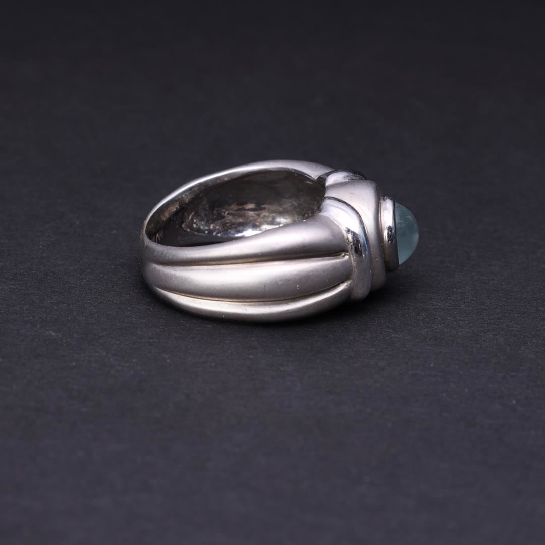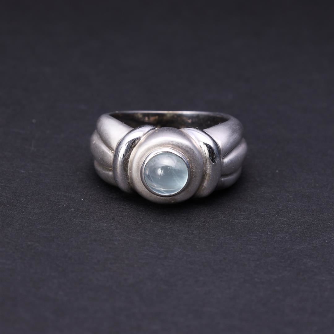 Heavy 18K White Gold & Blue Aqua Marine Cabochon Ring containing one aqua marine weighing approximately 0.70 cts. Total weight of ring is 11.2 gm. Estimated retail value $3,500.
