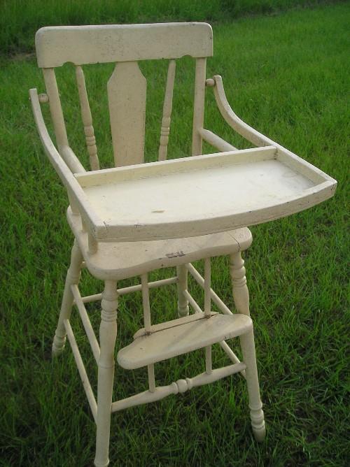 Old wooden high chair has pale yellow peeling paint and measures 20"W x 20"D x 36"H.