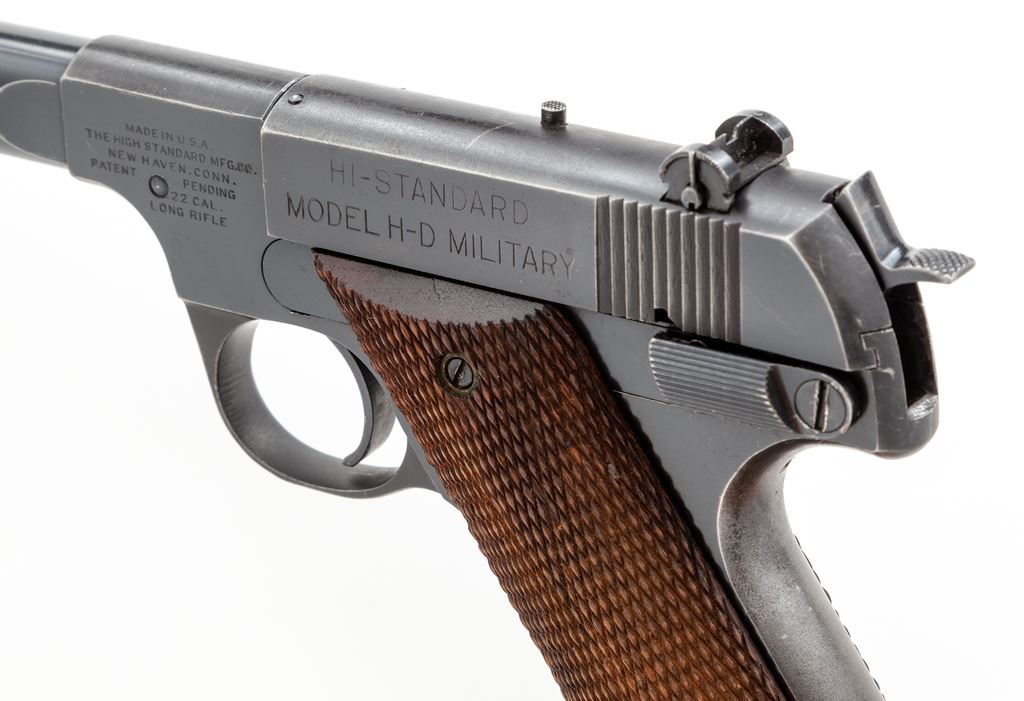 High Standard Model H-D Military Semi-Automatic Pistol, #263168, .22 LR cal., 6.75'' barrel, blue finish, factory checkered walnut grips, exposed hammer, with standard sights, and one 10-round magazine. Made in New Haven, Conn. Condition is good with approx. 75% original blue finish and thinning to the barrel; front and back grip strap account for a majority of the finish loss. Grips with a few flat spots and chips to the checkering. Factory lettering is clear. Action is smooth with a near excellent bore. Est.: $200-$350. (C&R/PPT) (Paul Hantke collection)