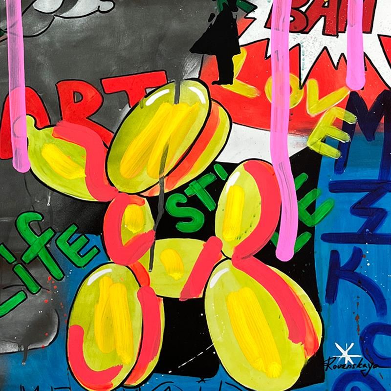 His Ballon is a one-of-a-kind mixed media on deckle edge paper by Nastya Rovenskaya; hand signed by the artist. This piece comes custom framed and includes letter of authenticity. Measures approximately 37 x 30 (framed), 31 x 24 (image).