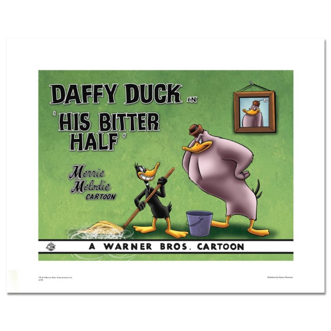 "His Bitter Half - Daffy Duck" is a limited edition giclee on paper from Warner Bros. featuring iconic Looney Tunes characters. The art was taken from an original Lobby Card used to promote "His Bitter Half" released in 1949. It comes numbered, with hologram seal, and a Certificate of Authenticity! Measures approx. 20 x 16" (with border), 16" x 12" (image).
