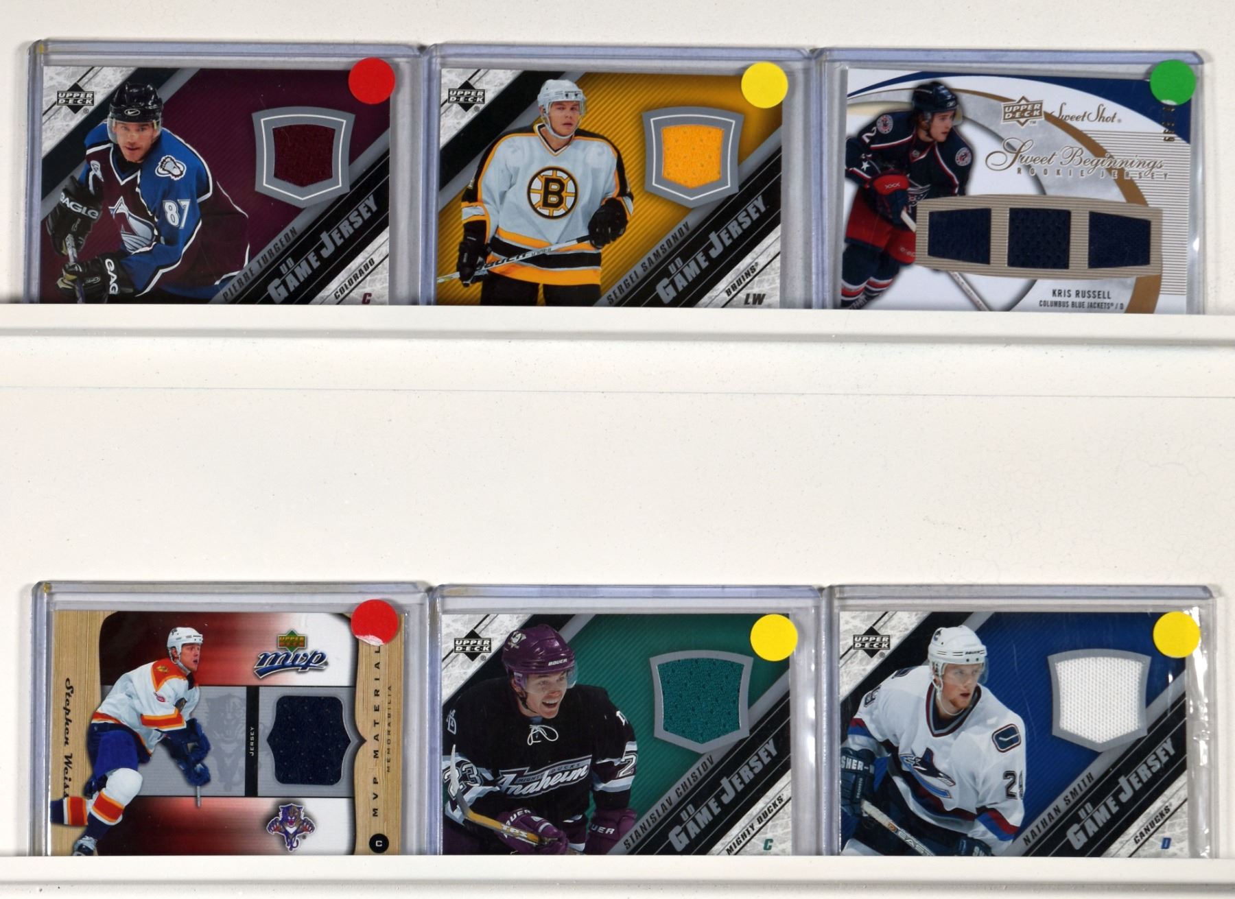 6 Card Lot of Game Worn Jerseys including Pierre Turgeon, Sergei Samsonov, Kris Russell 596/599, Stephen Weiss, Stanislav Chistov, Nathan Smith