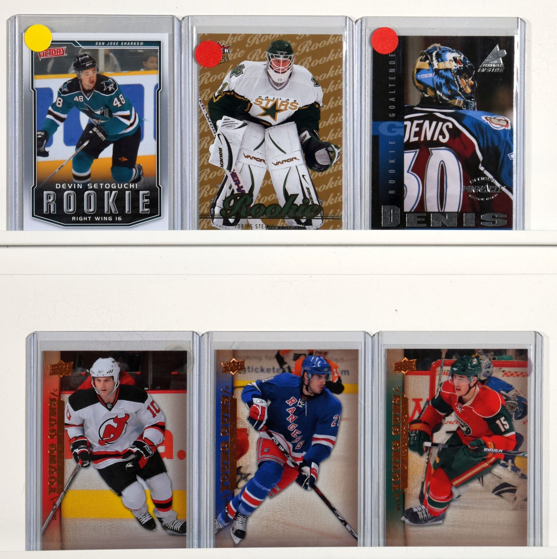 6 Card Lot of Rookie Cards including Tobias Stephan, Devin Setoguchi, Marc Denis, James Sheppard, Ivan Baranka, Rod Pelley