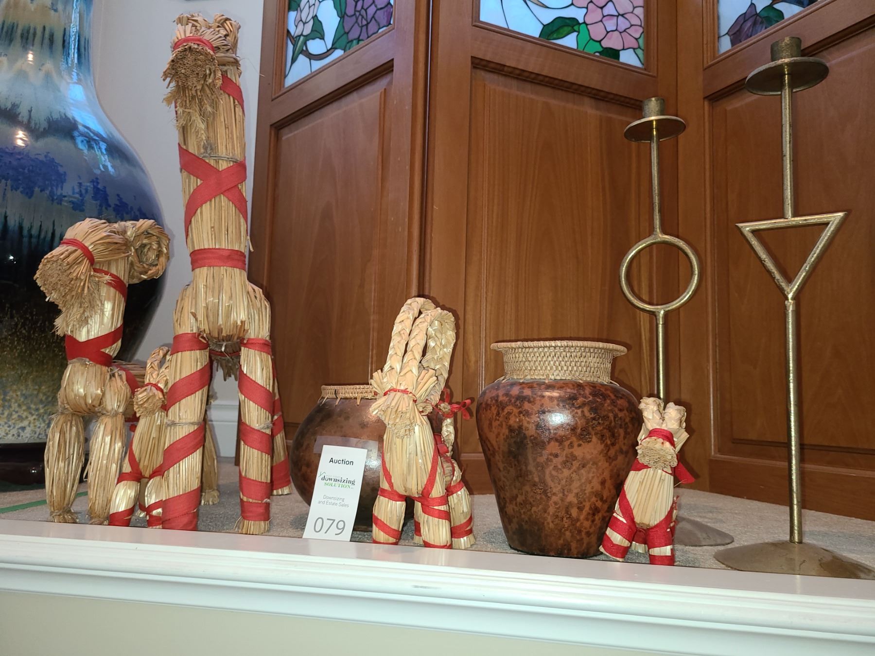 Straw horses, candle holders, and vases in lot. Bring packing material. Pickup 10 am.