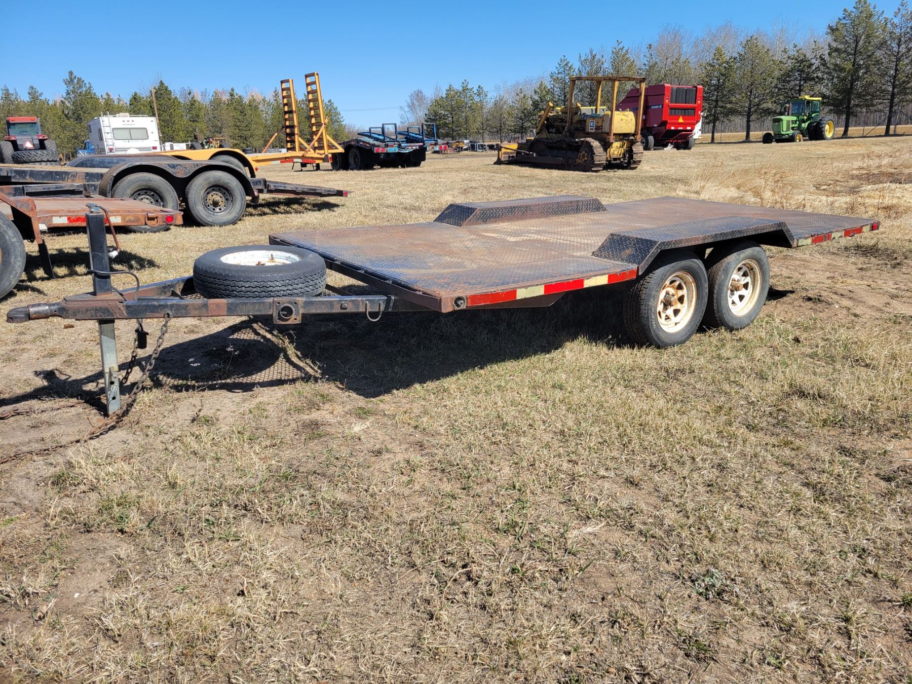 Homemade ball hitch trailer, approx. 80" x 16 ft tandem axle trailer c/w steel deck, approx. 2500 lb axles, stake pockets, pull out ramps & spare tire, SN. LK231096R