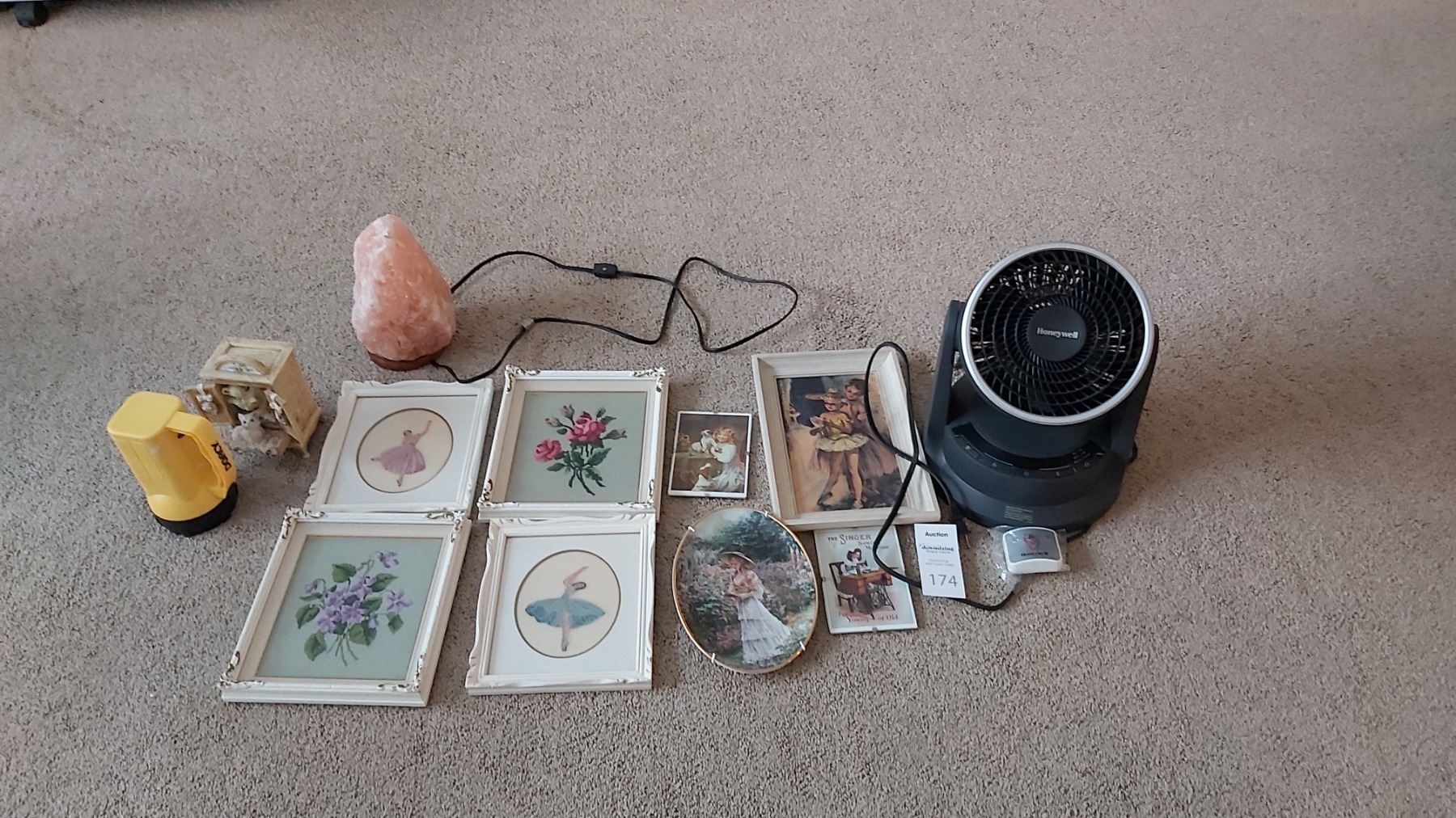 Fan with remote, framed needlework Salt lamp. Bring packing materials and pickup at 9am