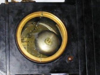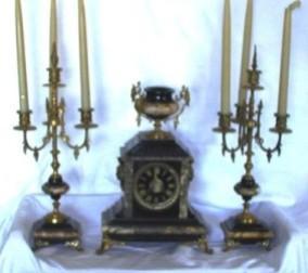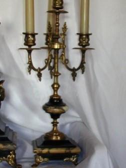 French 3 pc Chiming Clock Set; Clock with Beveled Glass & pair of Matching Candelabrums, Marble & Brass, clock marked Horlocerie, Paris, clock 18" tall; candelabrum 21" tall
