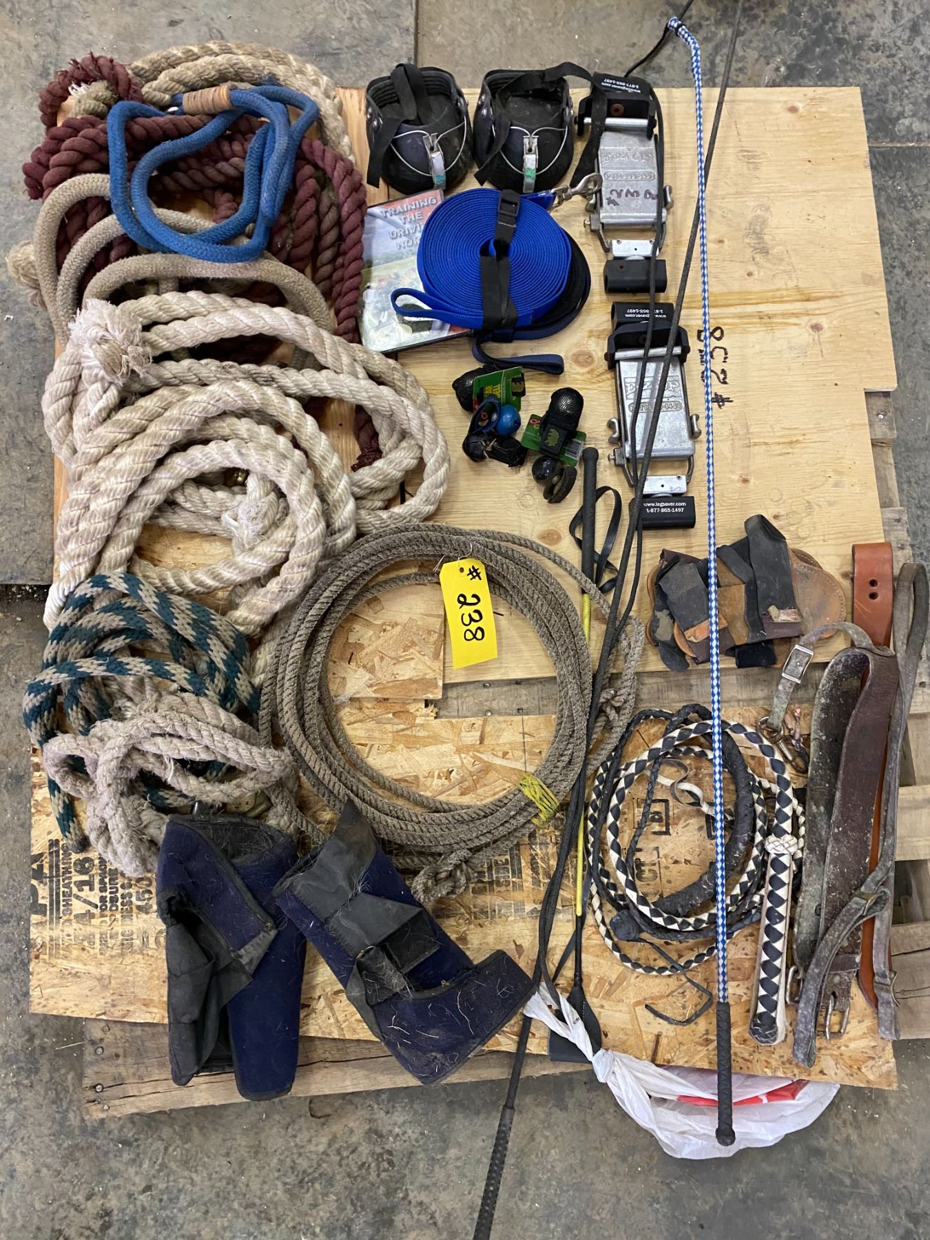 Horse equipment; lead ropes; lasso; leg warmers; 2 new lead lines; hoof boots; easy mount stirrups; 4 different whips