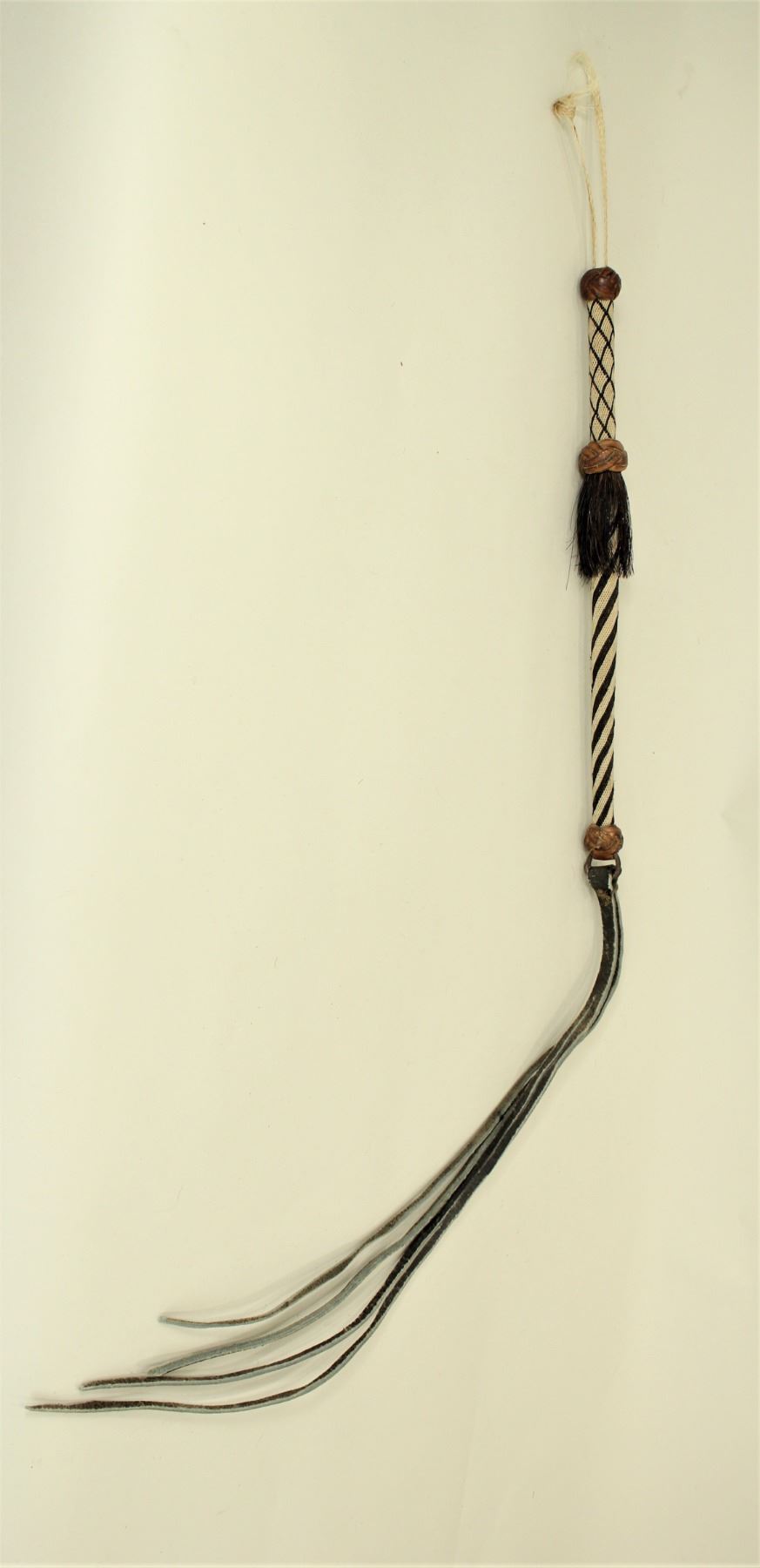 Very nice black and white hitched horsehair quirt with decorative leather braided ends, and terrific original popper.