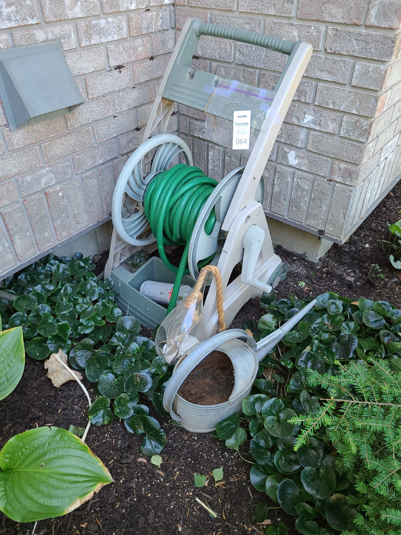 Short garden hose on reel, pitcher and small terrarium in lot. Pickup 9 am.