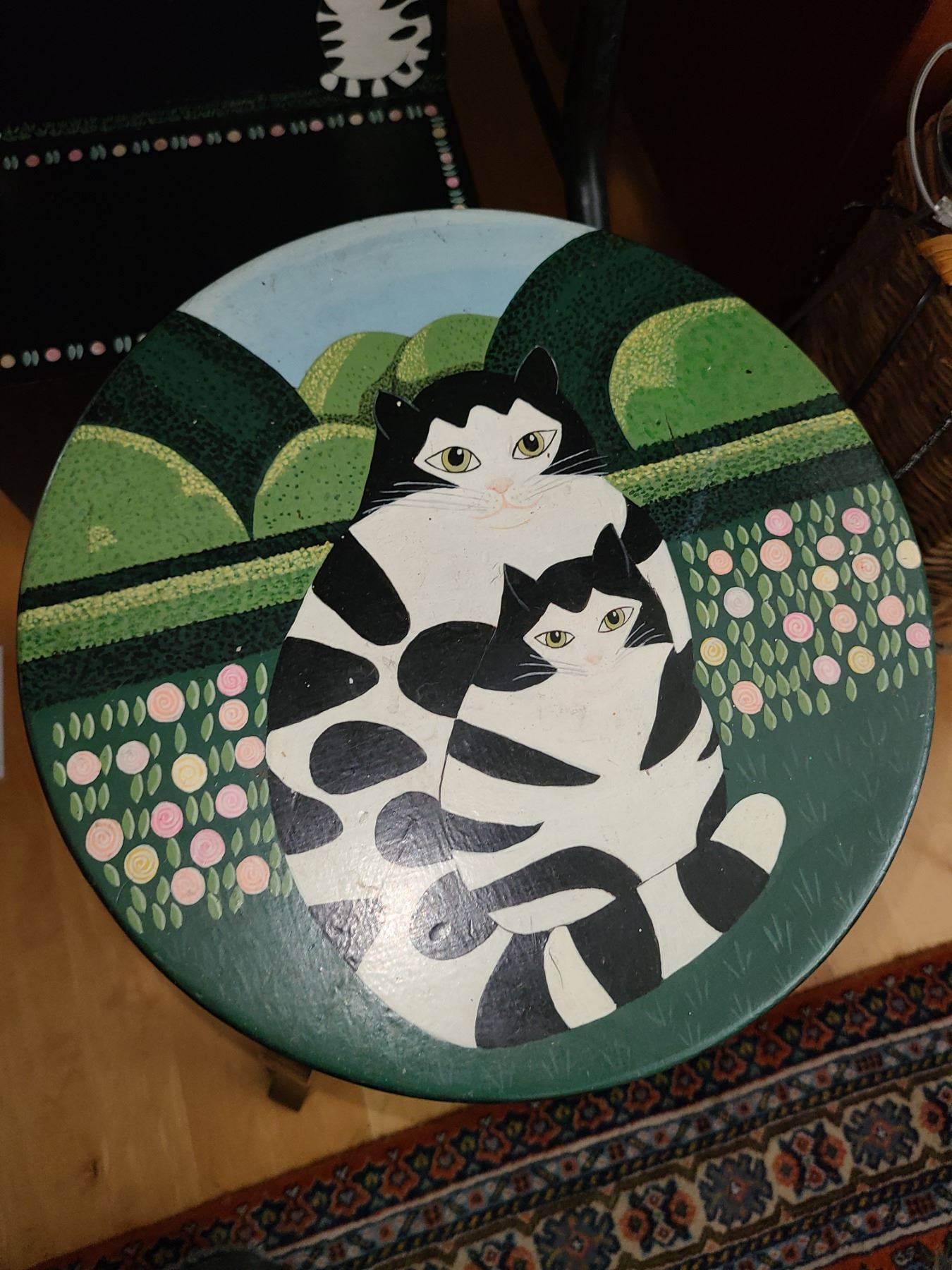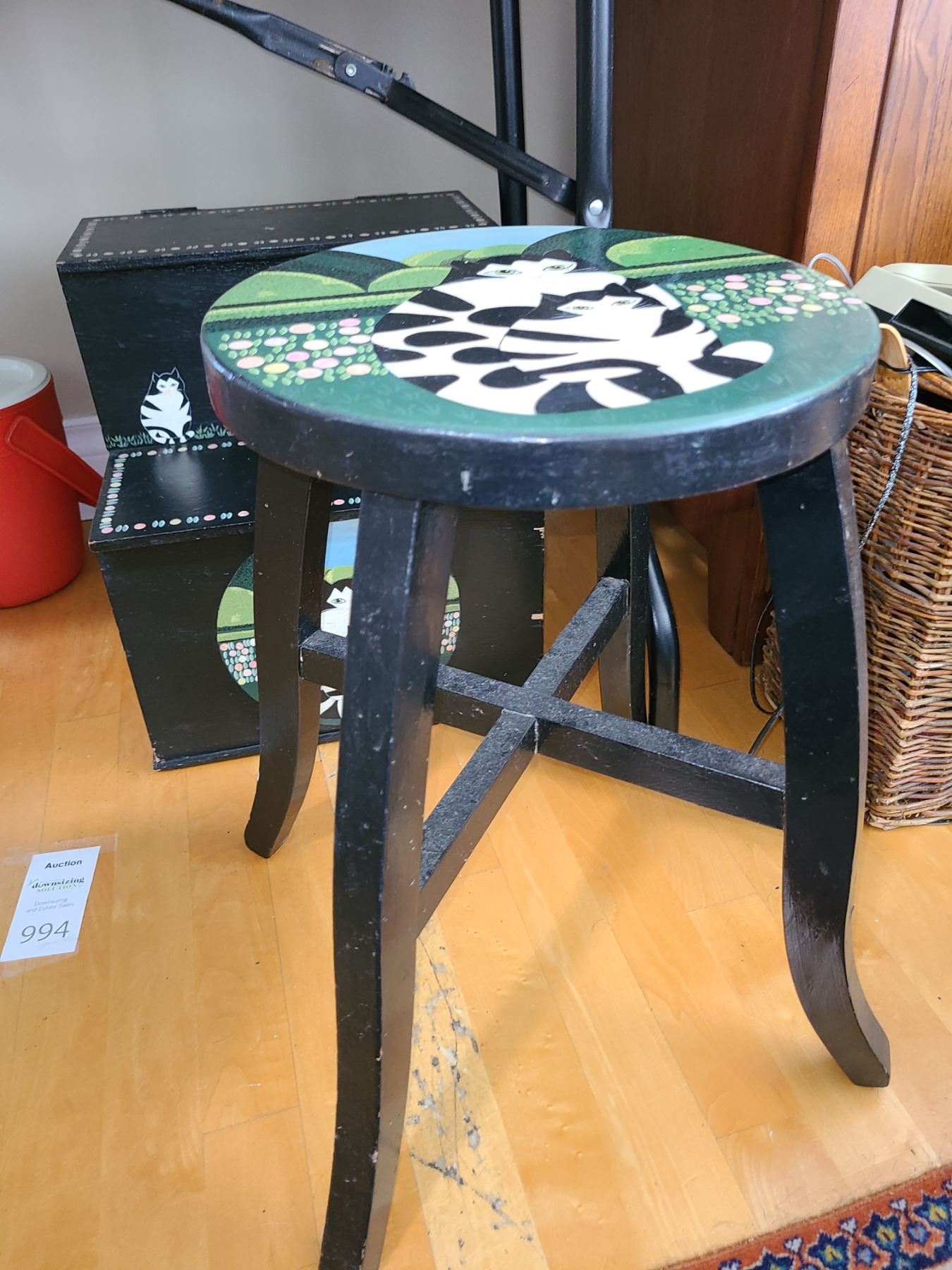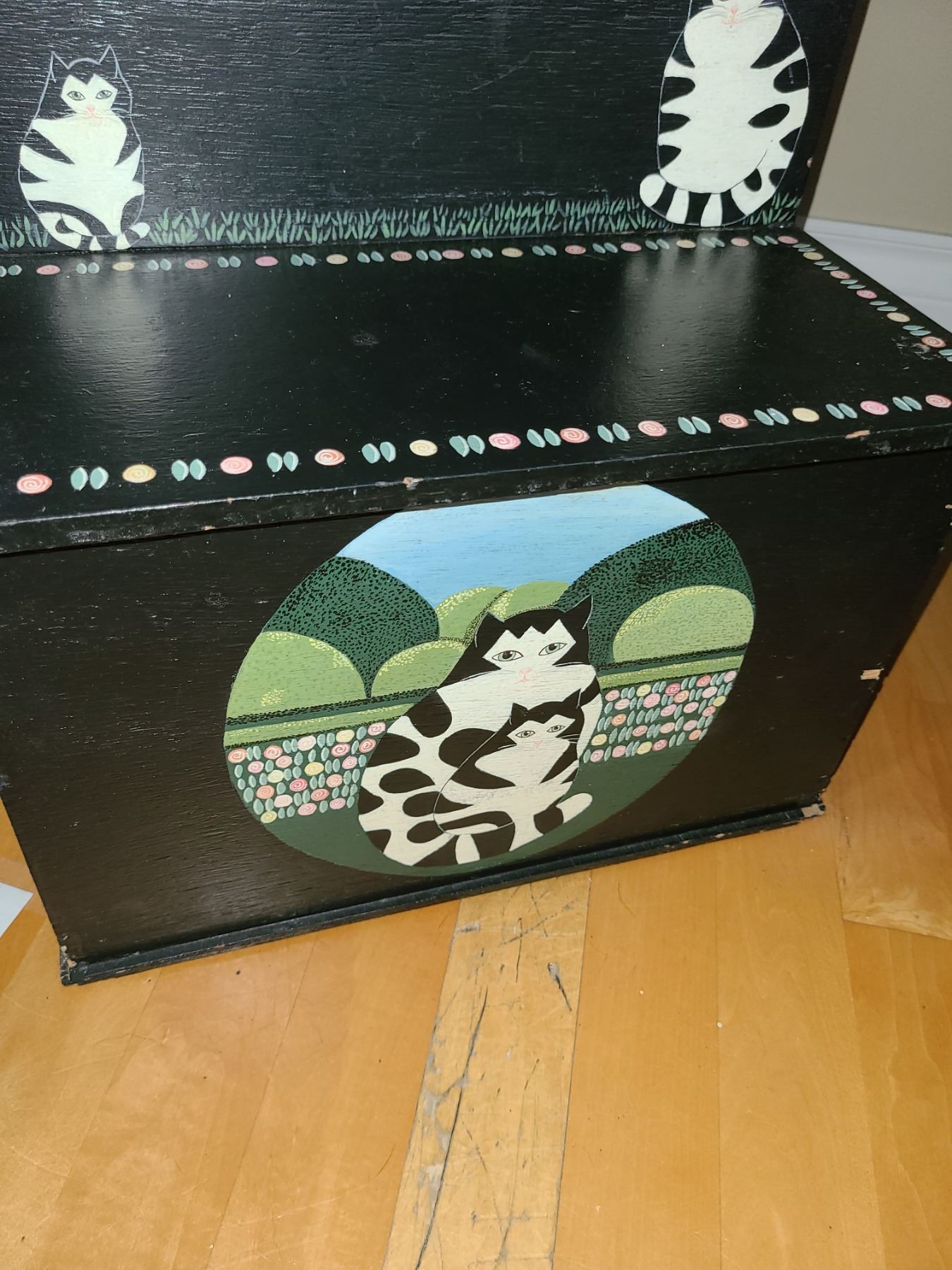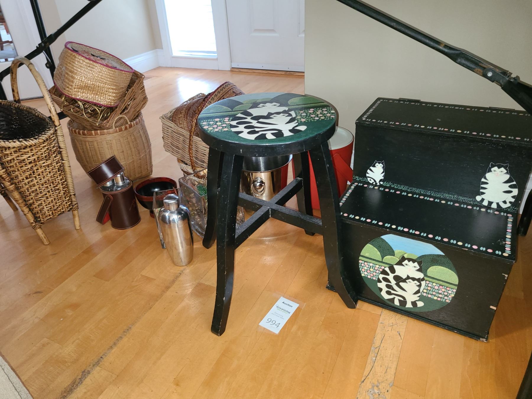 Painted Black Stool with painting of a kitty, Painted black storage box stepping stool, wicker baskets & more. Pickup at 9 am