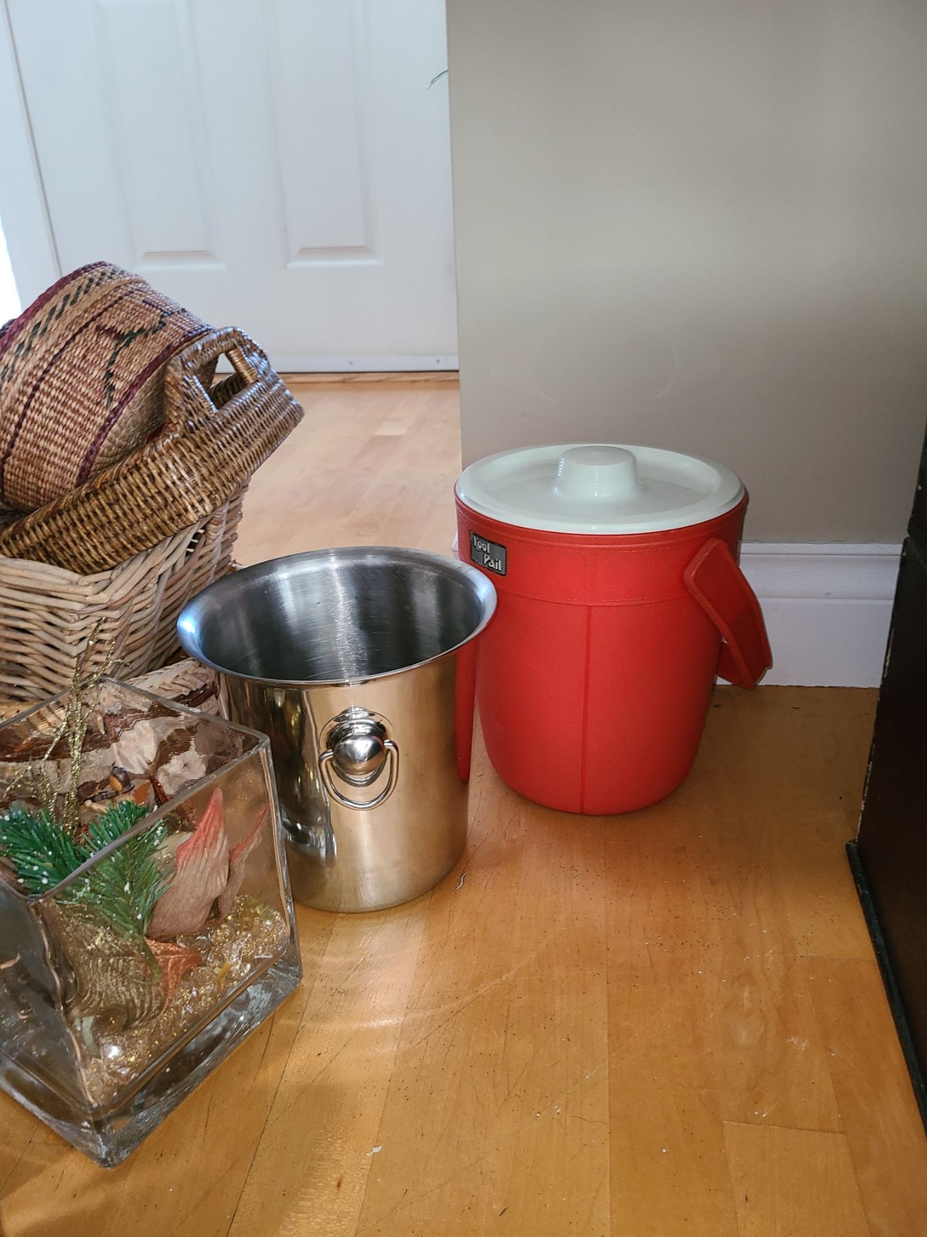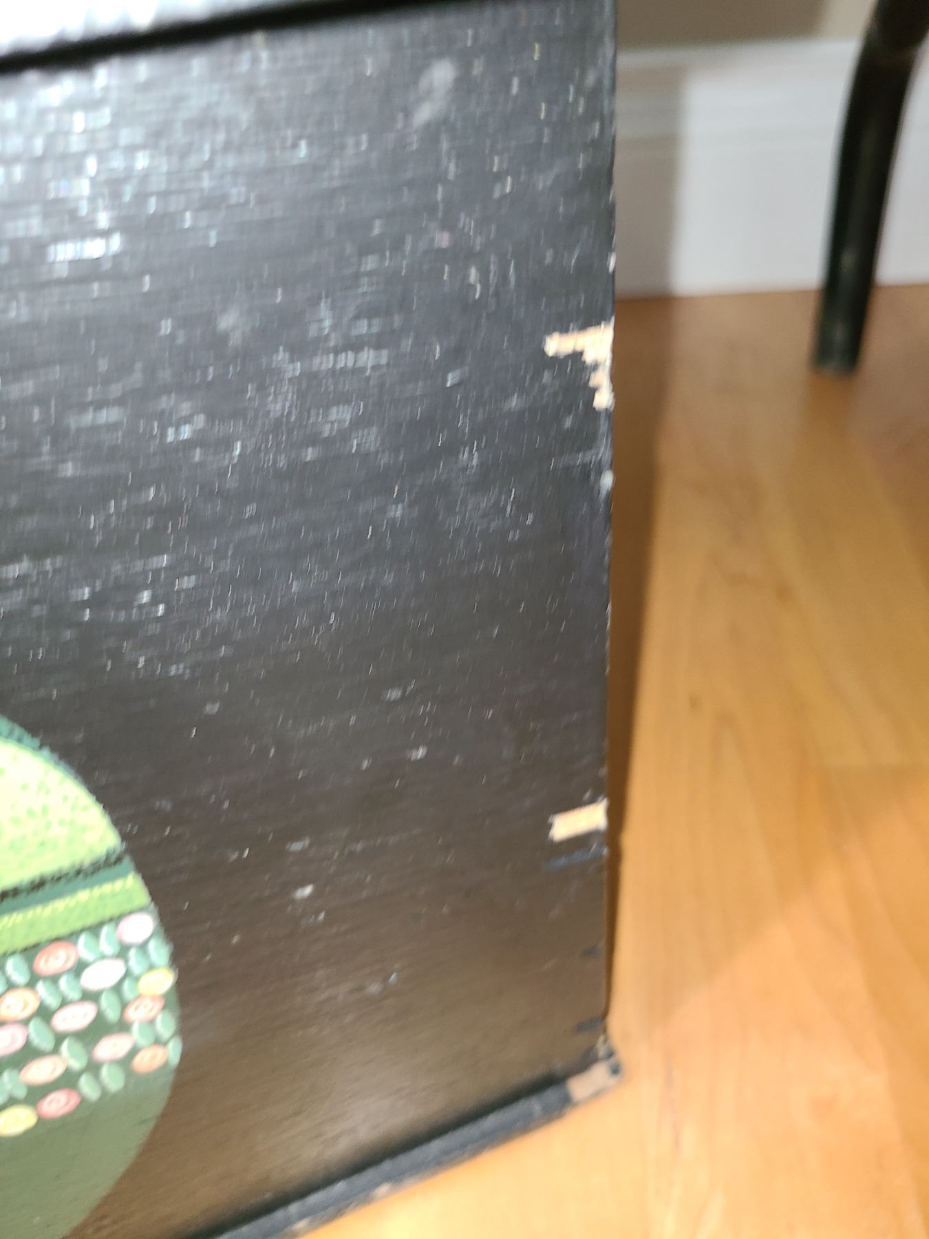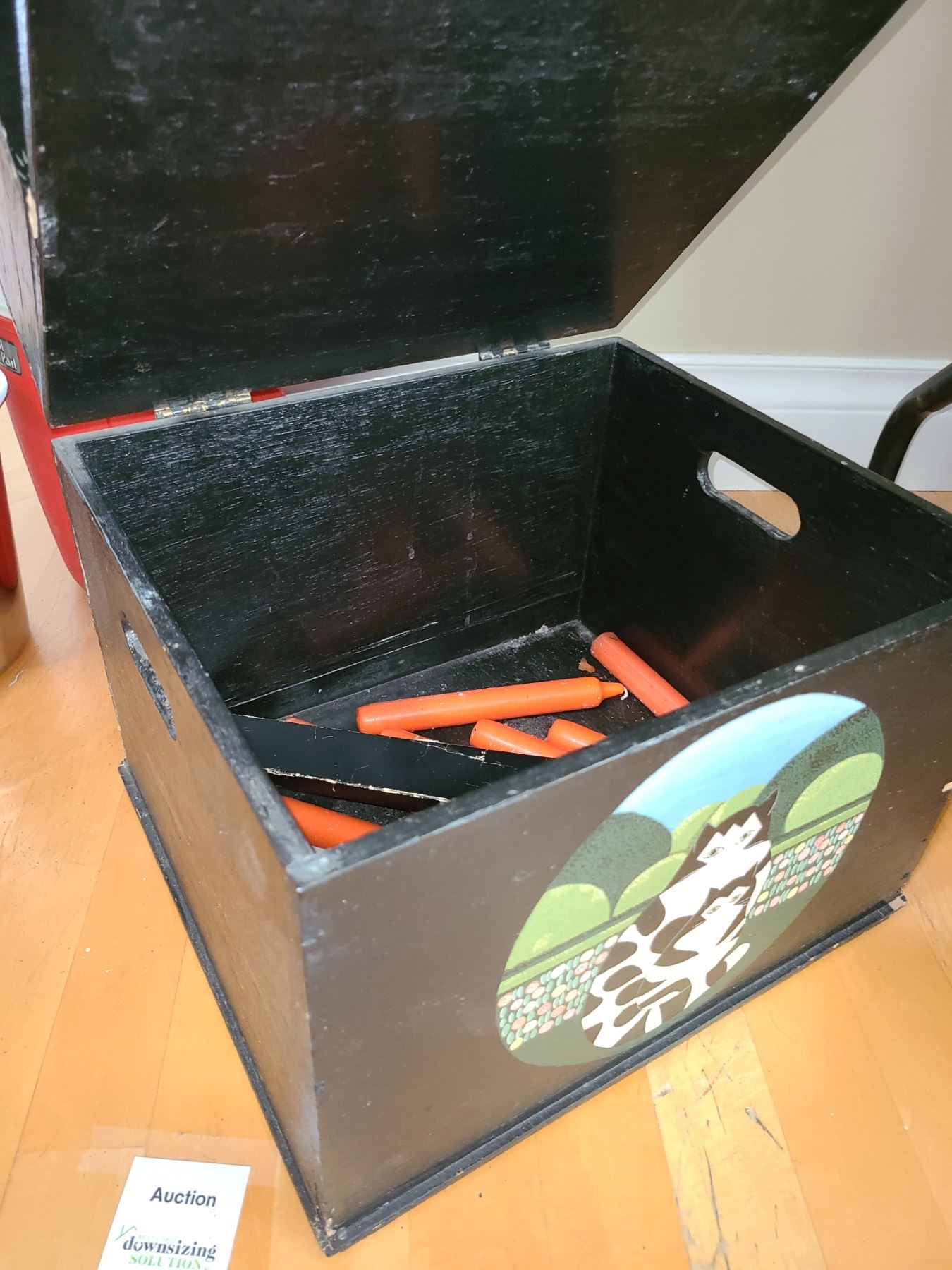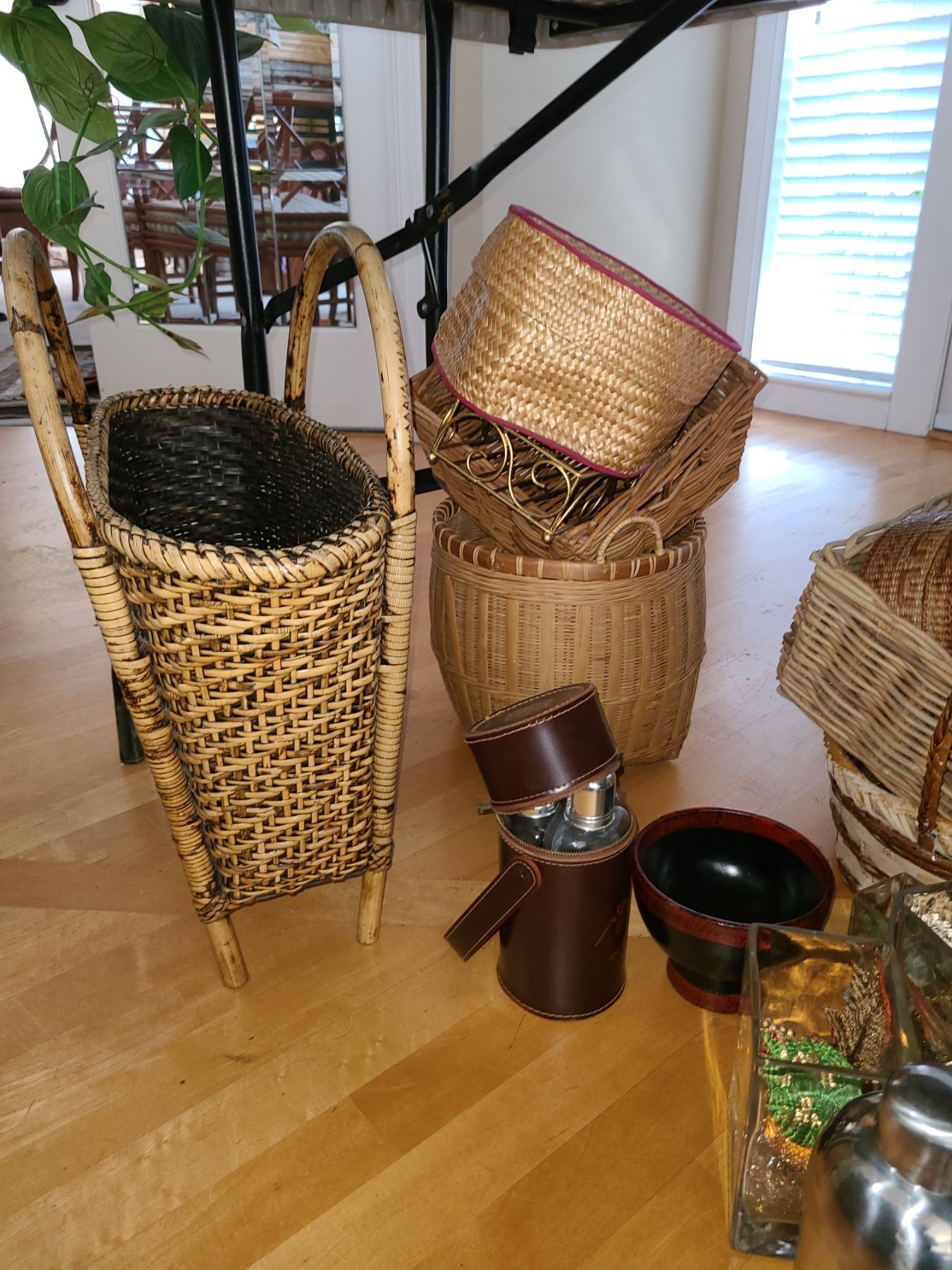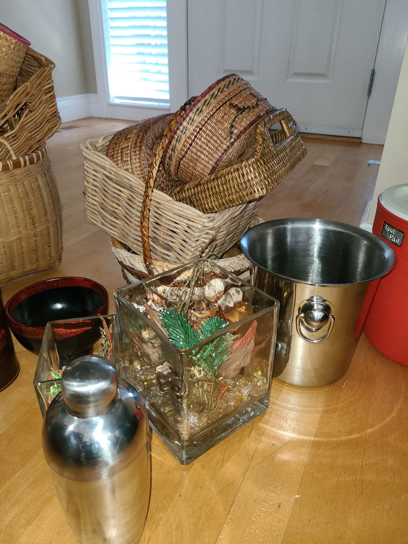 Painted Black Stool with painting of a kitty, Painted black storage box stepping stool, wicker baskets & more. Pickup at 9 am