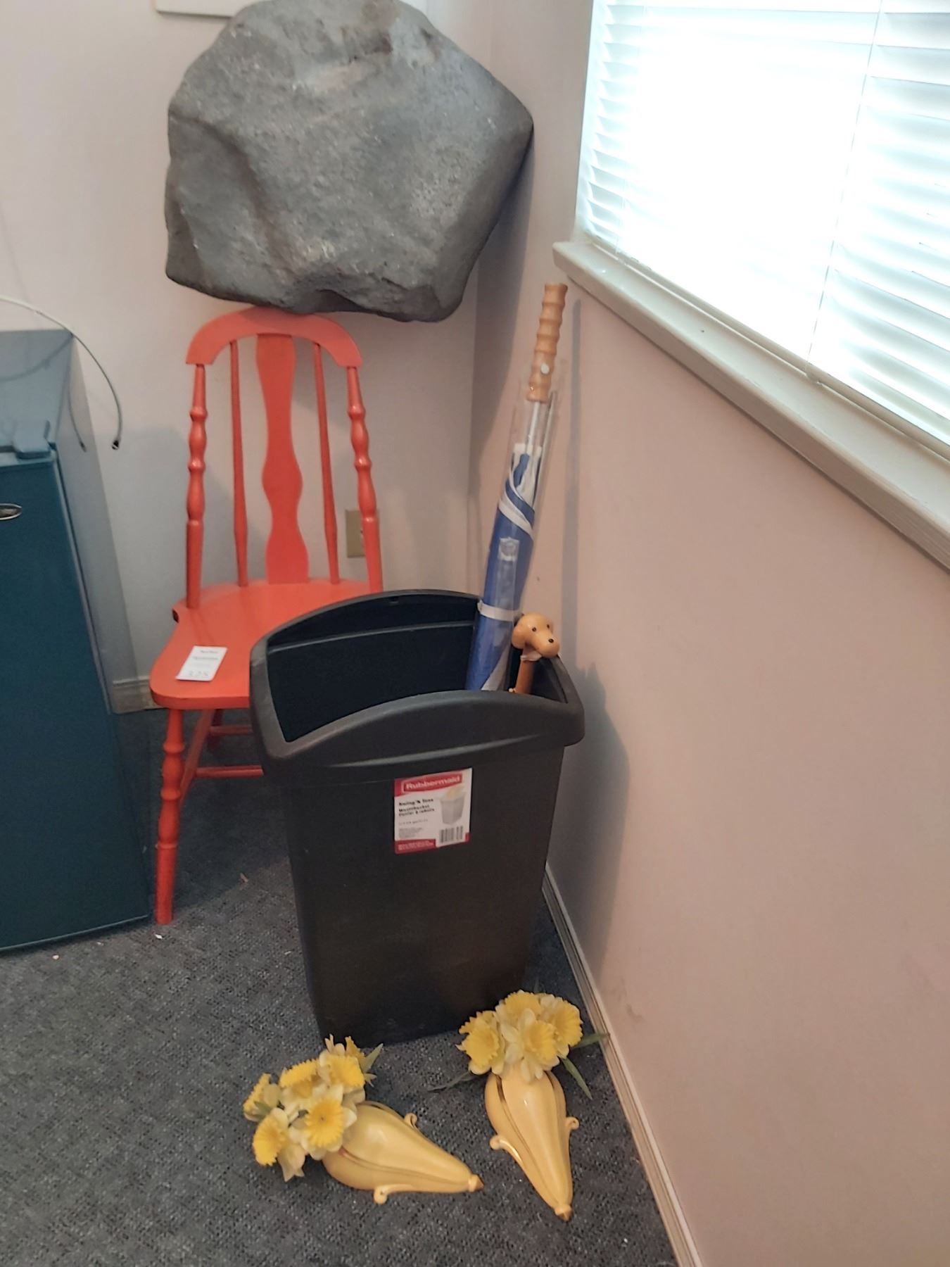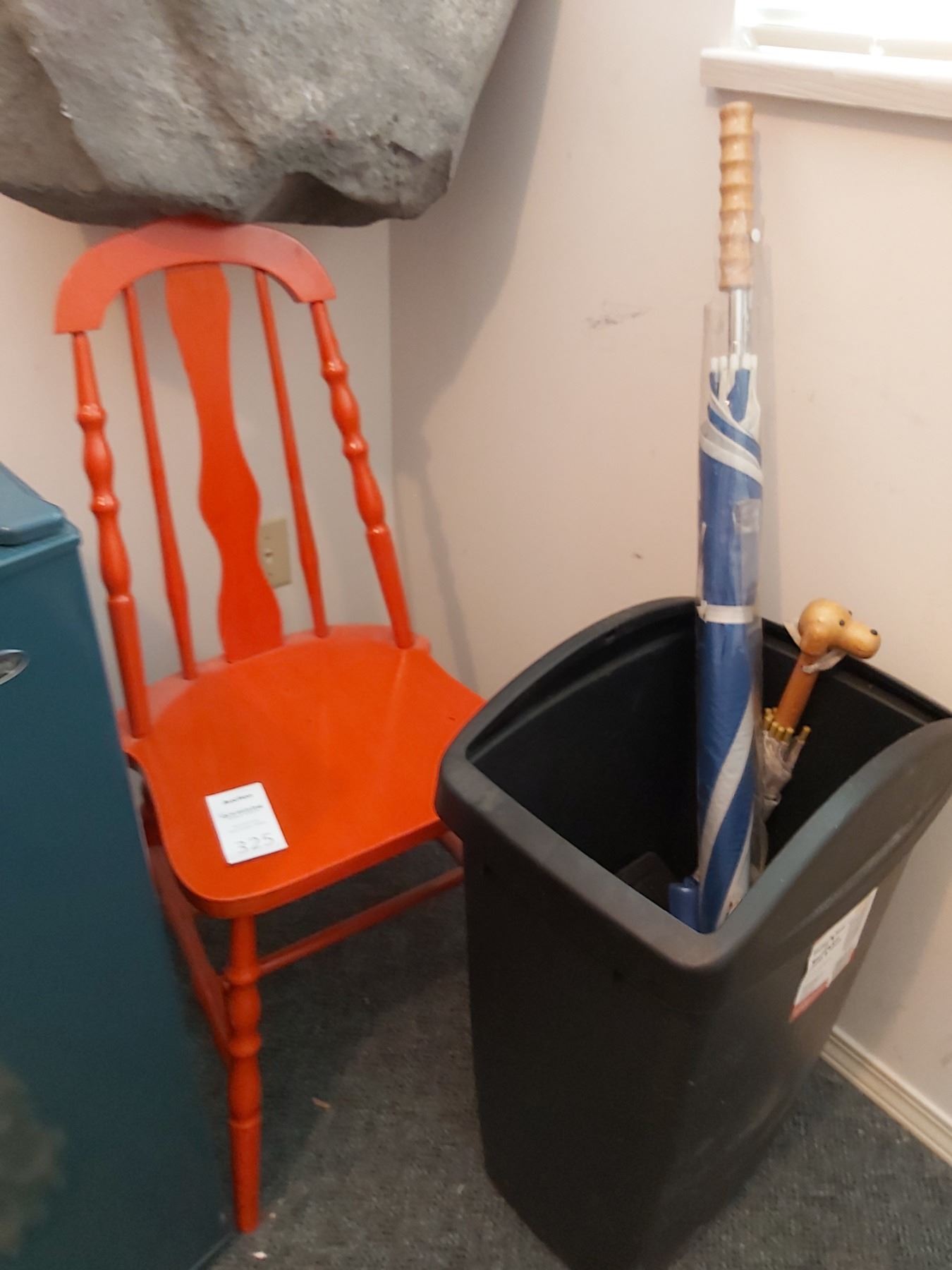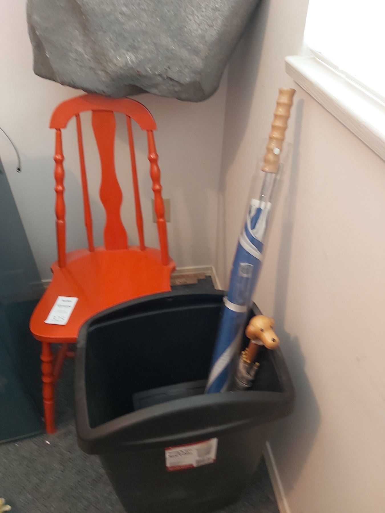 Lot includes wooden chair, garbage bin, umbrella, faux rock, and wall sconces. Pickup 9 am cat. A.