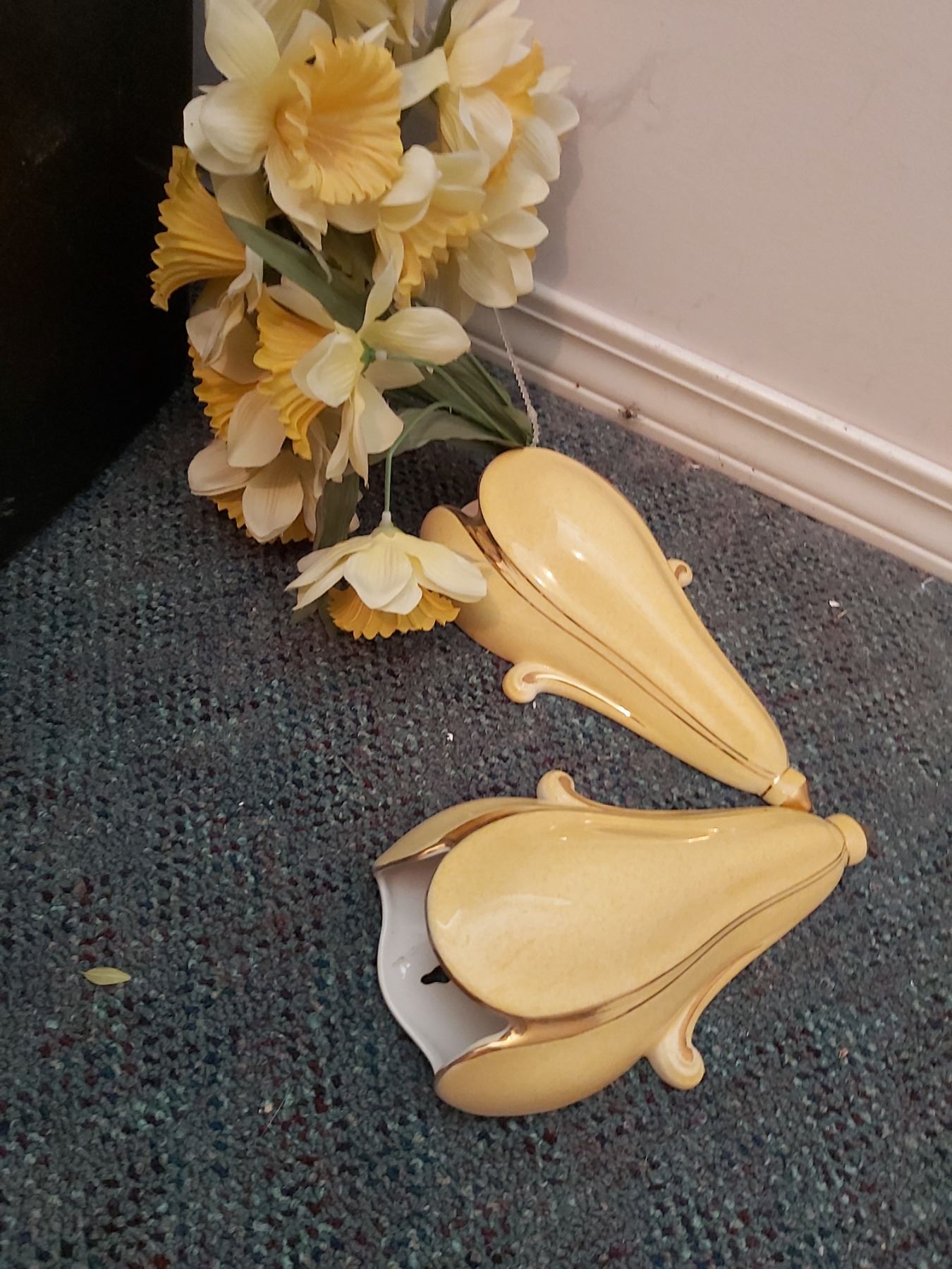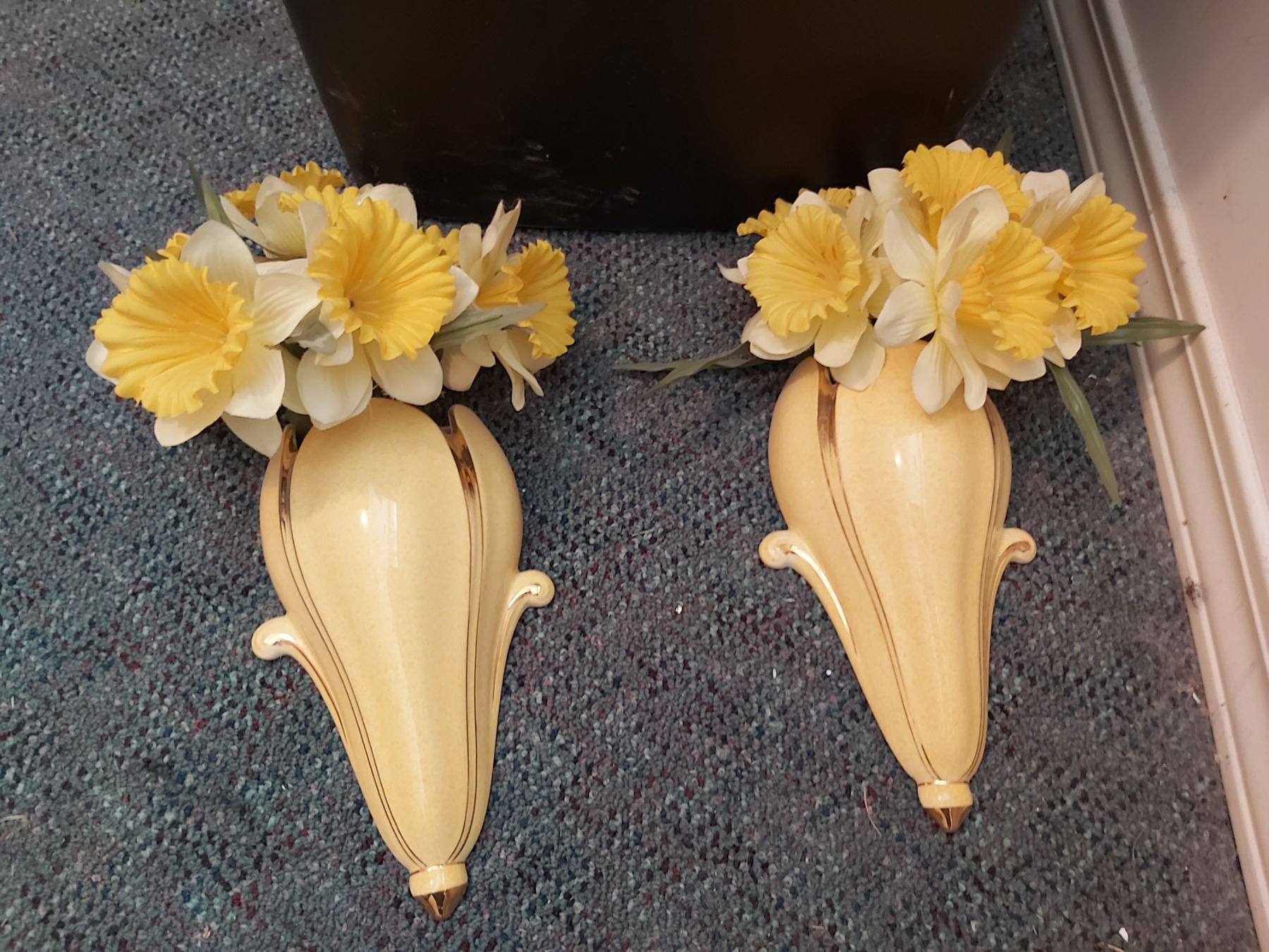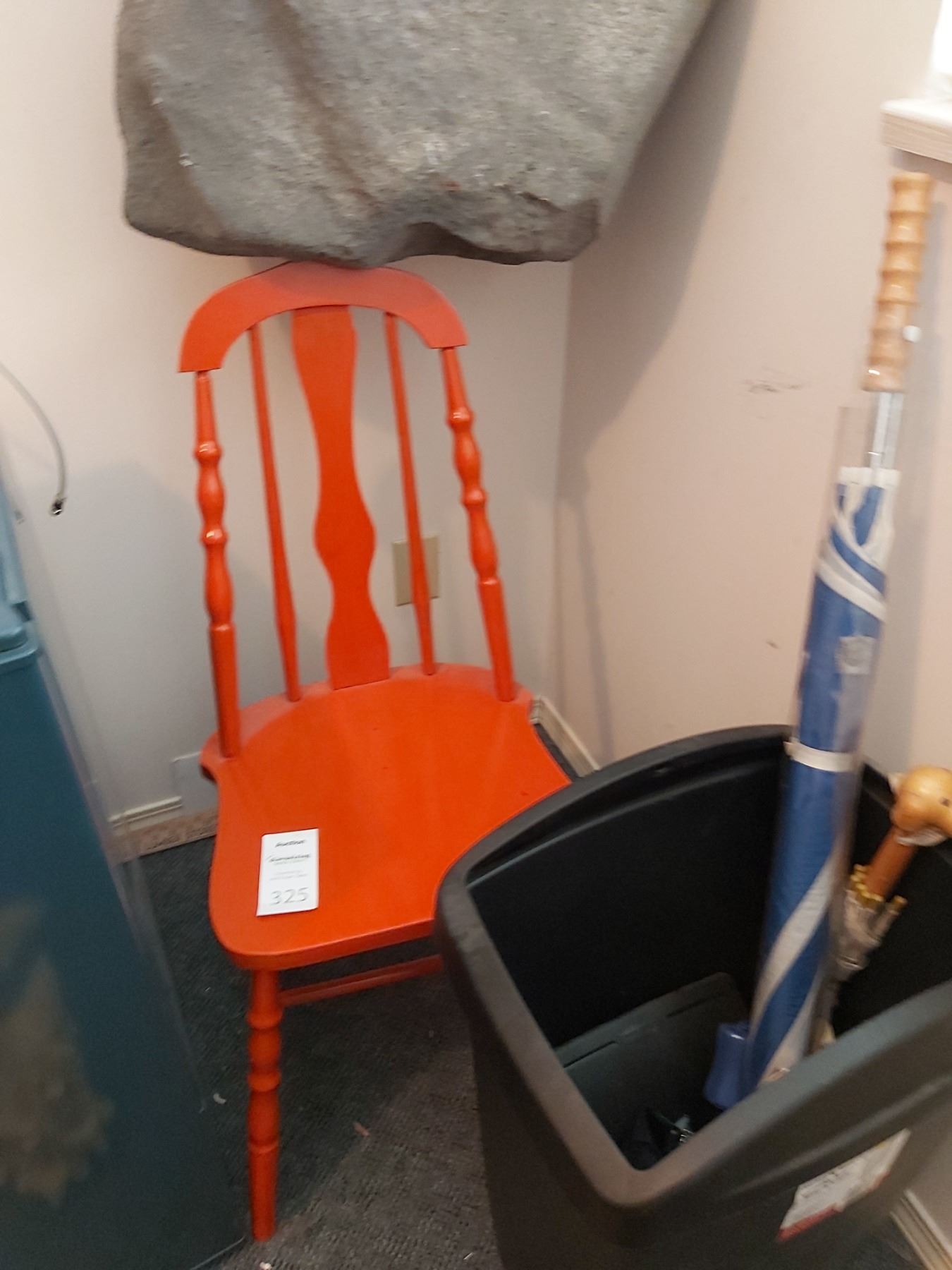 Lot includes wooden chair, garbage bin, umbrella, faux rock, and wall sconces. Pickup 9 am cat. A.