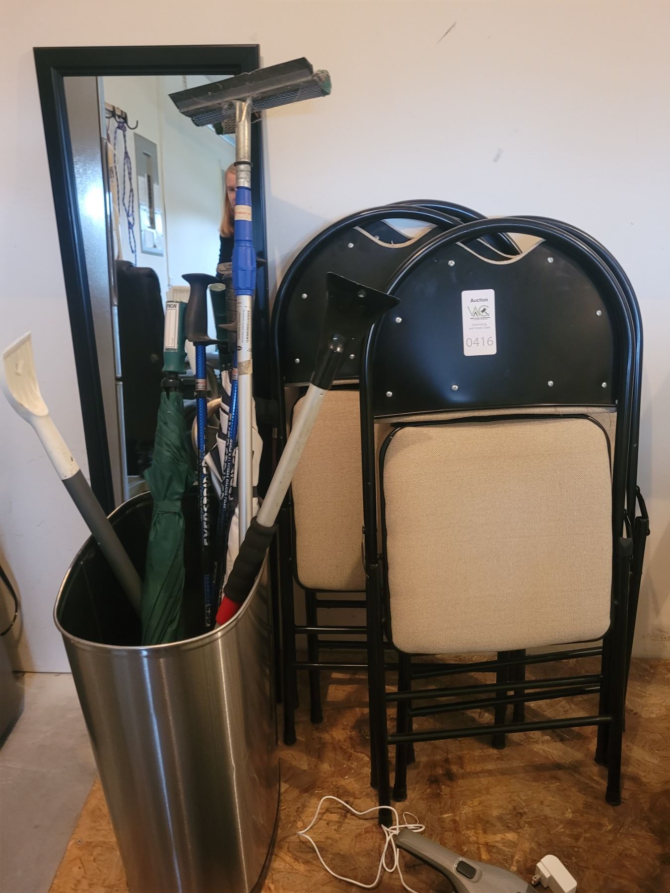 4 folding chairs. Framed mirror 48". Stainless umbrella stand and contents. Pickup at 9 am