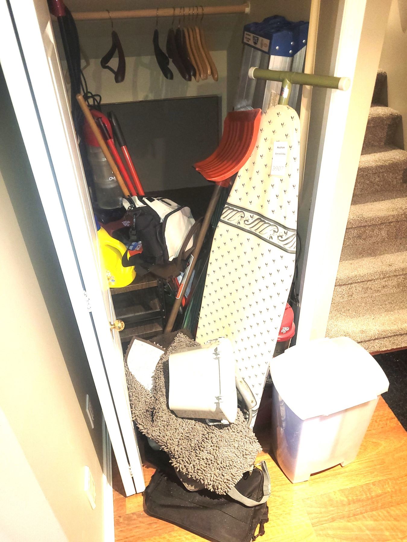 Dirt Devil vacuums untested, ironing board, metal shelving 30x12x30, brooms, mops, rugs and more. Pickup at 10 am