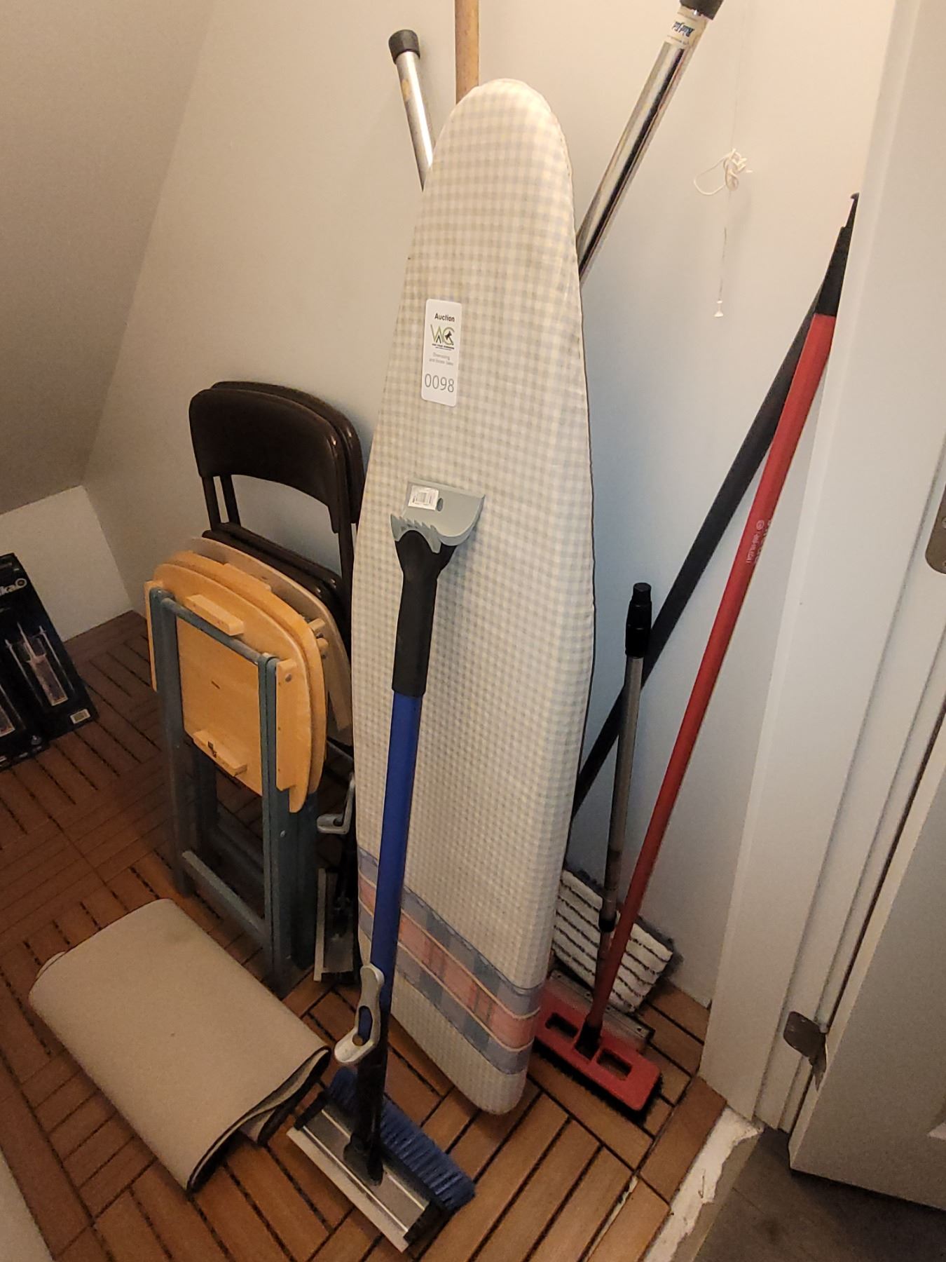 3 fold down tv type tables. 2 fold down chairs. Ironing board and brooms. Pickup at 10 am