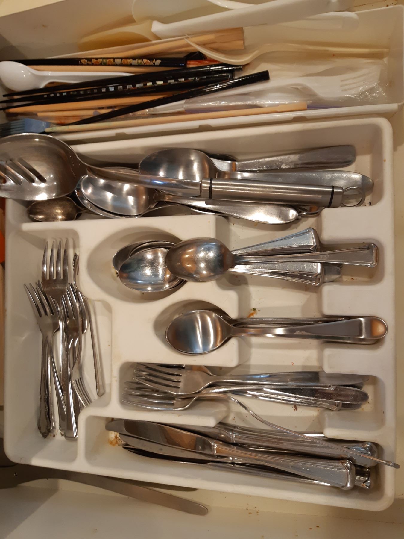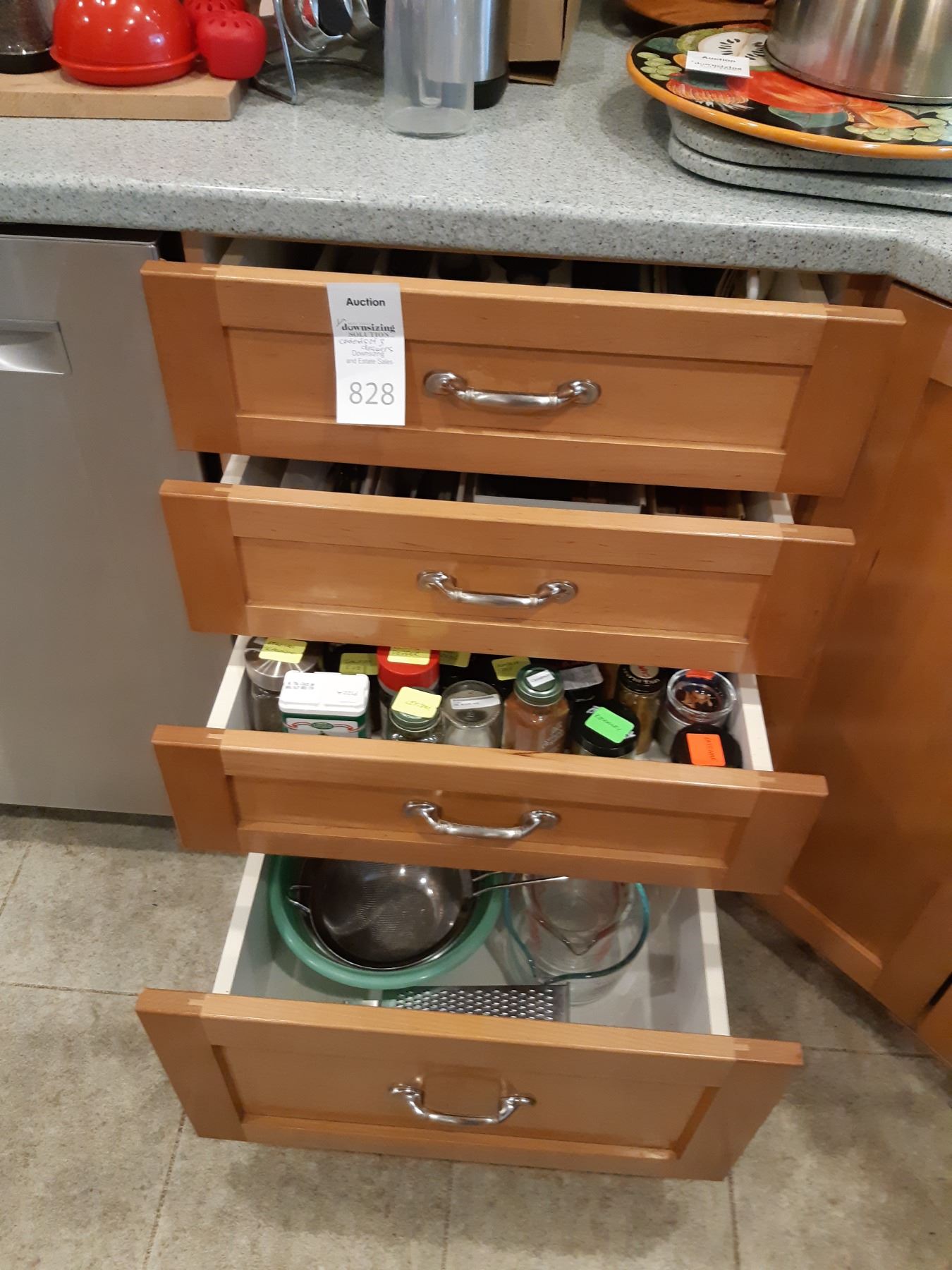 Contents of 3x drawers, set of mismatched Flatware, knives, wooden spoons, utensils and Pyrex measuring cups. Not drawer of spices shown in image not included. Pleas bing packing materials pick up at 9 am