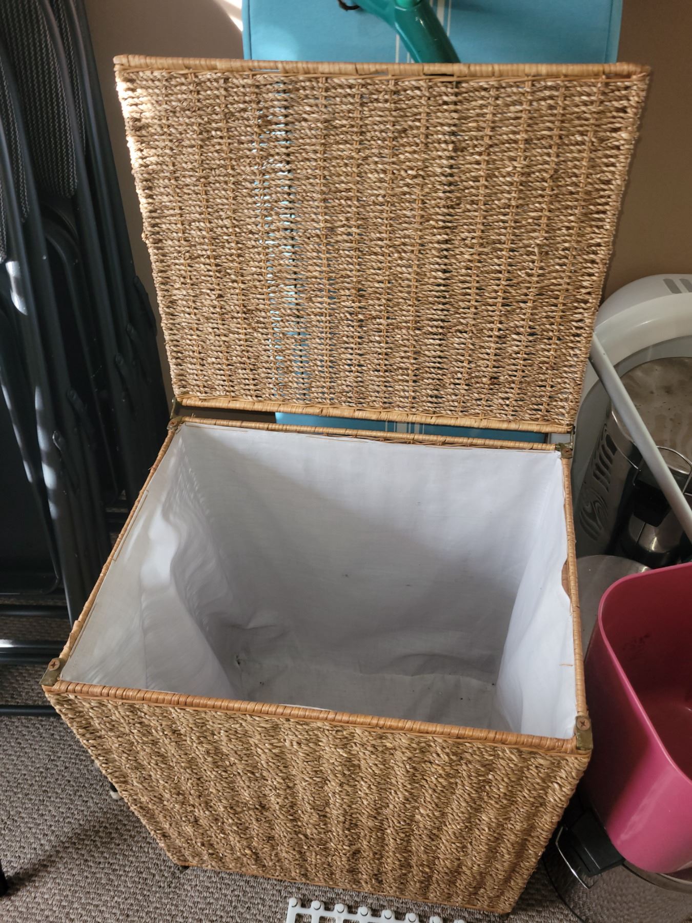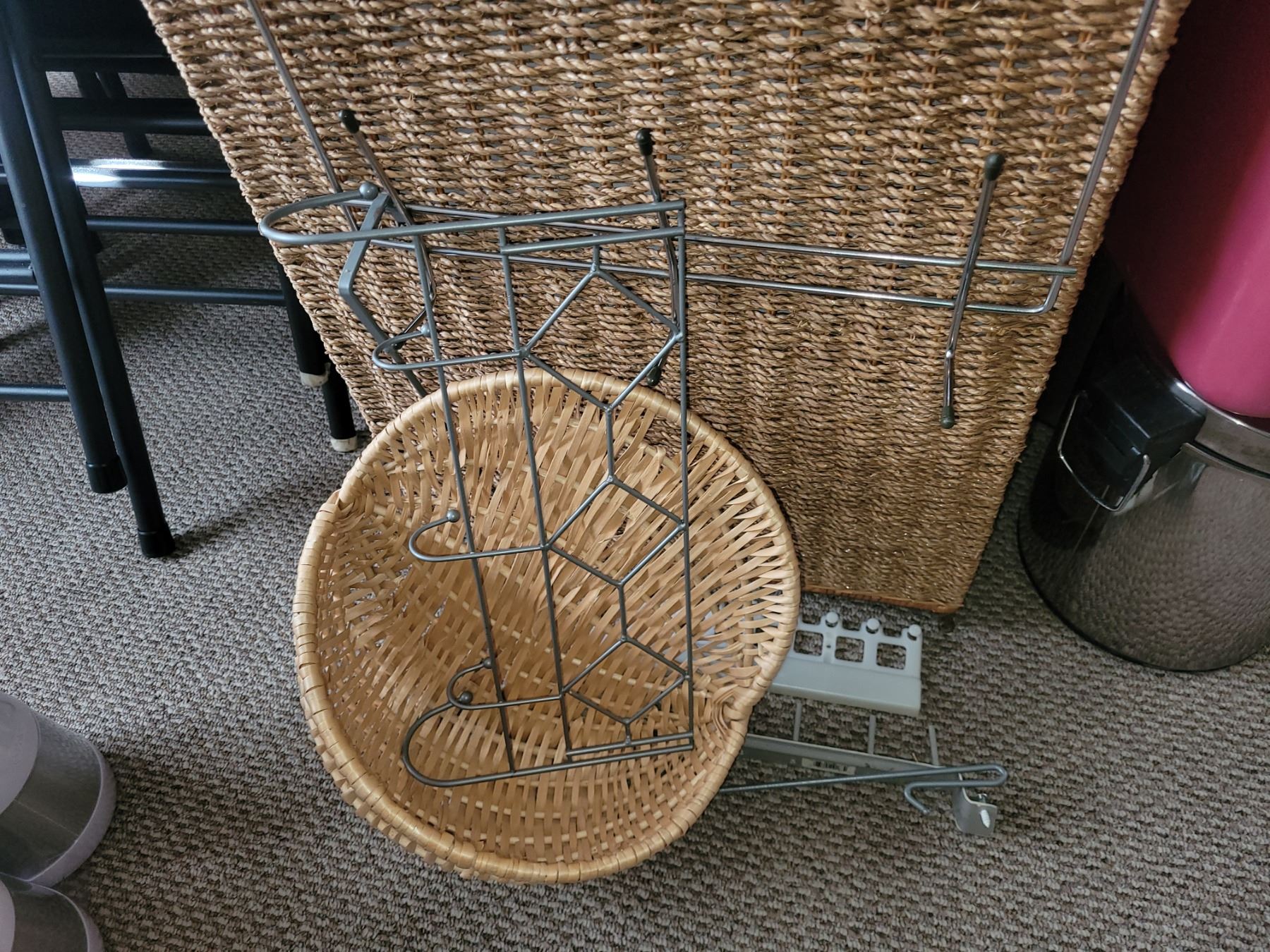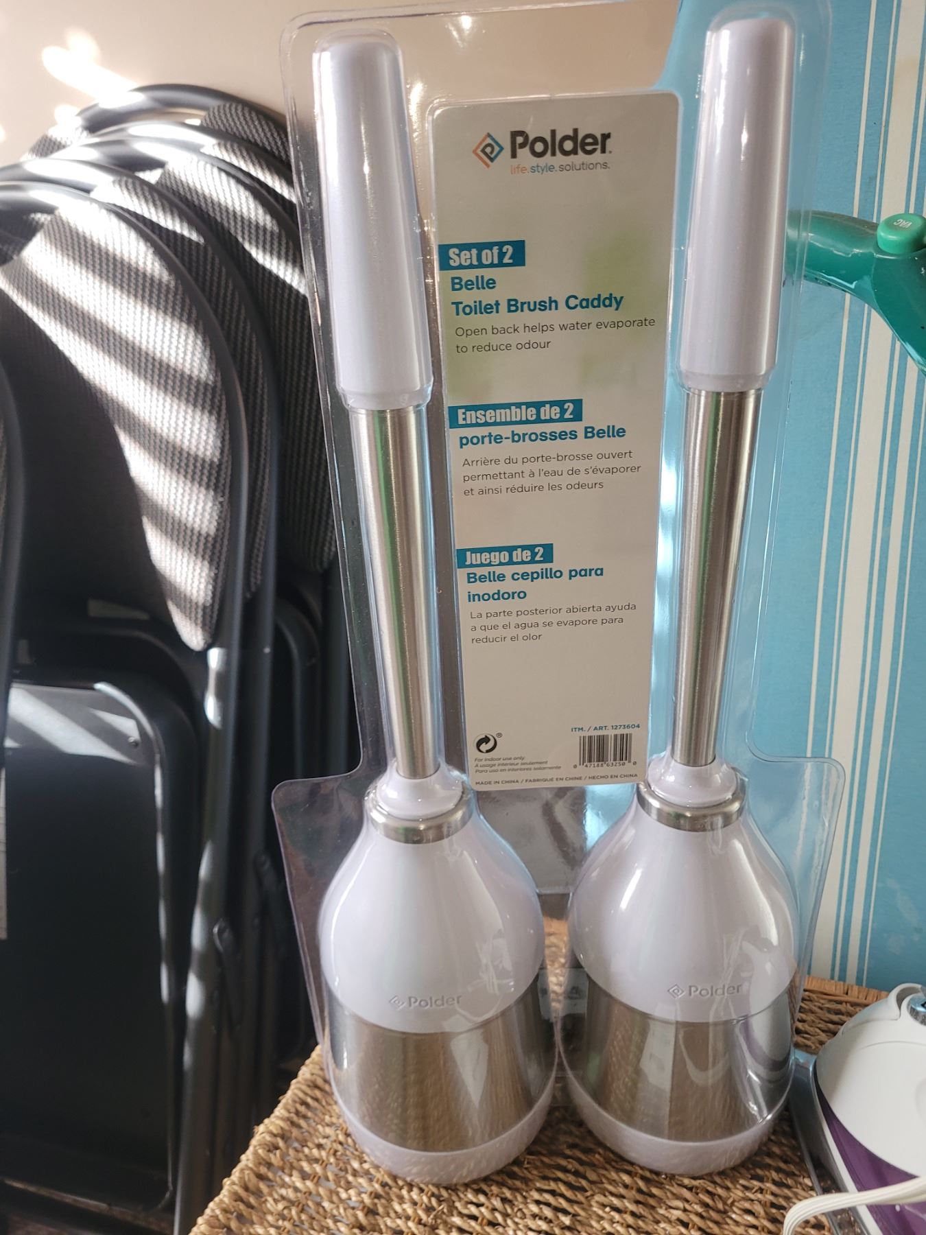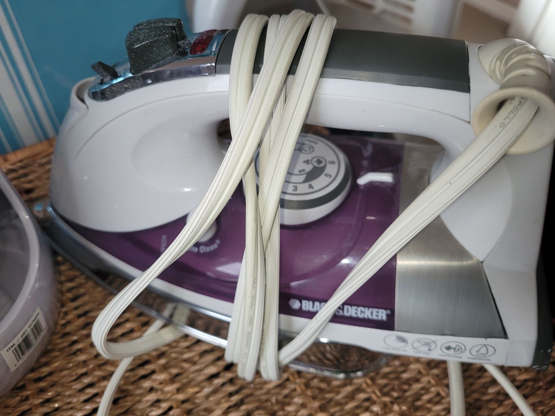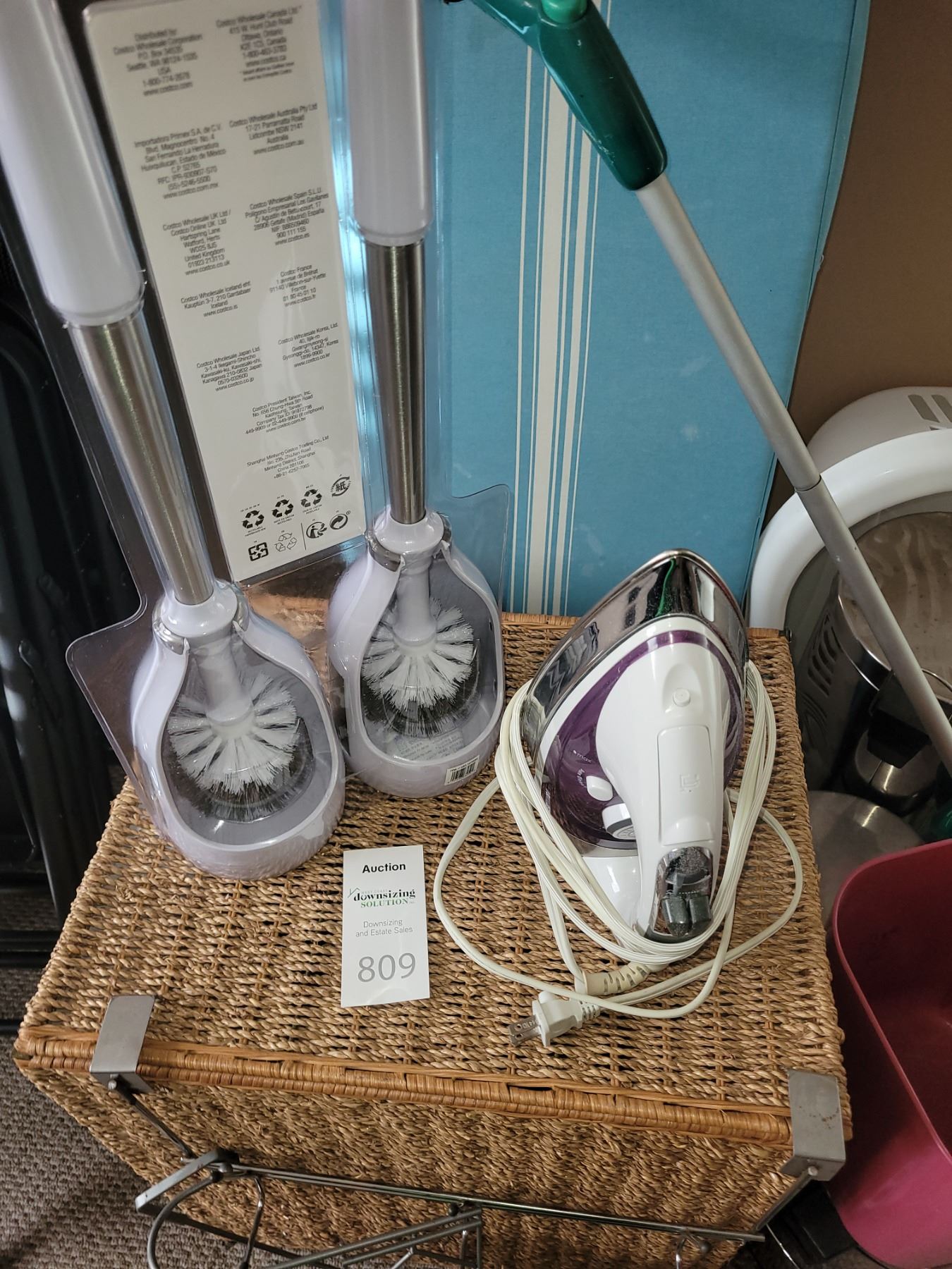 B&D iron, ironing board, wicker type laundry hamper, new toilet brushes and more. Bring packing Pick up at 9am.