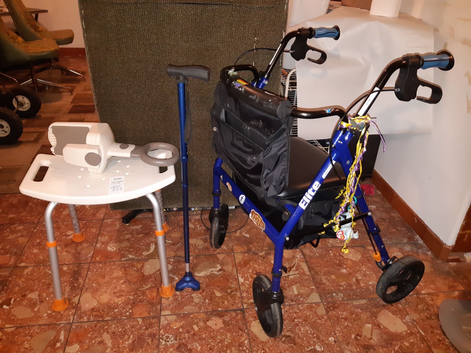 Walker, Homecare clamp, walking stick and shower stool. Pickup at 10 am
